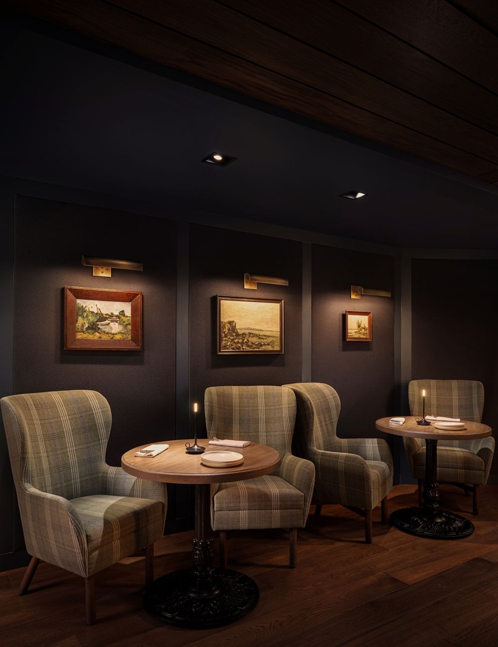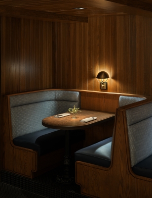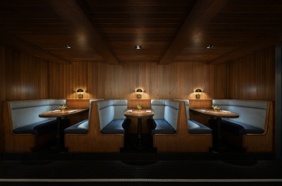 This design extends to Bentwood Tavern which buzzes to life in the evenings. Our lighting design enhances intimacy, with downlights softly spotlighting tables along curved banquettes. Integrated lamps at the bar and on shelving add a warm, inviting glow, ensuring guests feel at home.