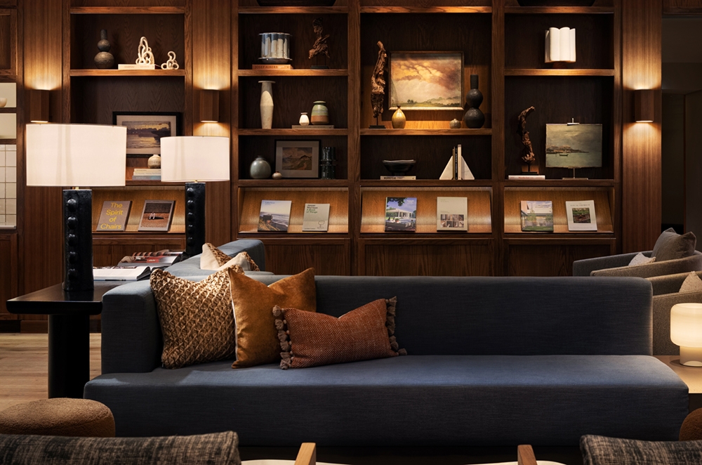 Guests enter a multifunctional lobby that serves as a café by day and a lively social scene by night. Evoking old-world charm with dark wood paneling and floor-to-ceiling bookshelves, it showcases local art and photography. Strategic lighting, including adjustable downlights and integrated LED tapes, creates a gentle glow that invites exploration.