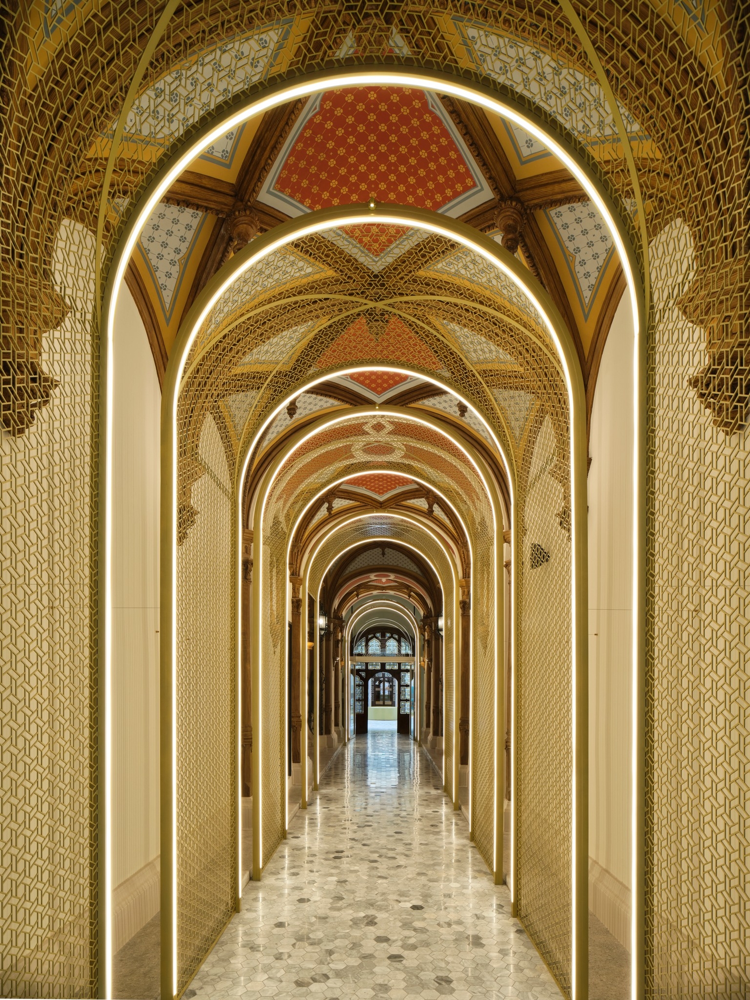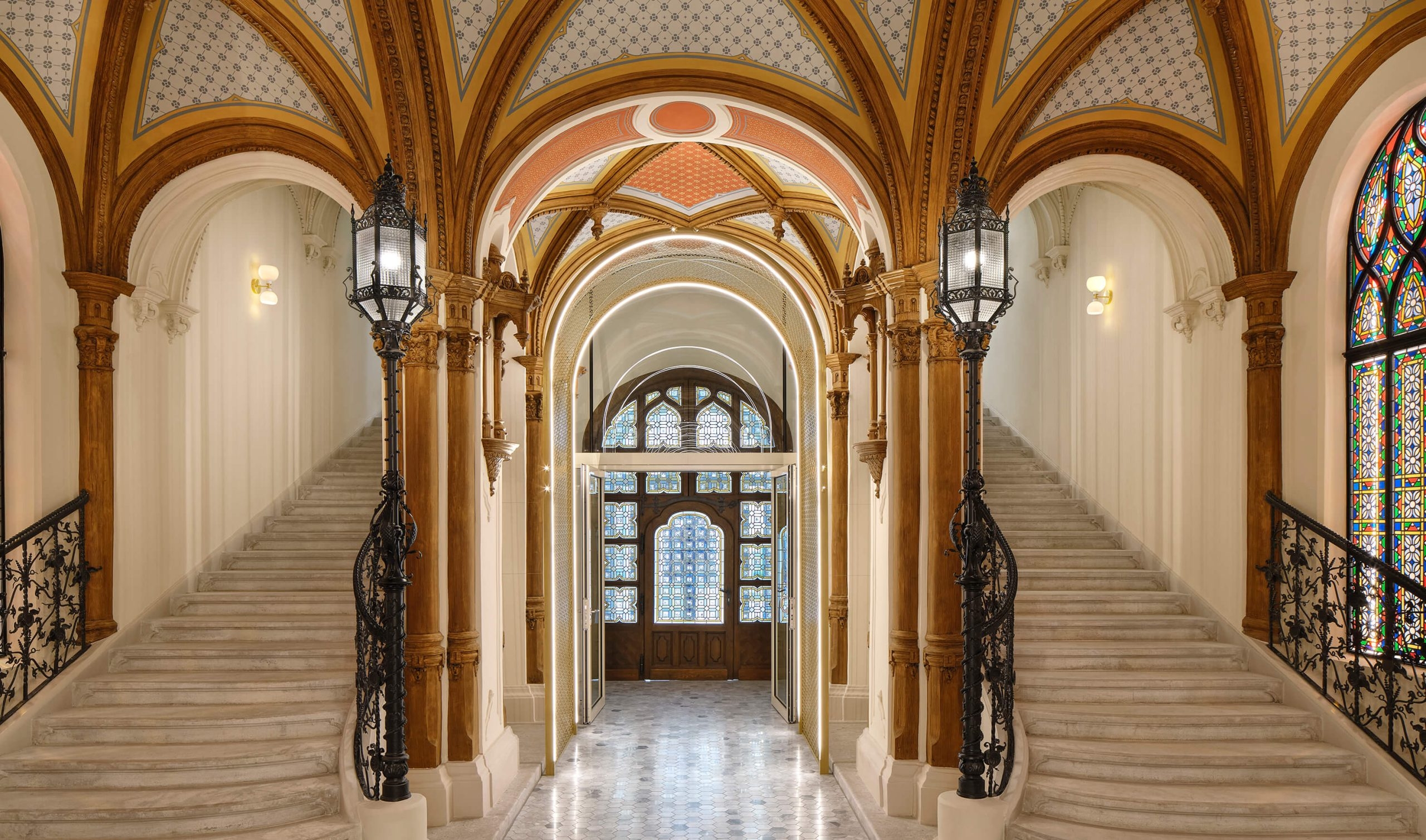 The lighting design concept enhances the classical through the new intervention, respecting the place while adding freshness through state-of-the-art integrated LED lighting. Set like jewelry in precious metal, the lighting is not meant to dominate but subtly illuminates spaces with high-quality comfort levels, providing a duality of perception between the architectural legacy and the new proposal, establishing a bold and unique hotel identity.