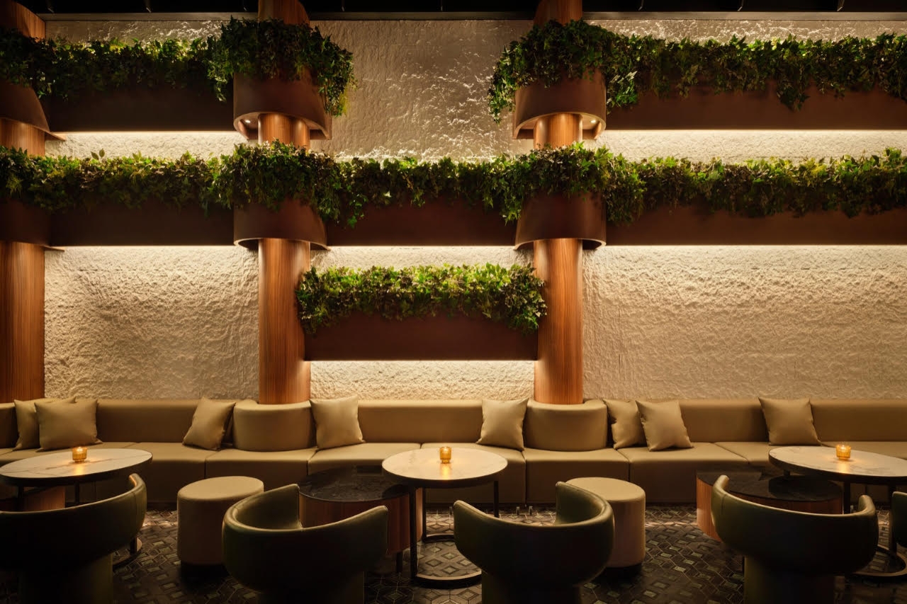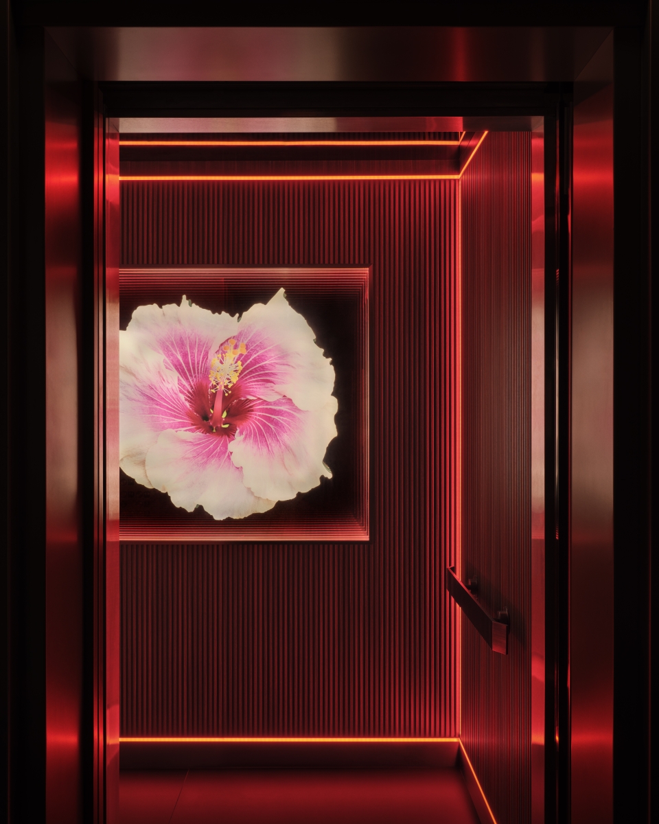 An immersive elevator journey with a Hibiscus flower installation and infinity mirror leads to the second floor. Ambient lighting runs along banquette seating, with track lights providing focused illumination. A brass Hibiscus flower feature is highlighted with zoomable spotlights.