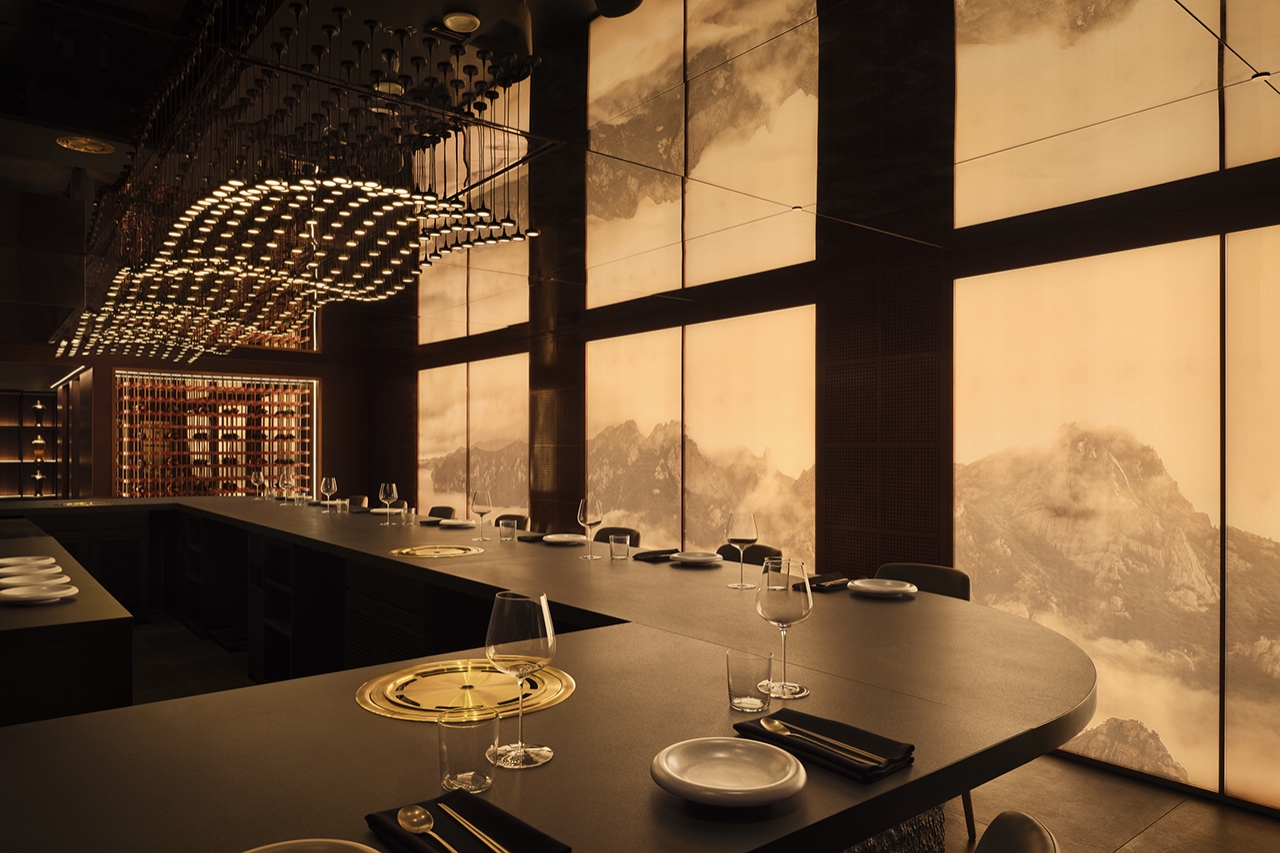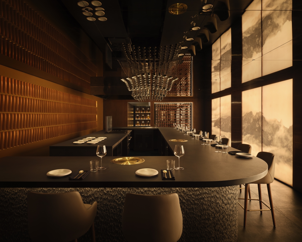 The Omakase bar invites diners into a Korean landscape with a blend of rustic and delicate materials. Translucent rice paper panels featuring oriental mountainscapes are softly illuminated by grazers. A chiseled stone bar’s textures are enhanced by integrated fixtures, while a wave-inspired lighting centerpiece with dimmable LEDs adds movement.
