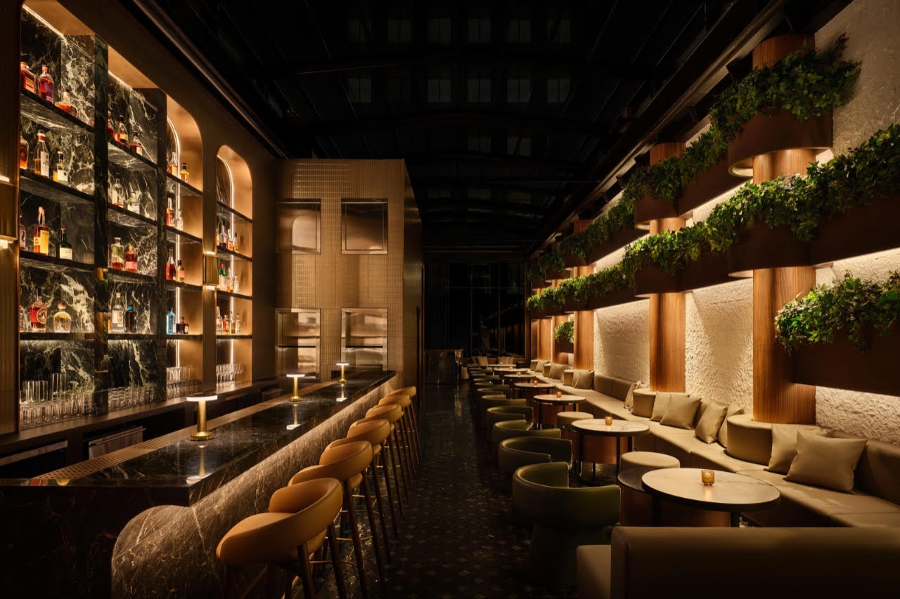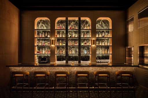 The third-floor bar, offering a view of the Empire State Building, exudes luxury with its marble and brass elements. Warm LEDs and side-mounted spotlights provide illumination, adapting to the retractable ceiling. The design subtly enhances details, ensuring a sophisticated yet comfortable visual experience for diners.