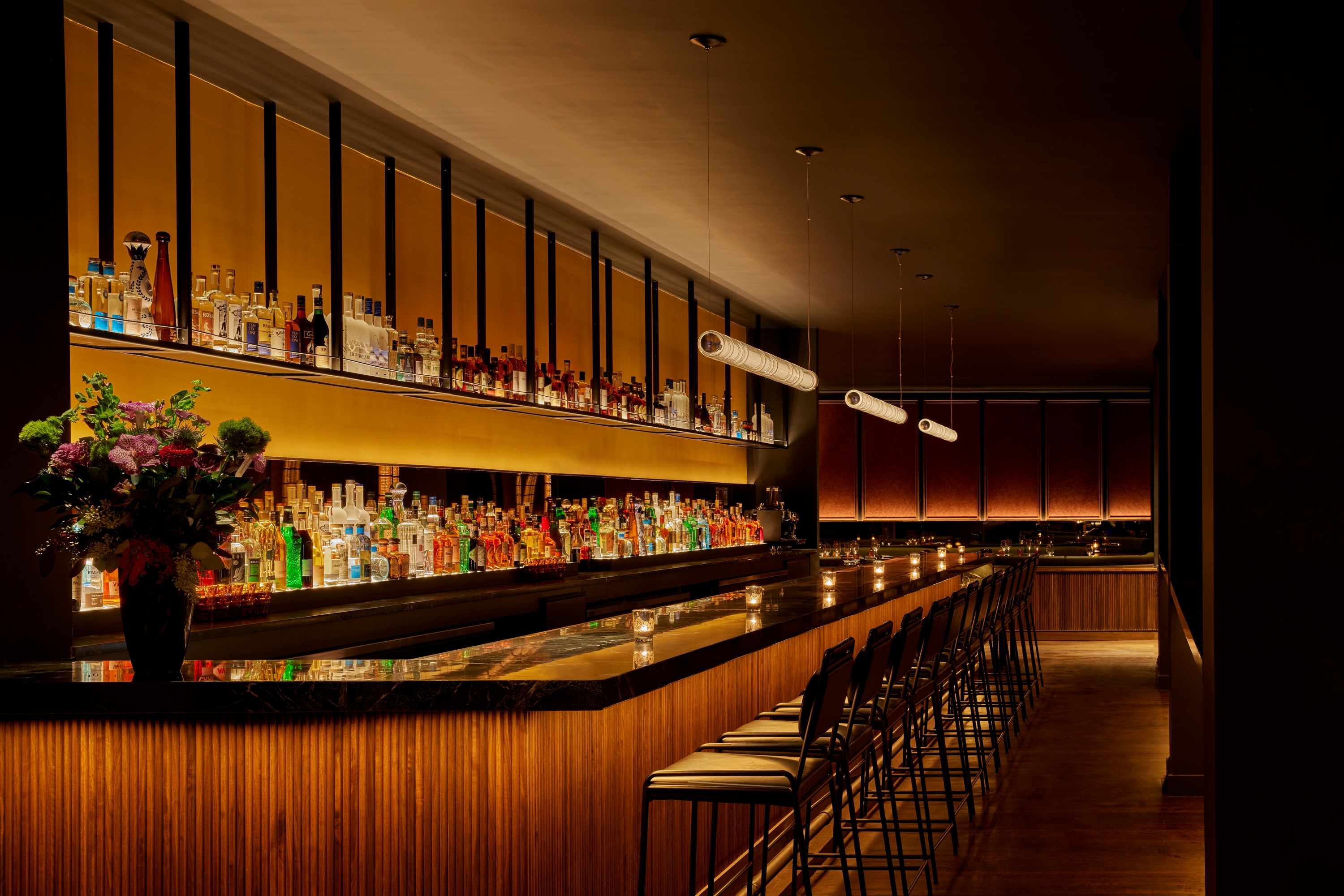 The flow of the dining room is accentuated by a series of illuminated “ghost” arches crafted from cast glass and bronze metal, providing a unique architectural touch. Theater lights positioned along the banquettes add further intrigue, while a mirrored wall at the room’s end creates a captivating infinity effect.