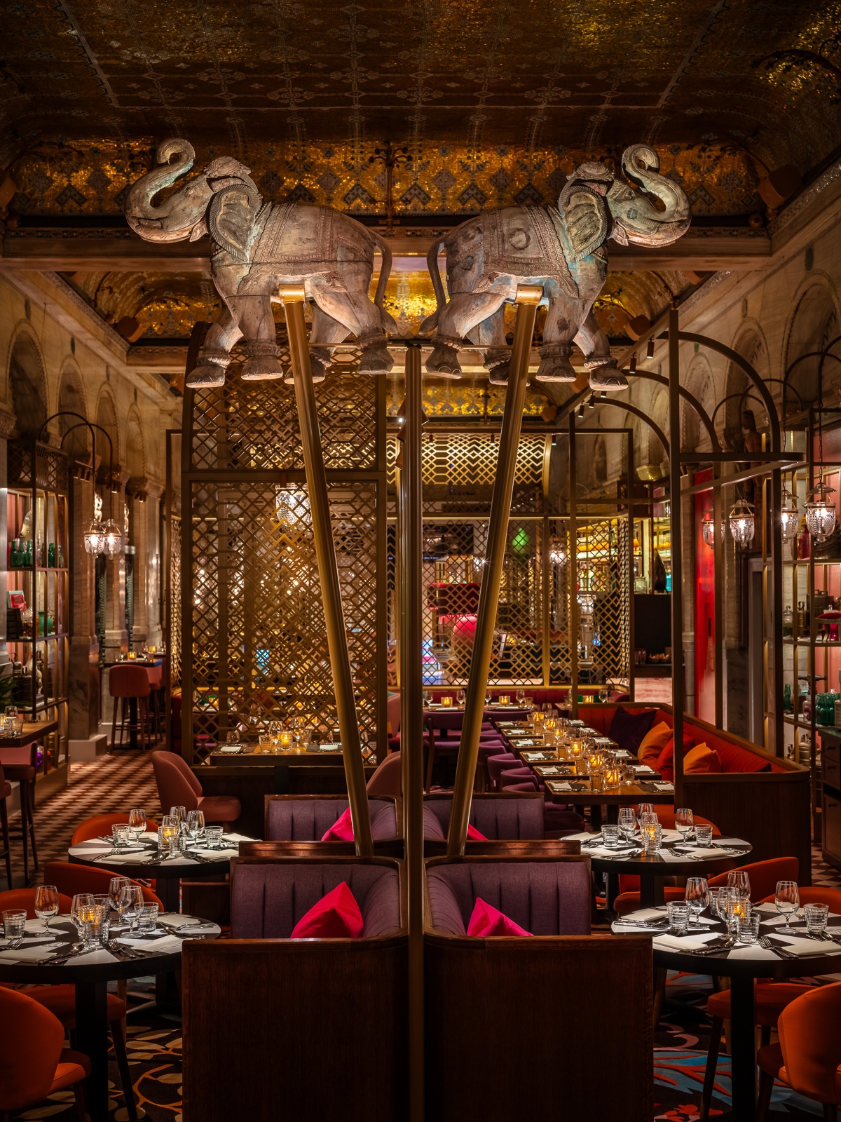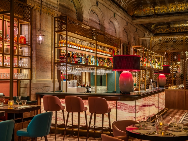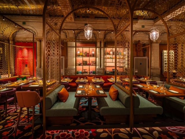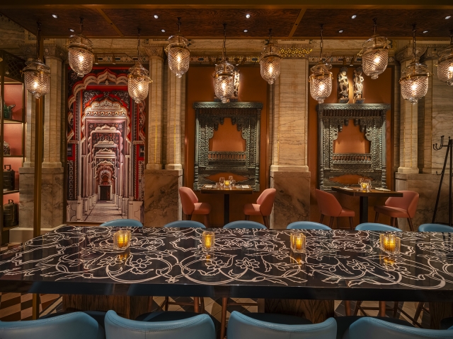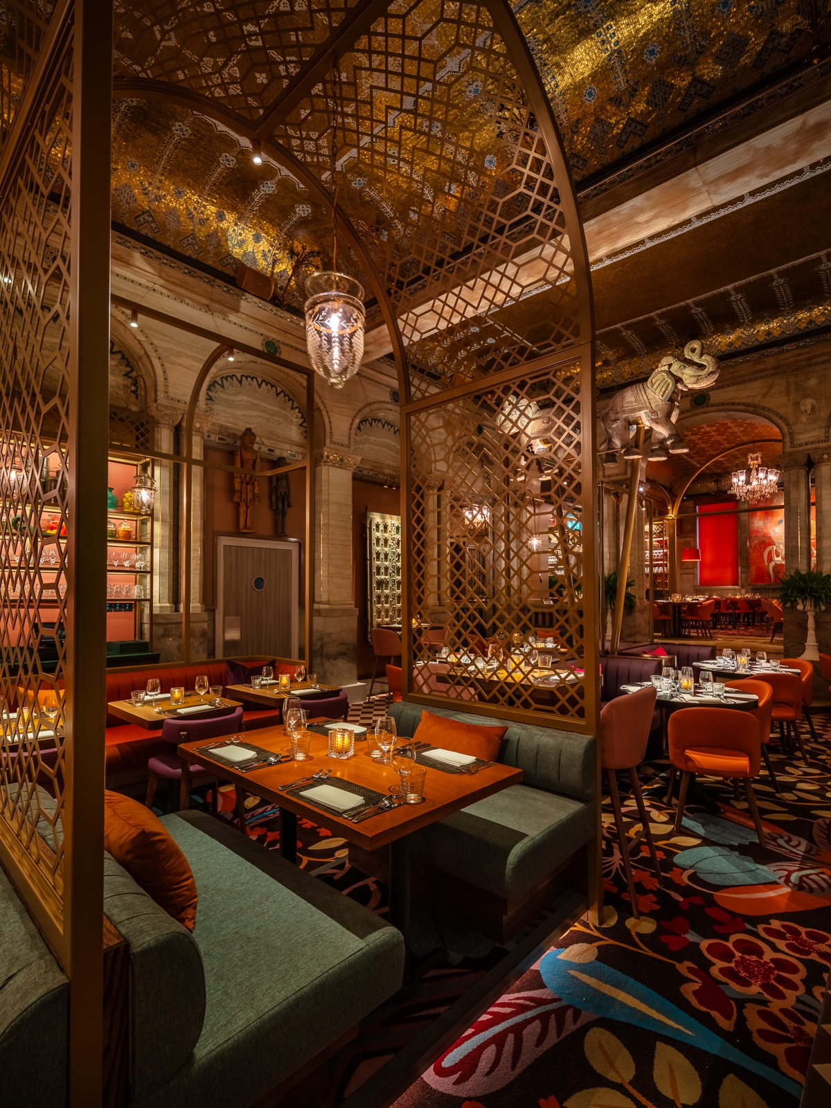 Entry DescriptionThe concept was to create a Maharaja’s Palace with multiple layers of decoration within this well-known Grade ll listed London dining room dating from 1874.