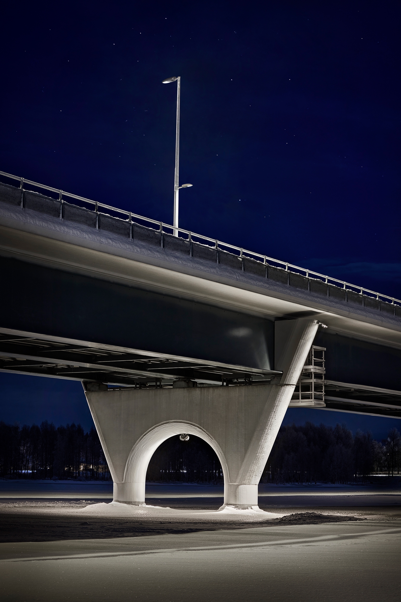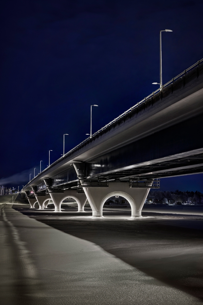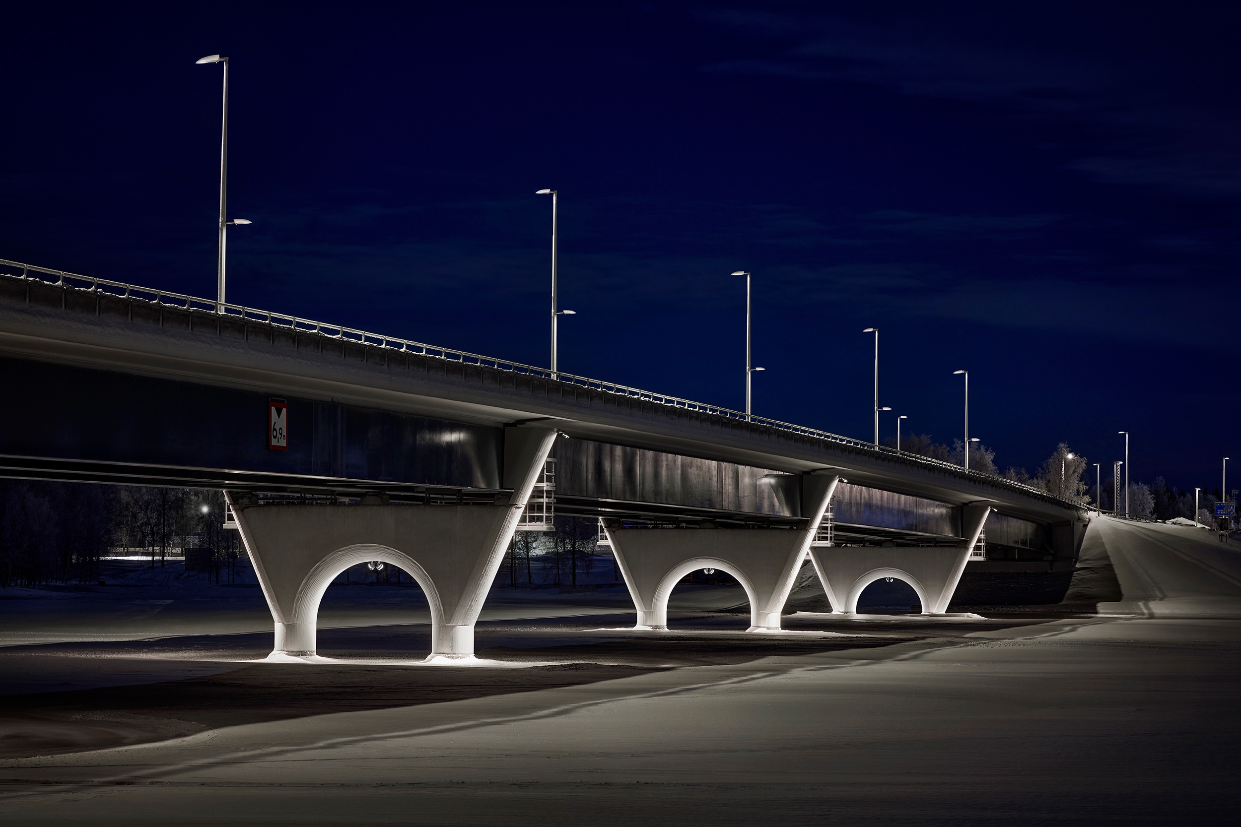 The collaboration of lighting designers, architects and engineers at Sweco has been a key factor for success leading to fulfillment of both aesthetic and technical requirements. A series of arches are illuminated with accents of cool light to create a landmark that draws attention to the magic of the river landscape and the historical buildings on its banks. The lighting design and the high contrast enhances the structure of the bridge during the long dark hours in the winter.