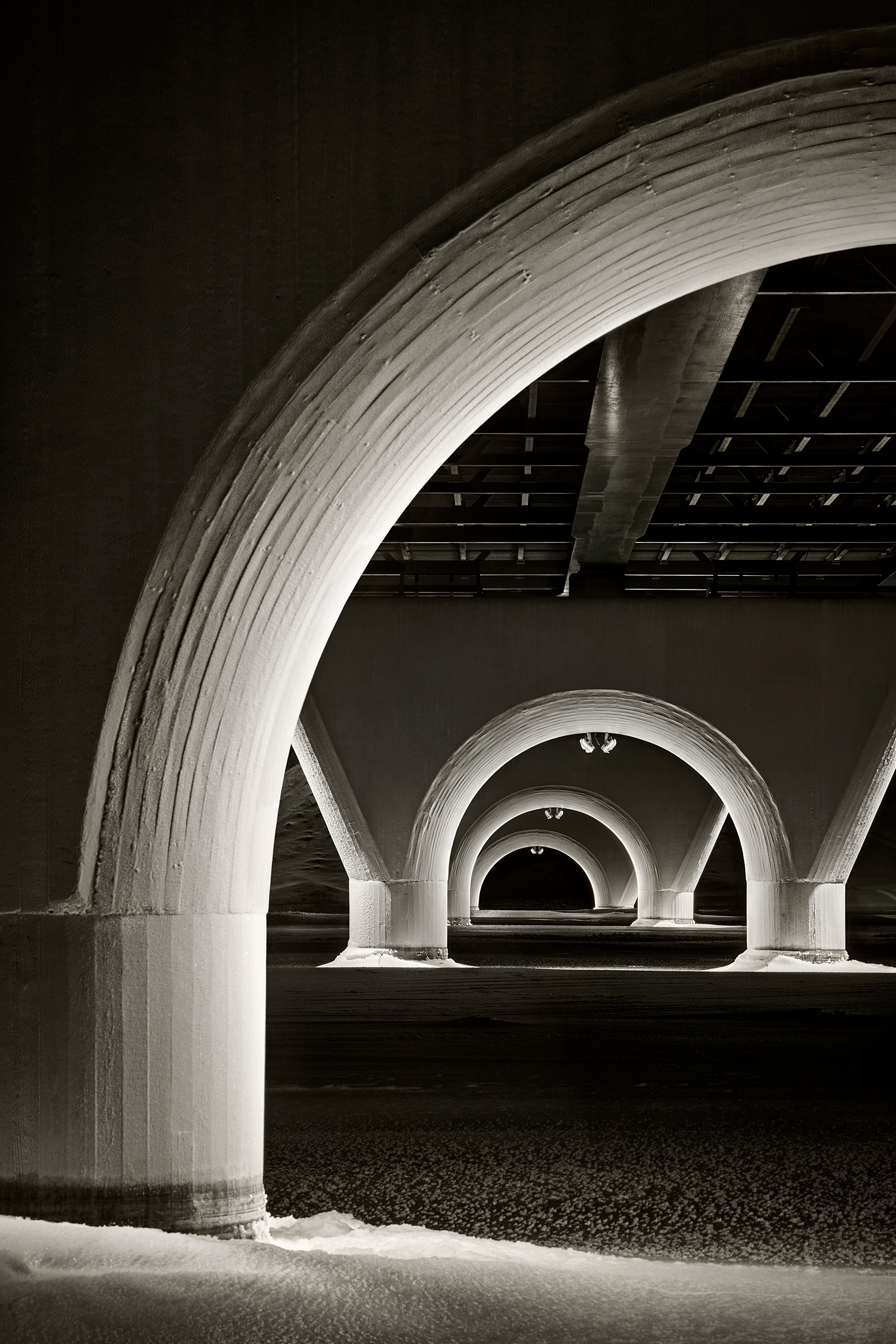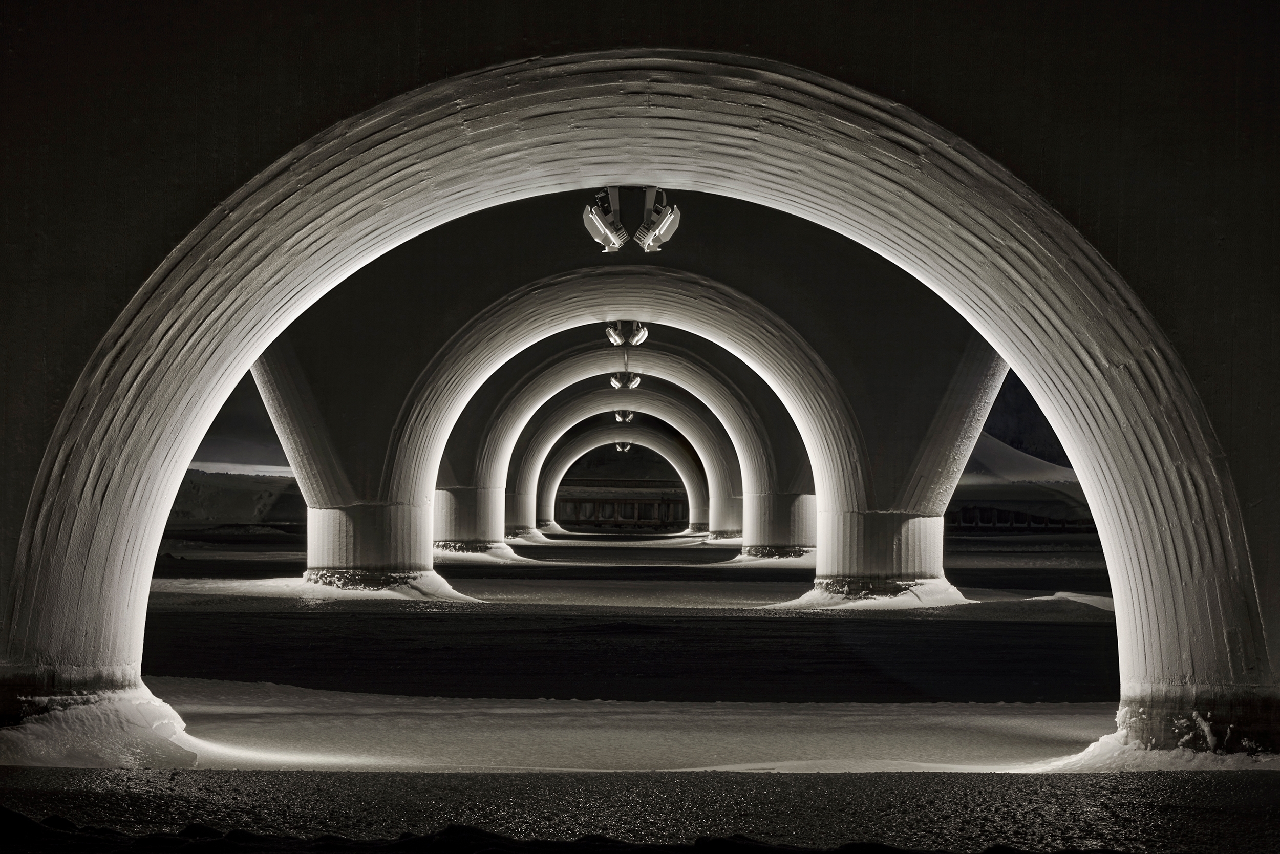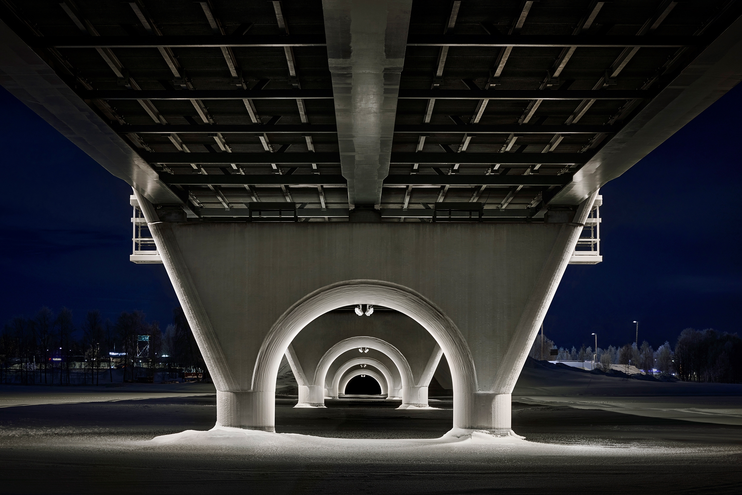 The collaboration of lighting designers, architects and engineers at Sweco has been a key factor for success leading to fulfillment of both aesthetic and technical requirements. A series of arches are illuminated with accents of cool light to create a landmark that draws attention to the magic of the river landscape and the historical buildings on its banks. The lighting design and the high contrast enhances the structure of the bridge during the long dark hours in the winter.