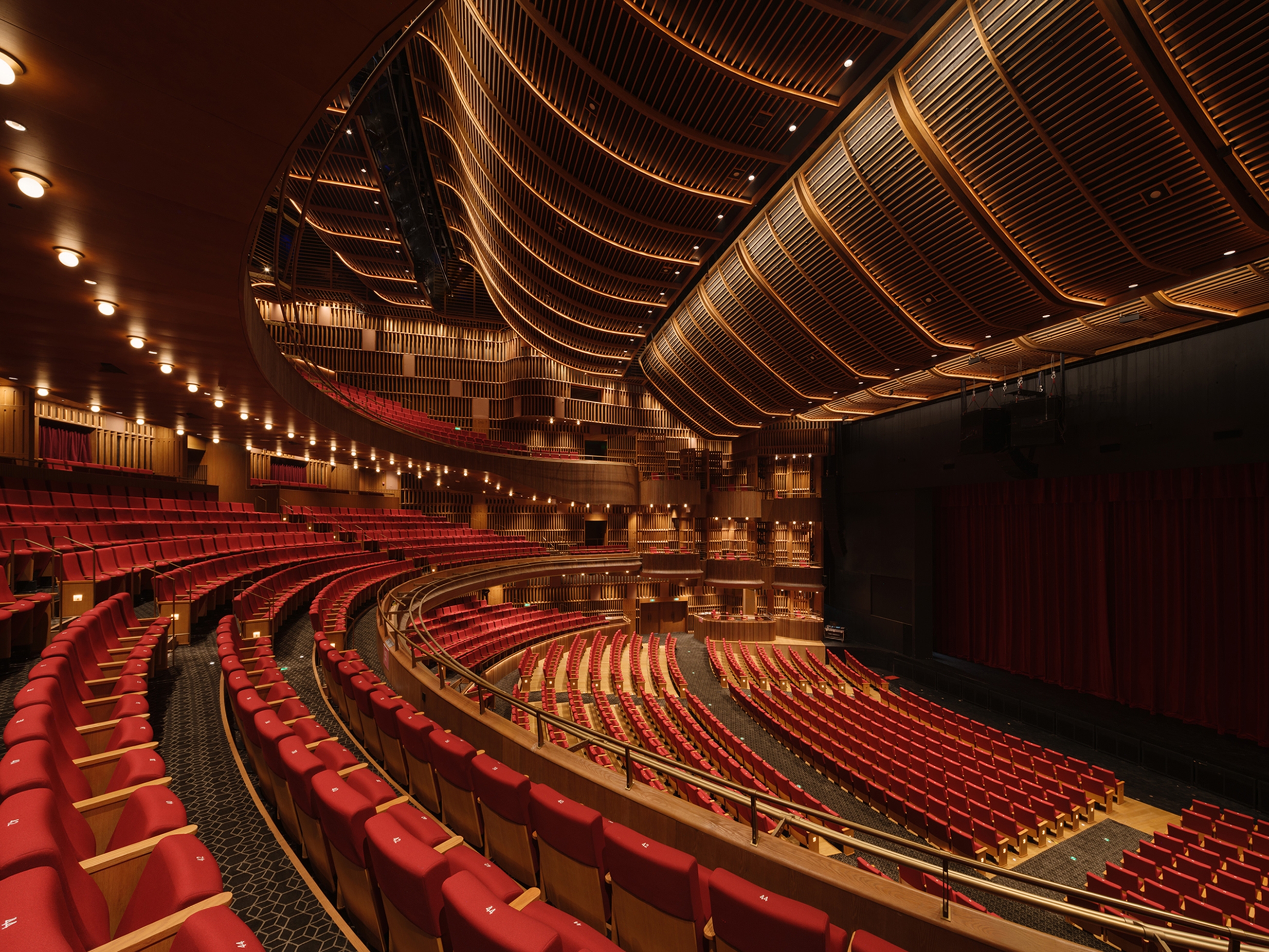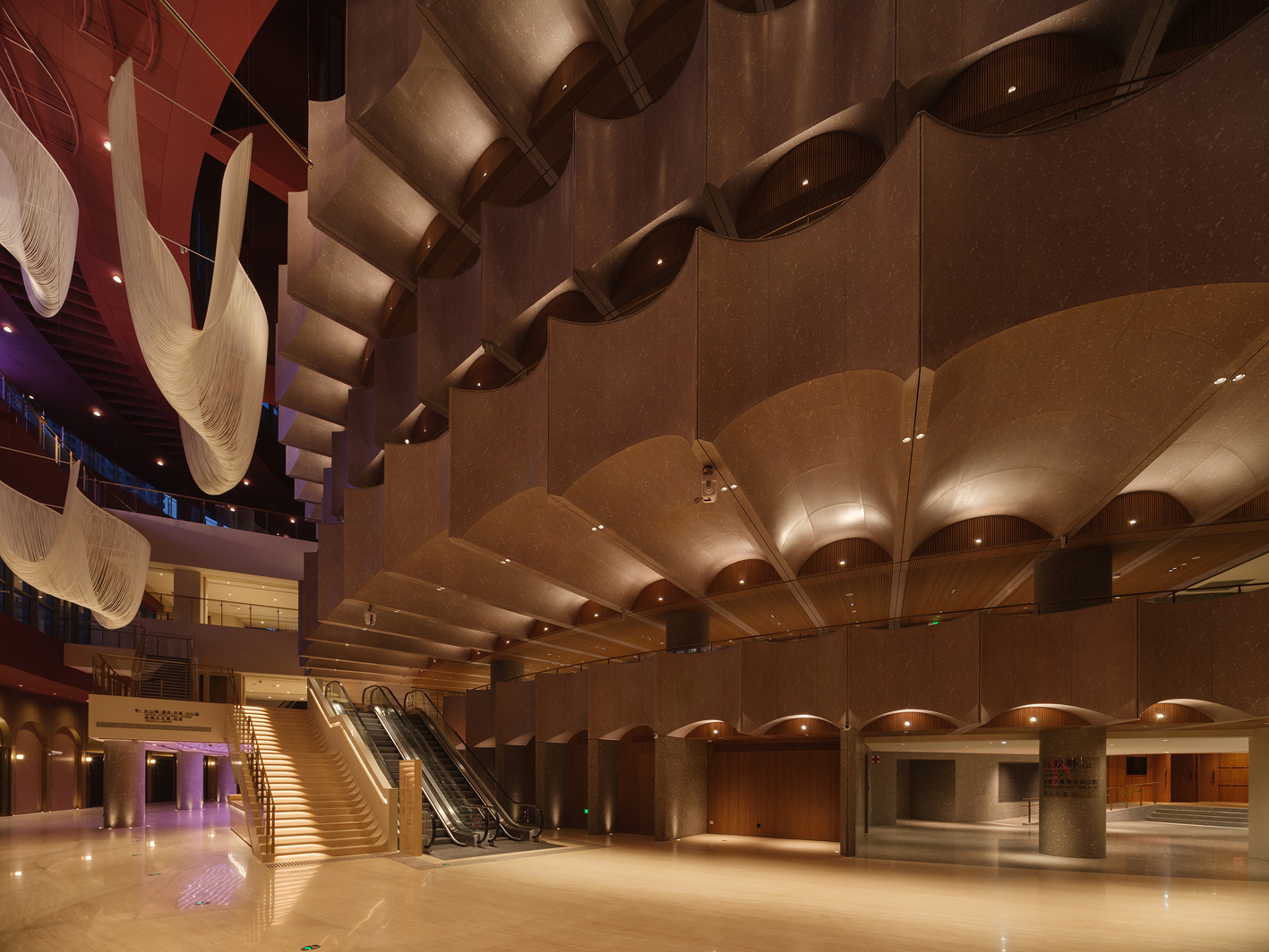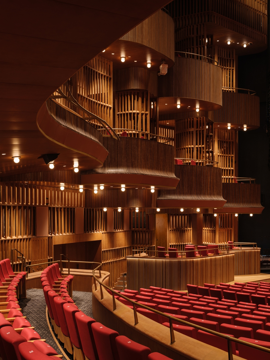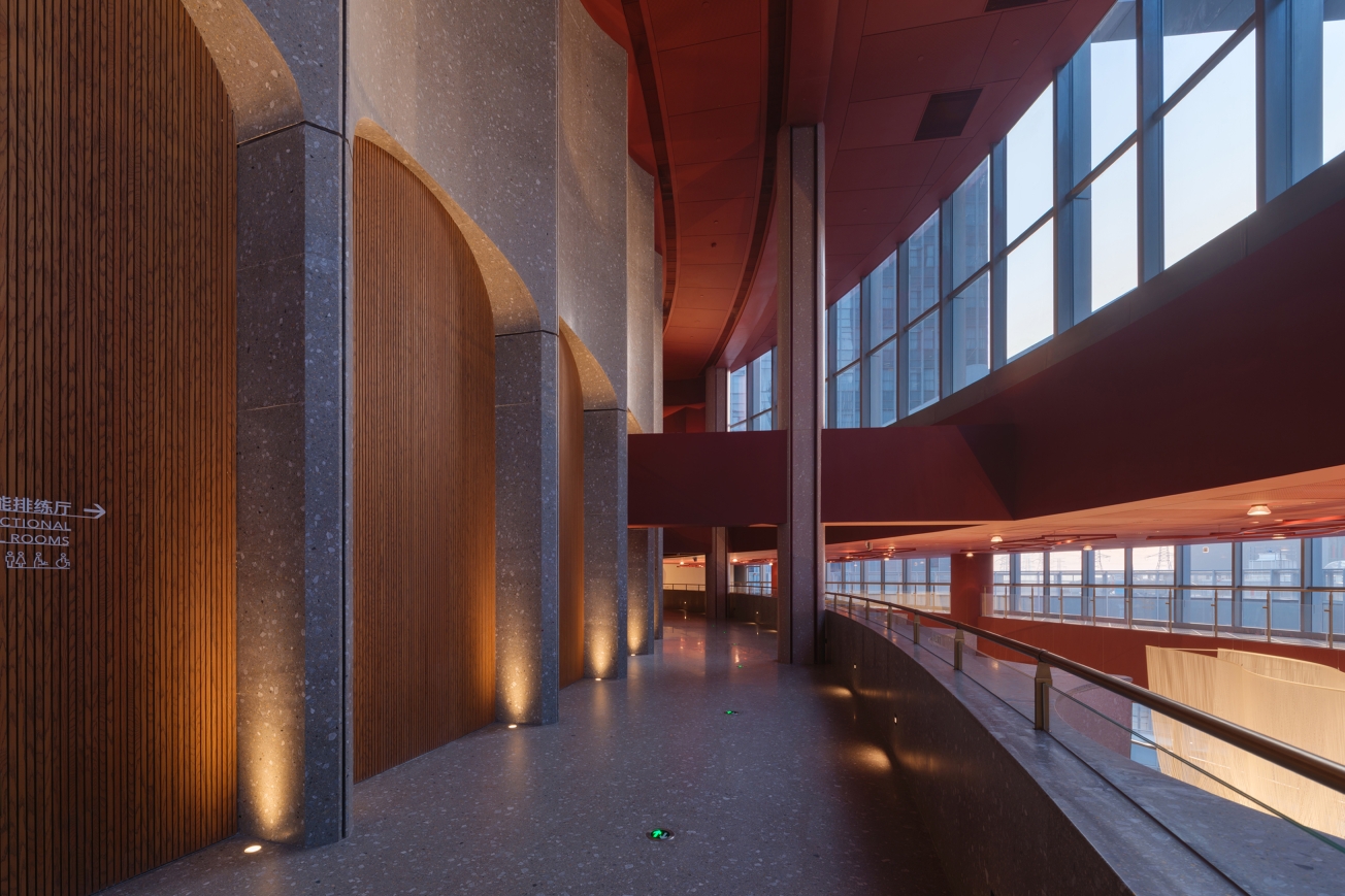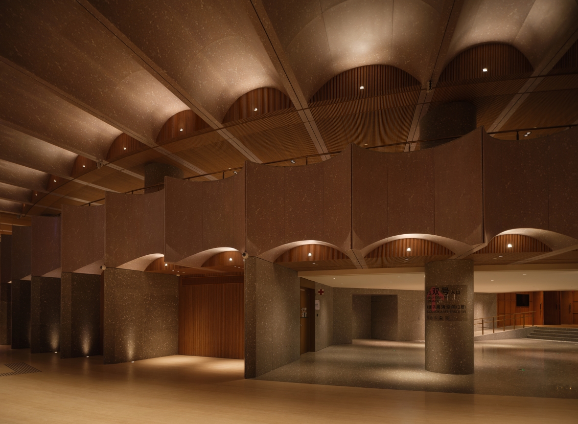 The ceiling of the theater is arranged layer by layer with the beautiful curvature of the grille, and the lighting gradually diffuses with the curvature of the design. Elegant curves are recorded in audiences’memories and provide them with more imaginations.