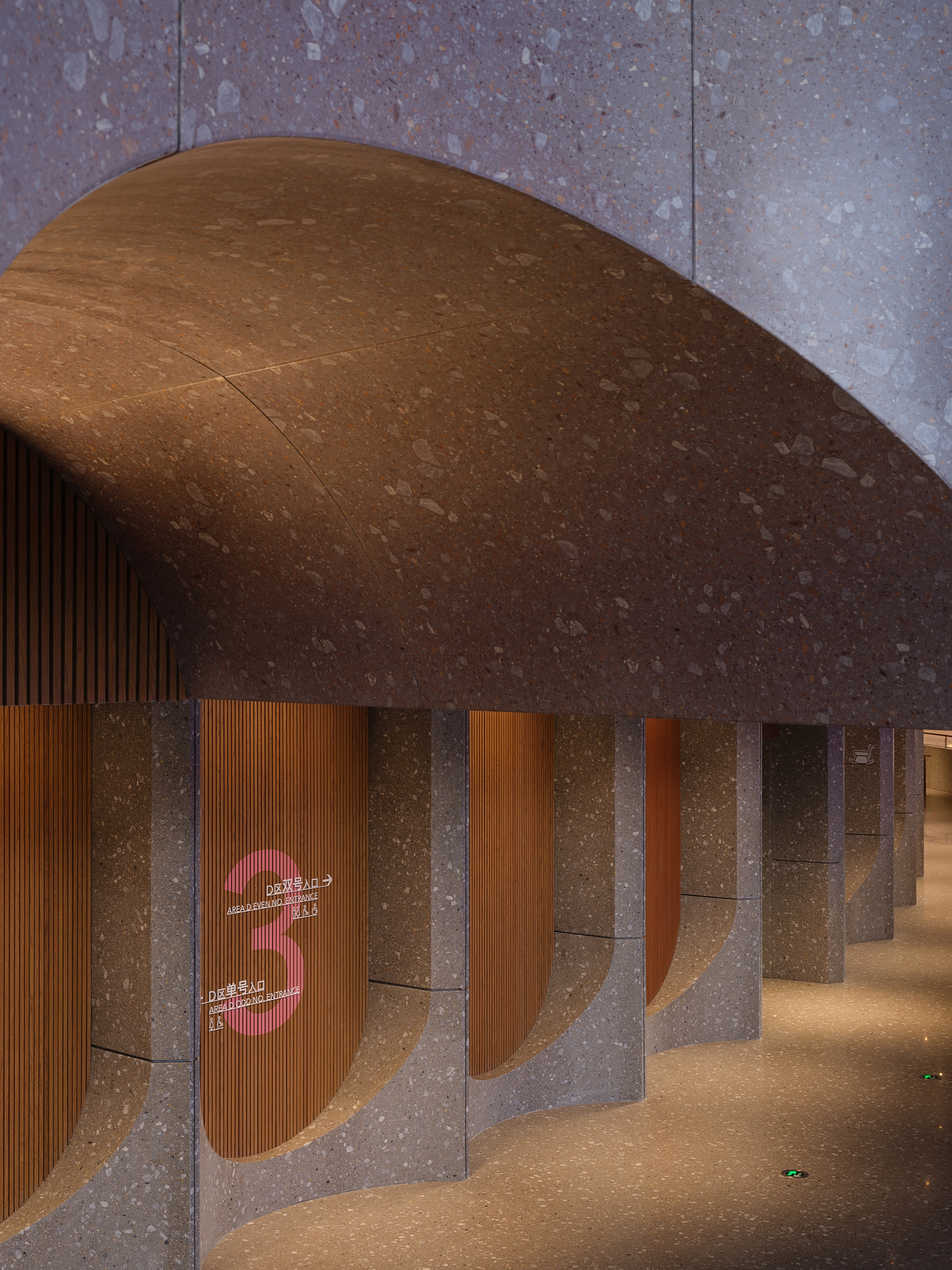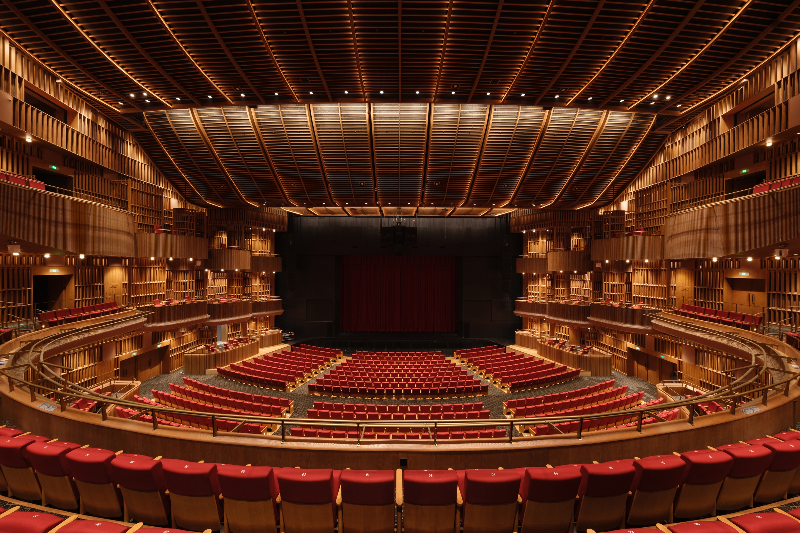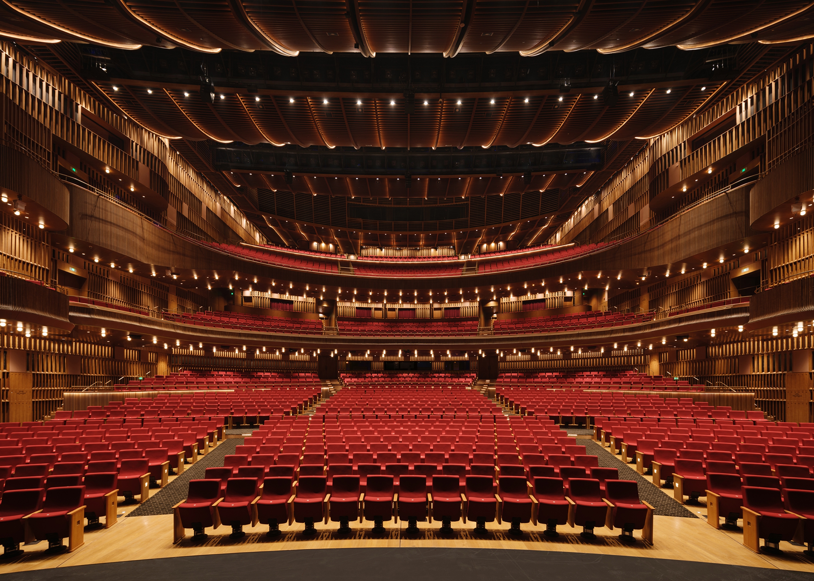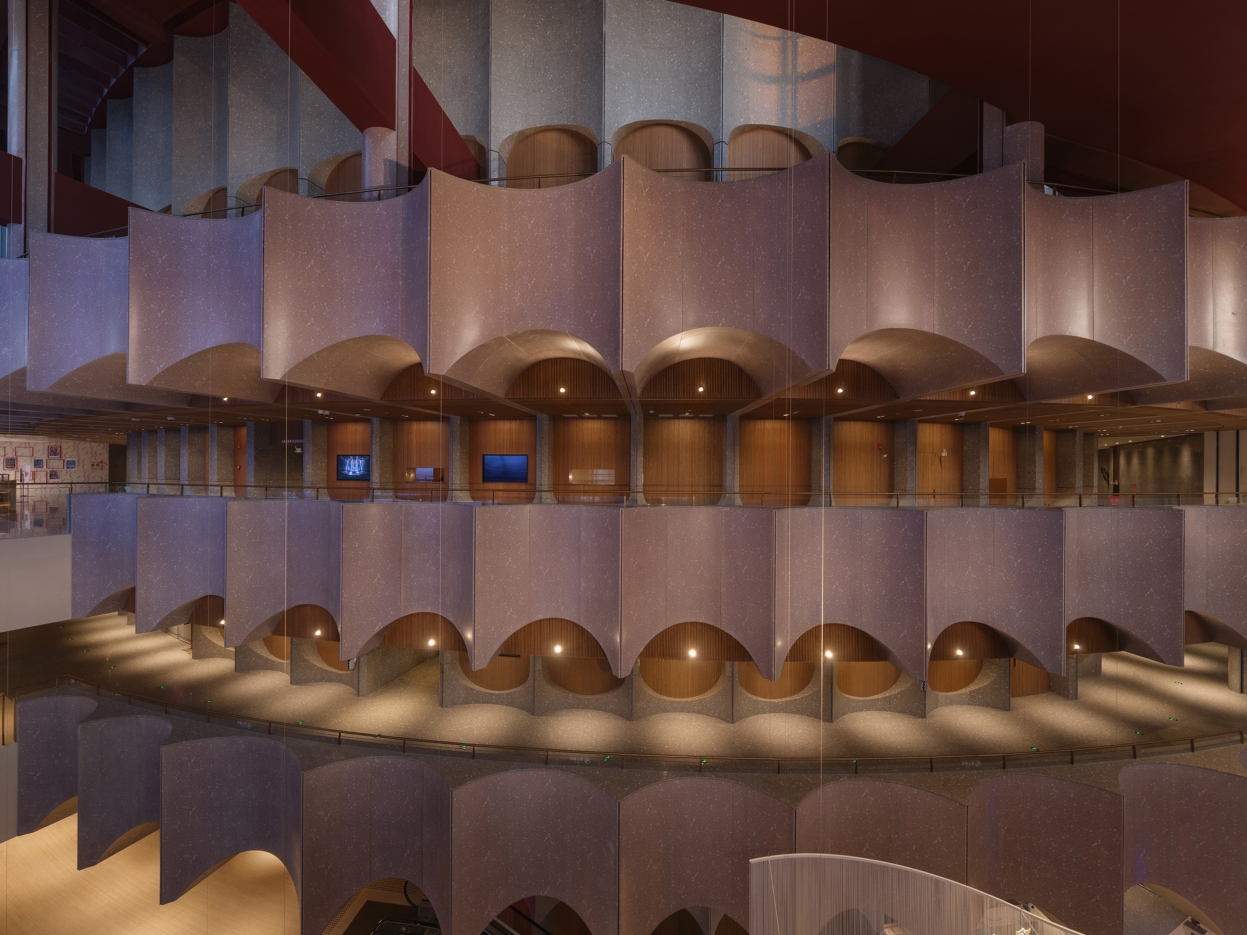 The ceiling of the theater is arranged layer by layer with the beautiful curvature of the grille, and the lighting gradually diffuses with the curvature of the design. Elegant curves are recorded in audiences’memories and provide them with more imaginations.