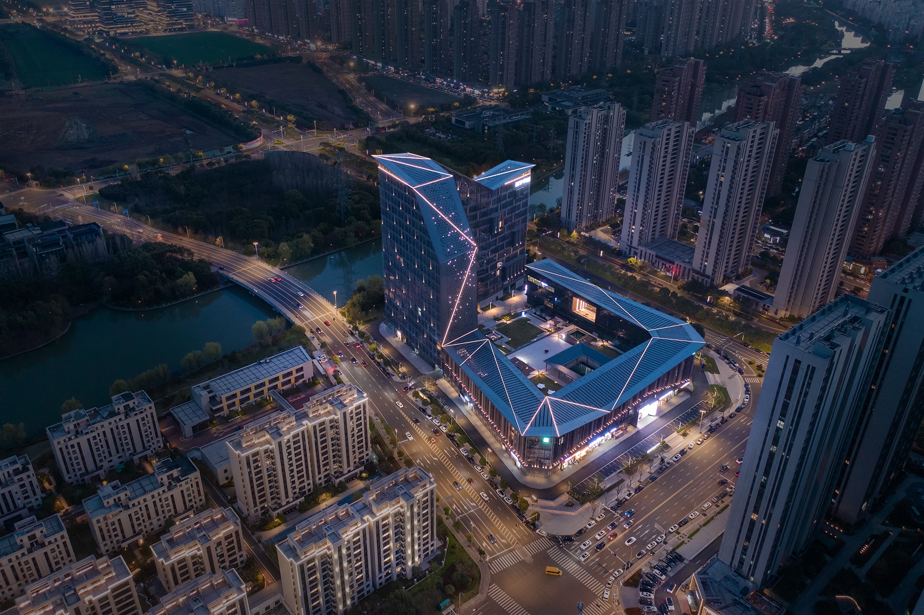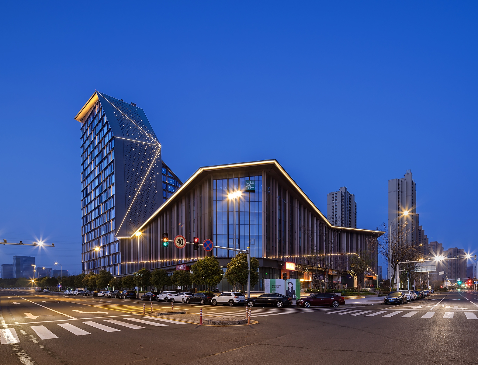 Entry Description This project is the first community located in an Internet-famous market in Changzhou. Resembling a mountain that faces a river, this architecture is characterized with an Eastern charm that holds auspicious “chi” and good vibes. The lighting design follows and develops the daytime characteristics of the building façade and thus achieves a perfect combination of lighting art and architectural aesthetics. The architectural lighting is well integrated into the curtain wall design, and the lighting control system fully presents the project’s agility and elegance at night.
