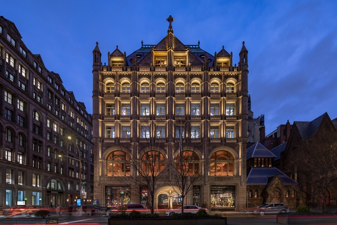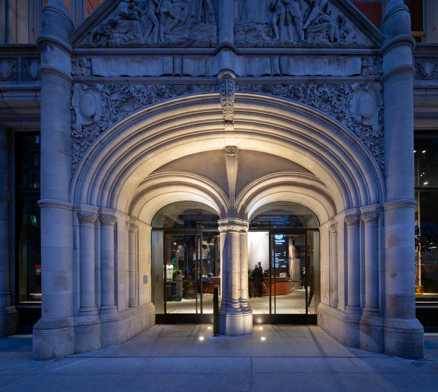 Landmarked status meant we could not damage the façade and lighting fixtures could not affect the appearance of the building. To achieve Landmark approval our design uses low profile light fixtures selected for optical control, with custom finish or valance to match the facade and the installation is detailed to prevent damage to the limestone.