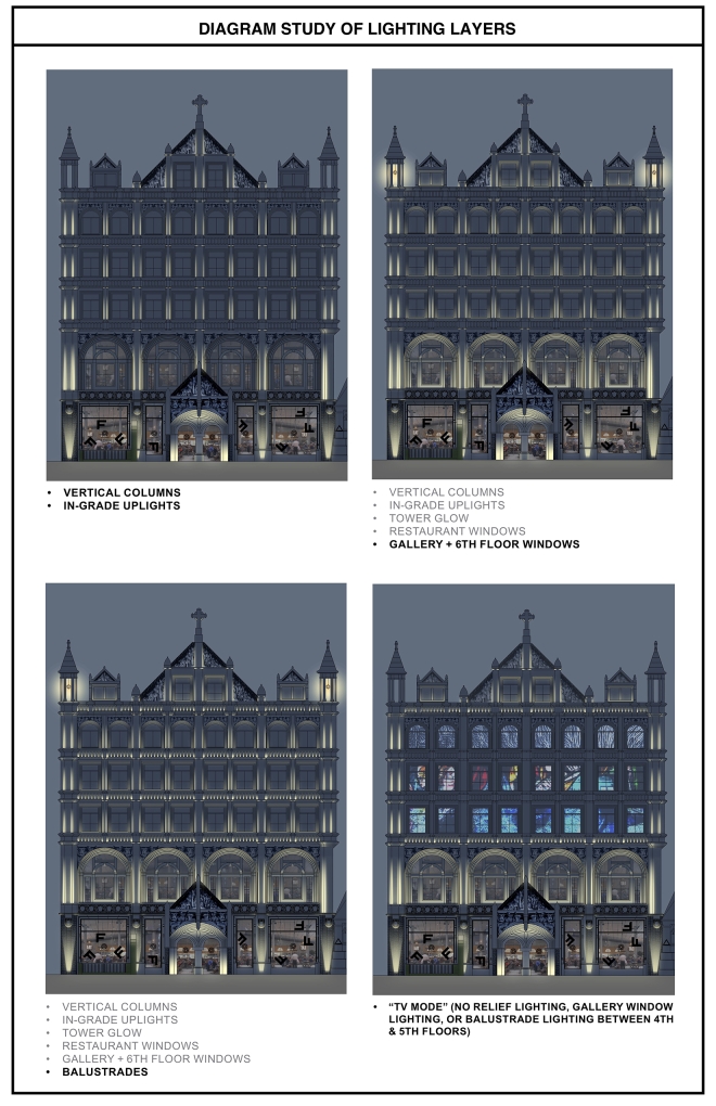 Over 15 renderings were studied to determine the preferred lighting layers. Uplights accentuate the columns, linear uplights at each sill illuminate the regressed windows, the balustrades are sculpted with LED linear light fixtures and the entry is defined by ingrade luminaires highlighting the arched portal.