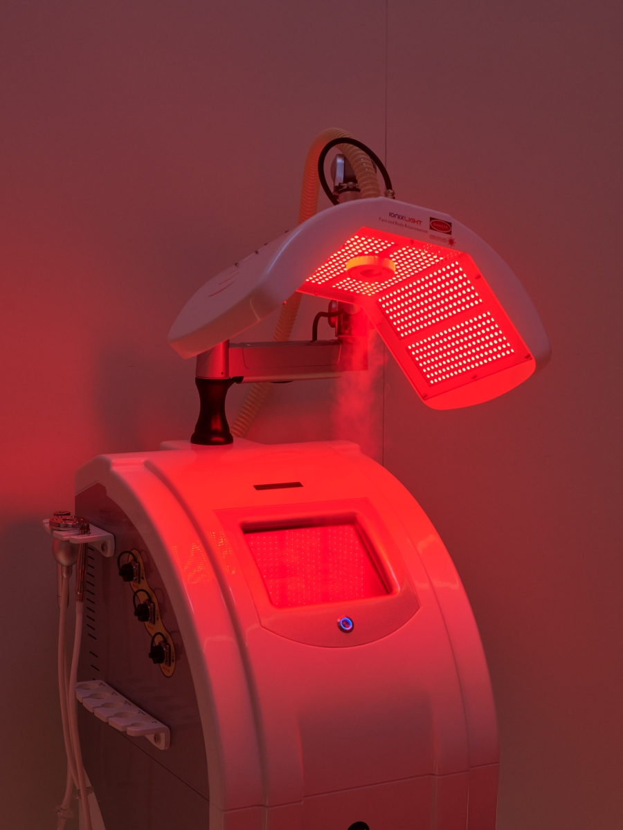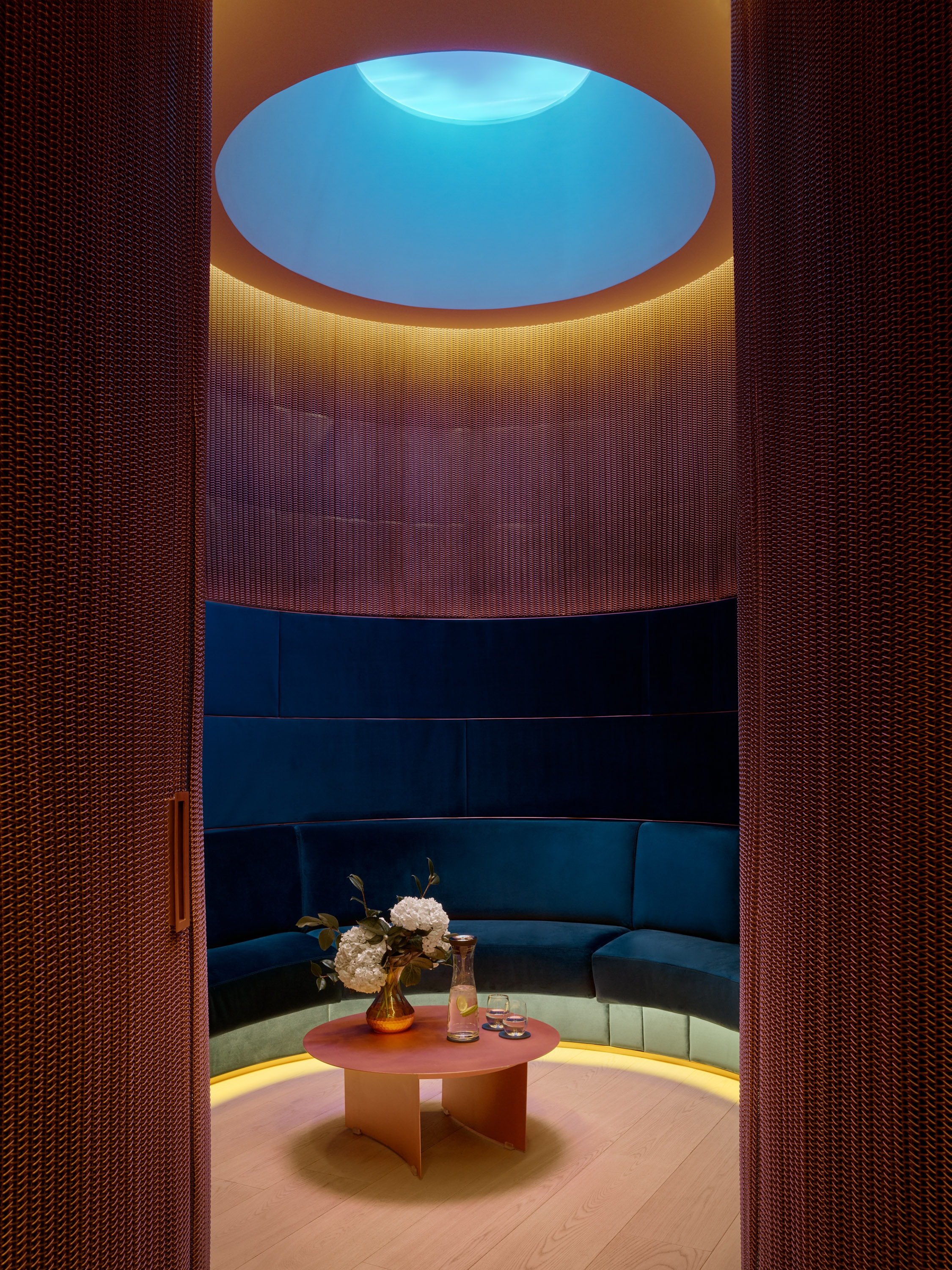 In the waiting room, a colour-changing skylight creates the illusion of a natural daylight transition, mimicking the sky-cloud effects and was inspired by James Turrell’s work. Similarly, the treatment rooms feature skylights that not only simulate openings to the outdoors but also set a special mood with coloured lighting scenarios, based on the colour science, and preparing clients for treatments. For instance, red light energises, suitable for rejuvenating treatments; blue light cools, and green induces relaxation.