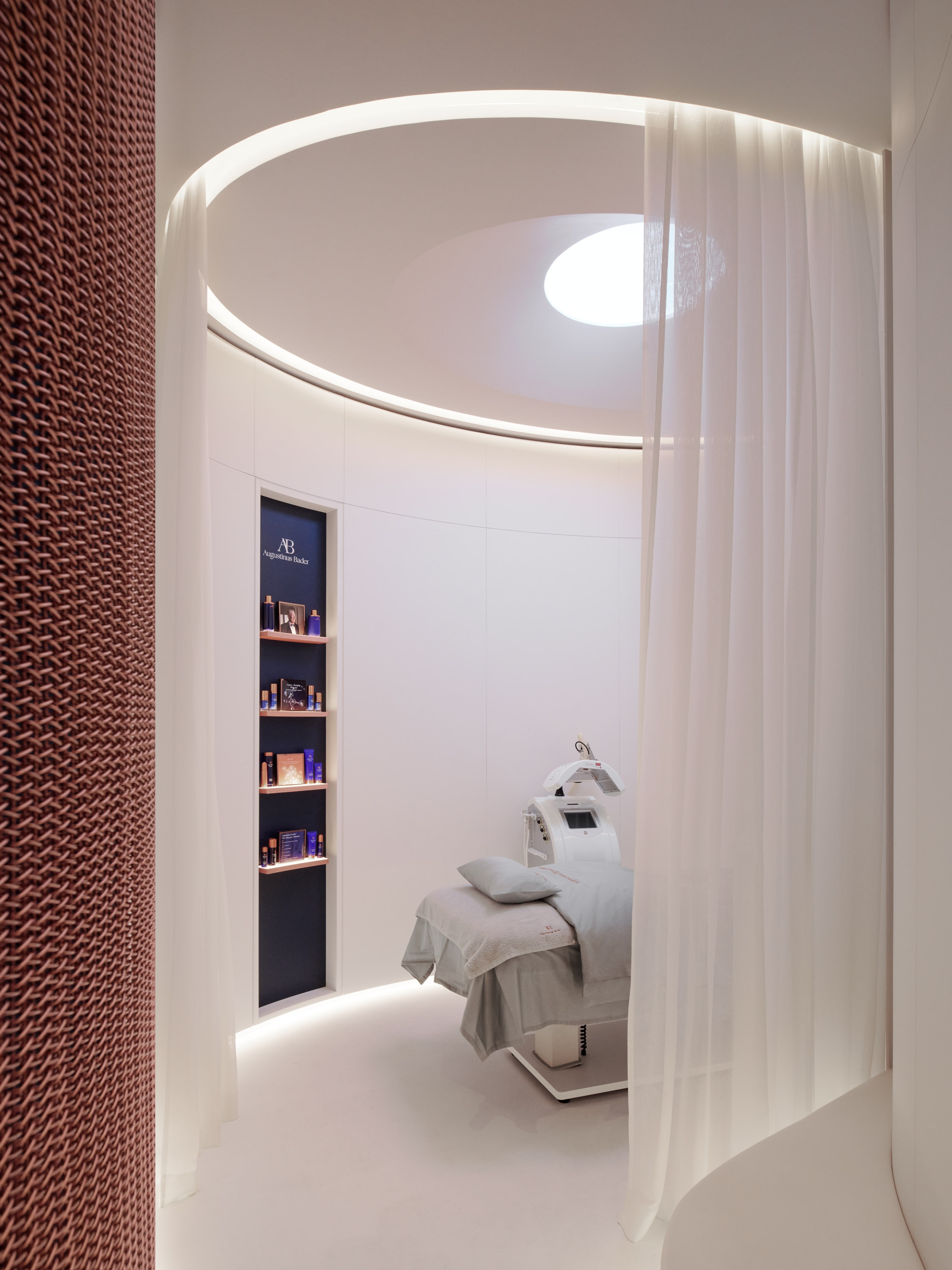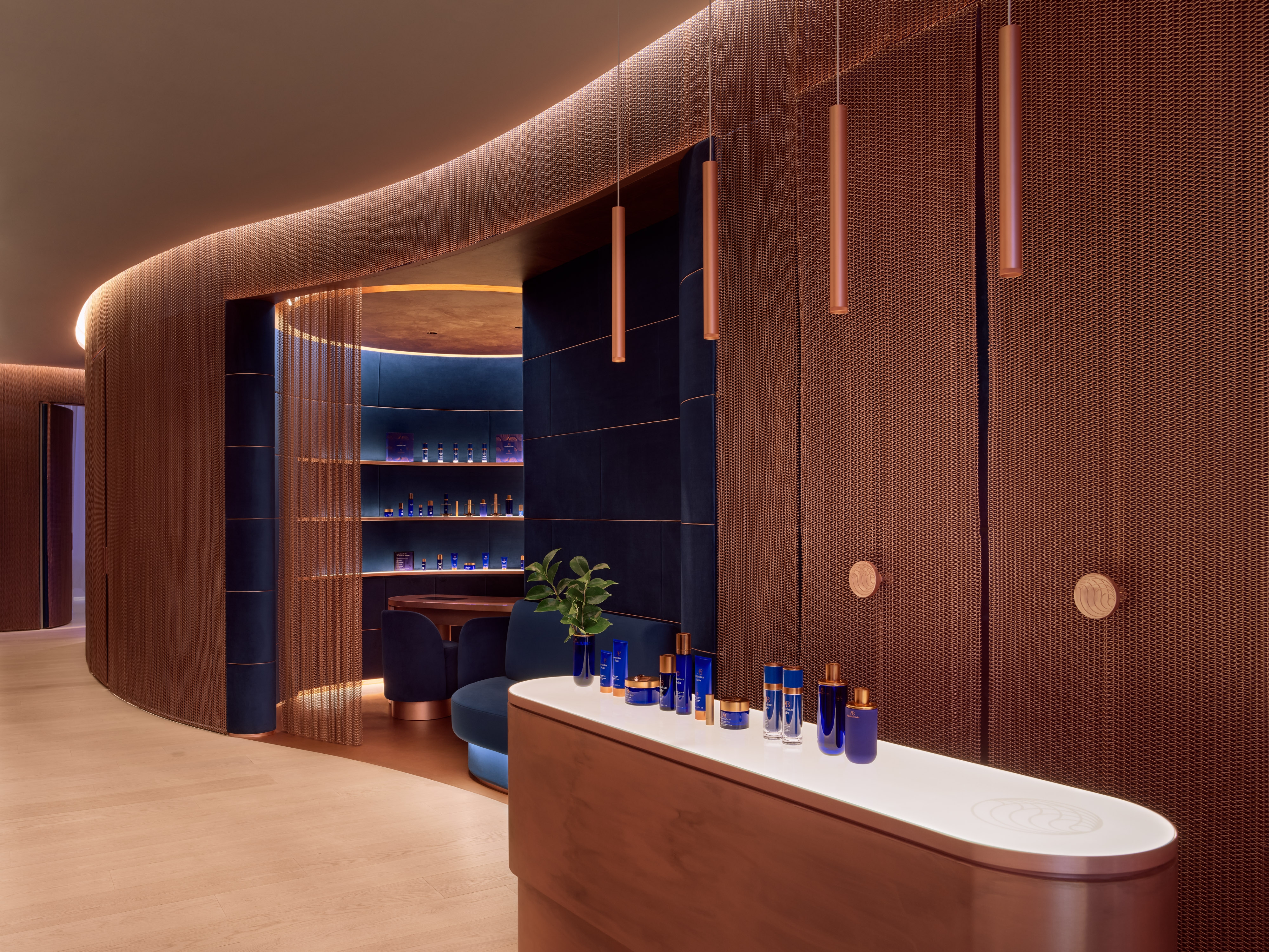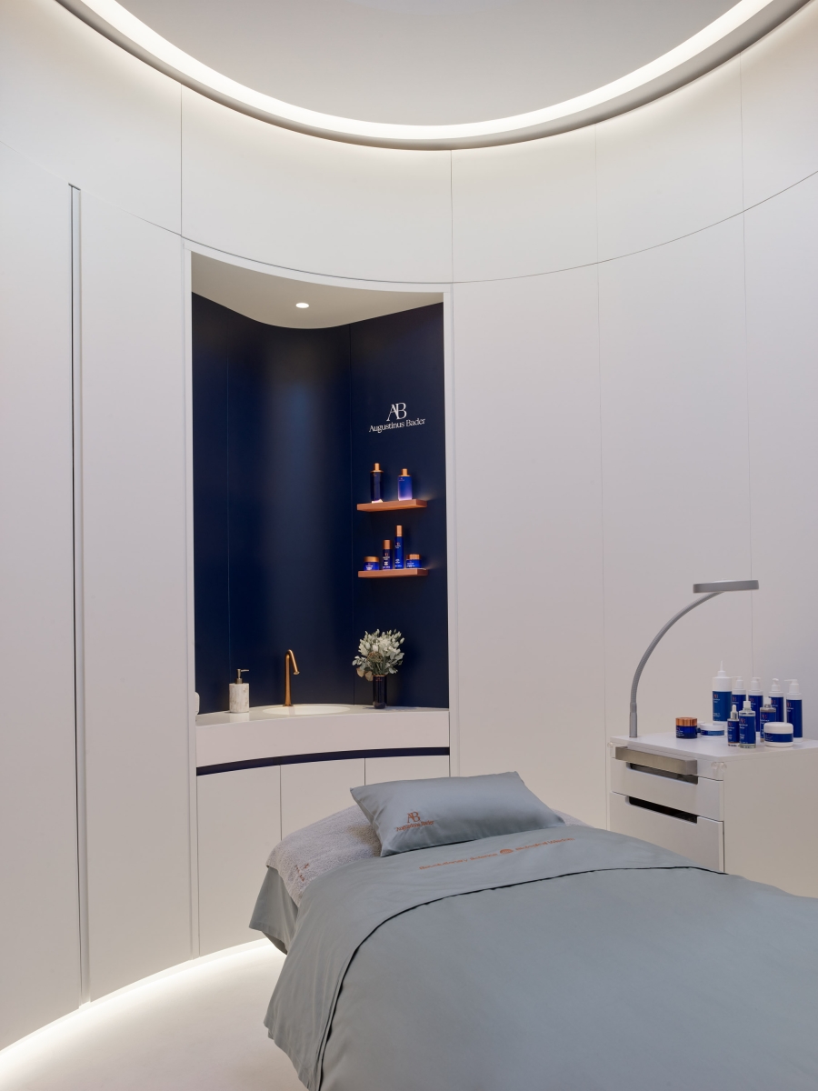 Entry DescriptionThe inaugural Augustinus Bader flagship in London redefines luxury wellness through The Skin Lab's innovative design, promising a holistic experience. The approach underscores the brand's dedication to cellular restoration, with the space's architecture featuring organic, flowing lines highlighted by meticulously integrated lighting. A notable challenge was achieving ambient and functional lighting without conventional downlights, leading to the strategic use of perimeter coves and curtain grazers. The lighting, primarily set at a warm 2700K and supplemented by tunable white LED technology, accurately represents the brand’s iconic blue and copper hues.