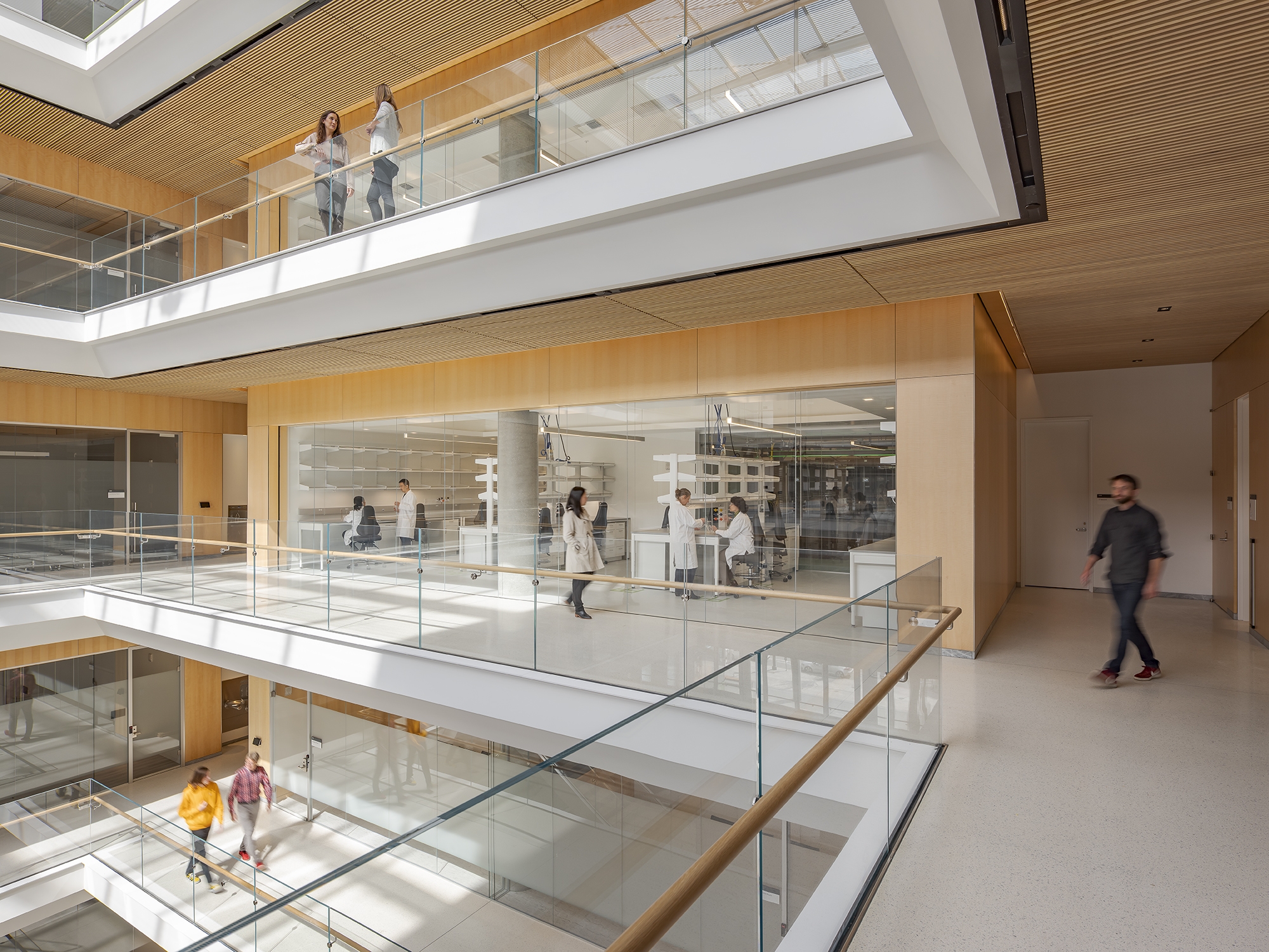 Entry DescriptionIn this facility for neurological and psychiatric diseases, daylight in public areas is supplemented by lights responding to sky conditions. At dusk, light transitions seamlessly to washes on warm wood finishes. Promoting wellness, fixtures are integrated into the architecture, avoid glare, and highlight natural wood. Lighting is coordinated with the wood slat ceiling, in coves, and organized in a slot around the atrium with HVAC registers and fire sprinklers. Wood walls are washed by small point sources integrated into the wood slat ceiling. At the skylight perimeter, wood slats receive a gradient of light from linear grazers. The atrium ground floor and open stair are lit with cumulative light from many low power fixtures. Installed power of the atrium is 0.32 W/sf, ? of that allowed by code.