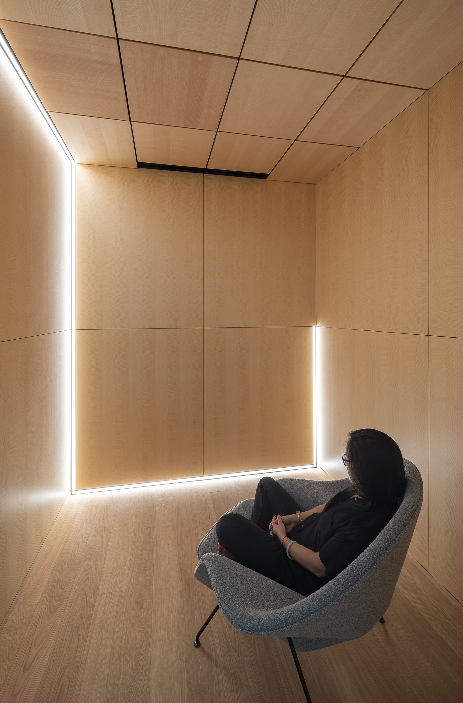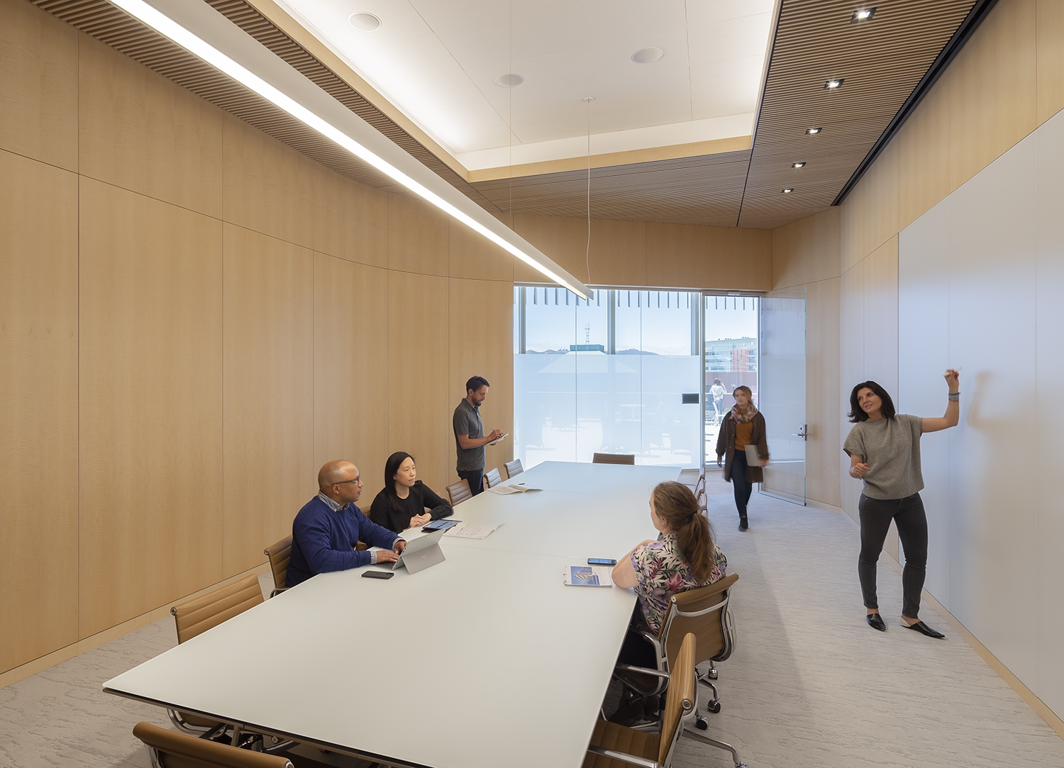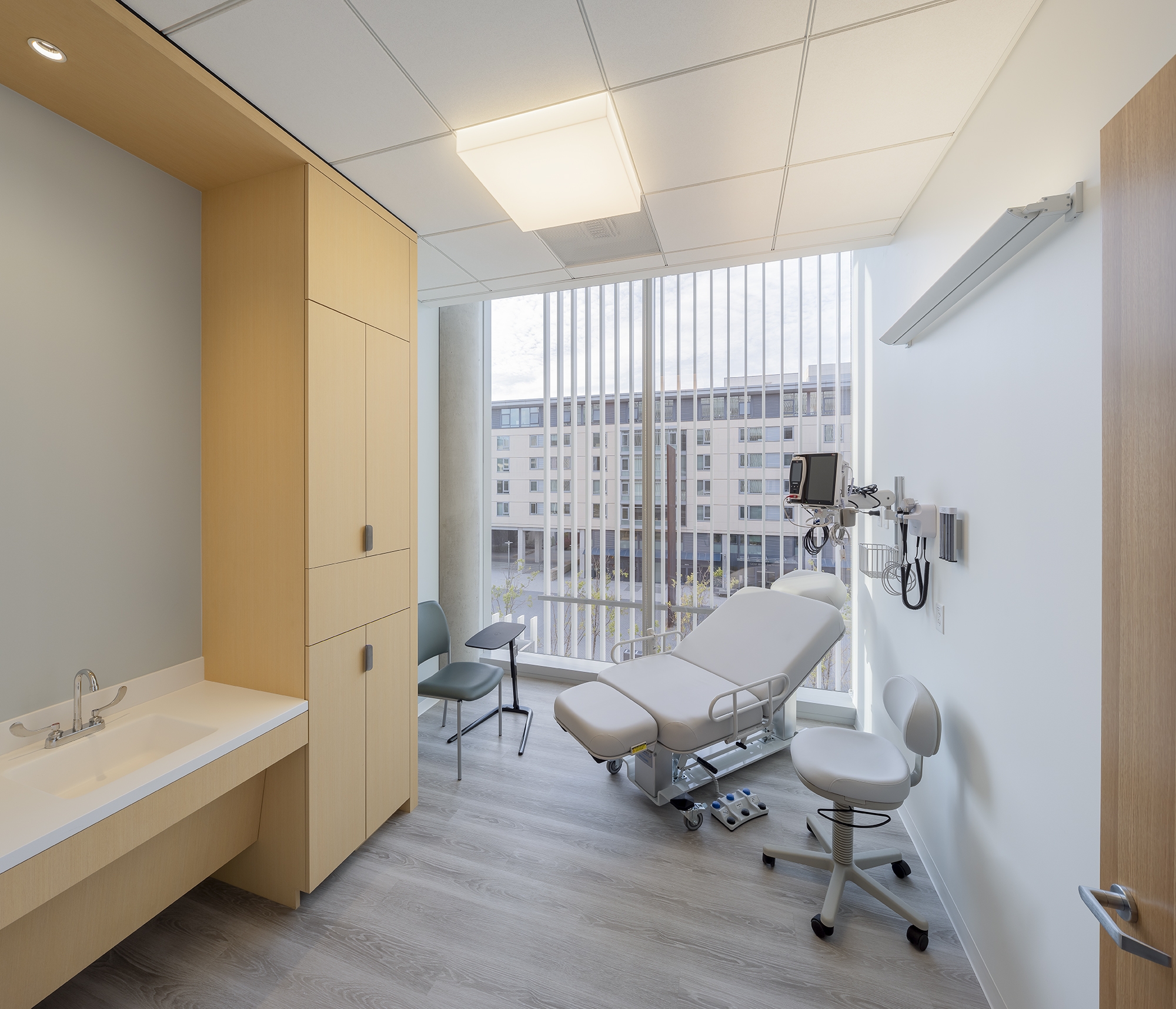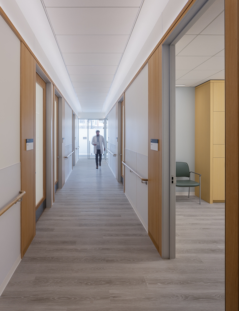 Integrated and indirect lighting continue throughout. Patient hallways are 100% indirectly lit, with linear fixtures lighting the ceiling. Exam rooms have several layers of light: large diffuse ceiling fixture, wall-mounted ceiling washer, and millwork downlight. In conference rooms, light is balanced by linear pendants with a batwing indirect component and linear ceiling washers. In reception areas and waiting rooms, architectural surfaces are washed with light, task surfaces are lit by ceiling integrated fixtures, and fill light is from fixtures integrated into the ceiling slats.
