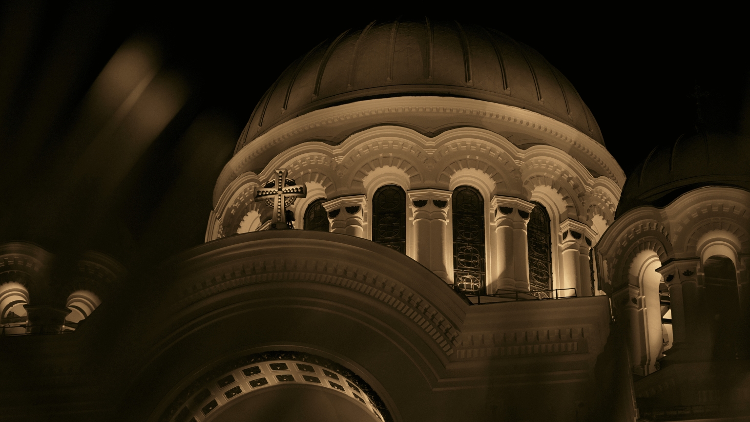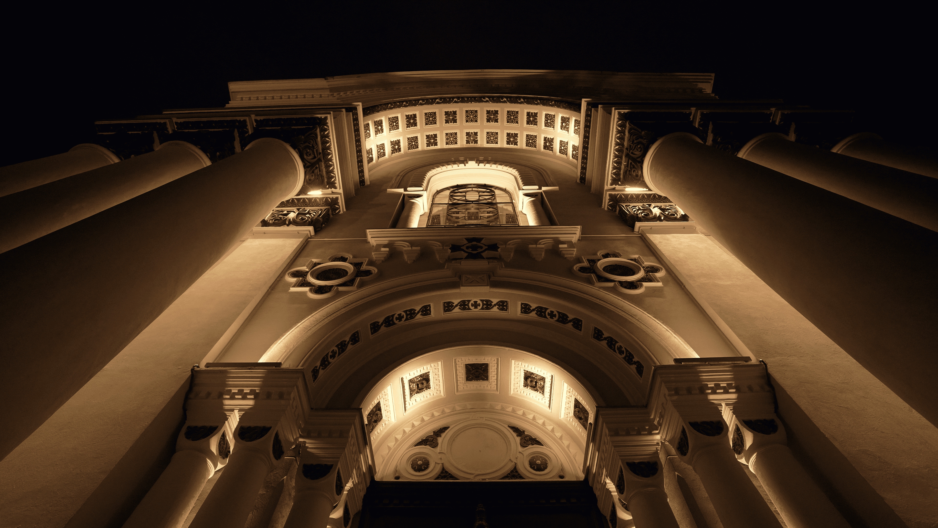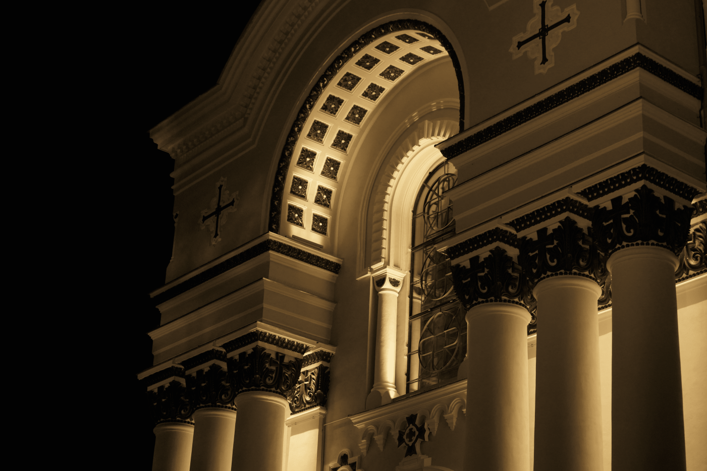 The second layer focuses on highlighting the church's key architectural details, such as columns, arches, and ornate carvings, by using targeted lighting. This creates a subtle contrast, bringing out the intricate features without any visible luminaires.