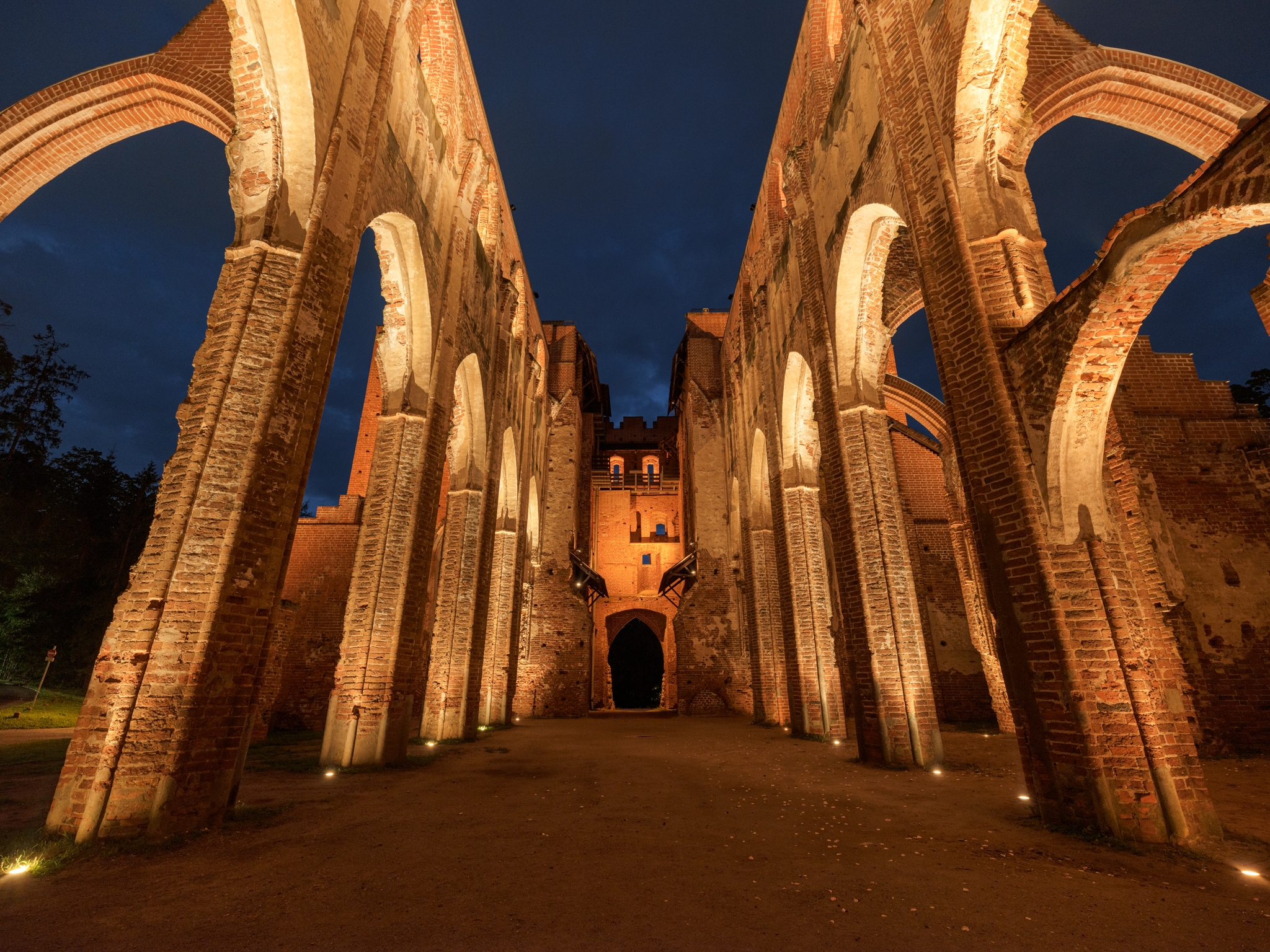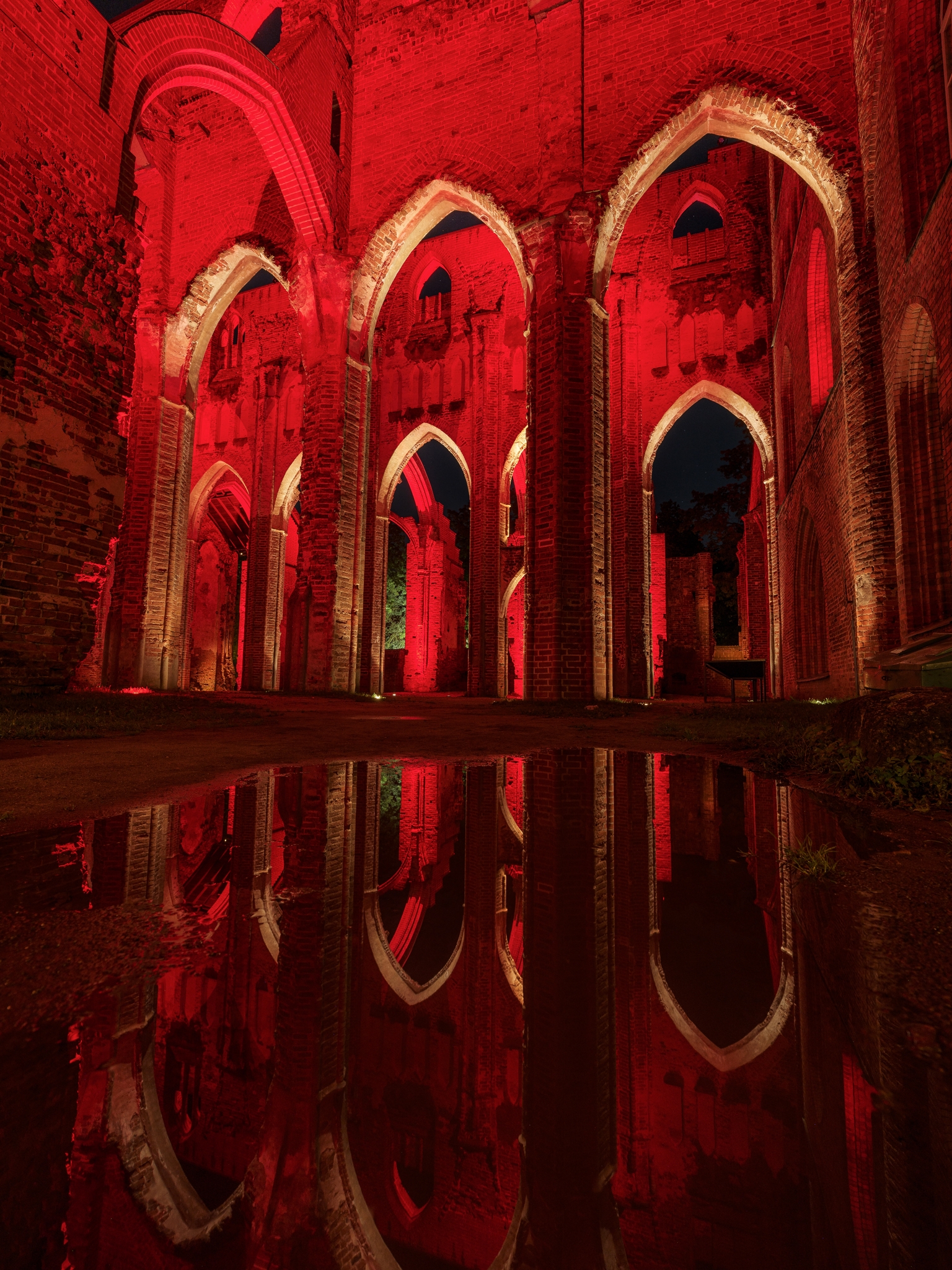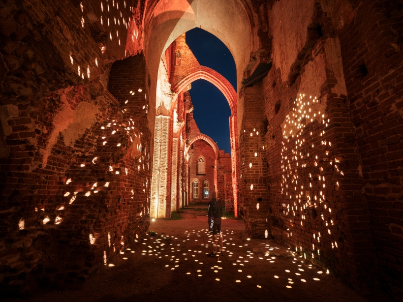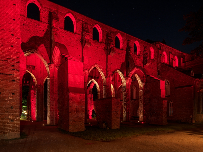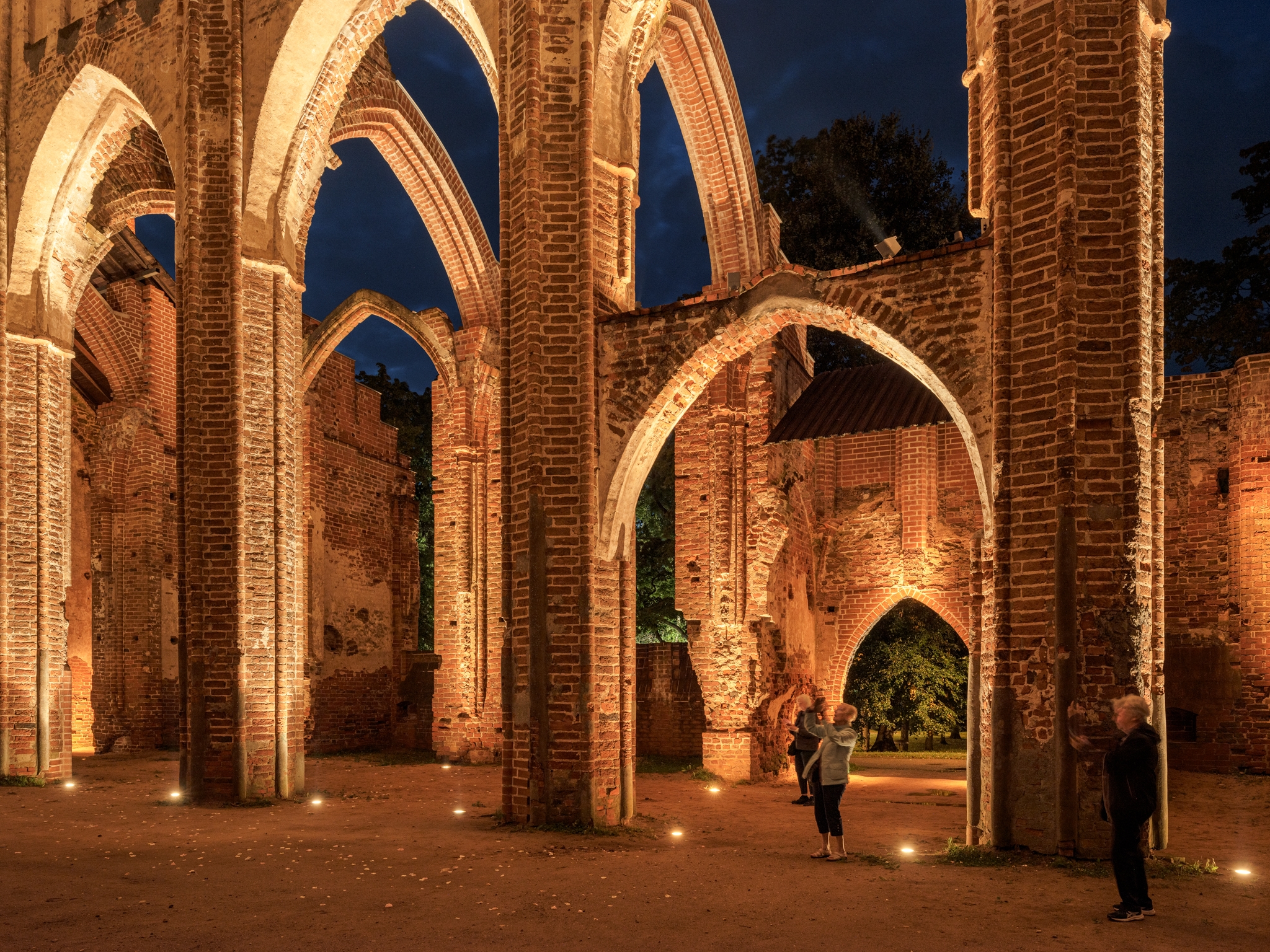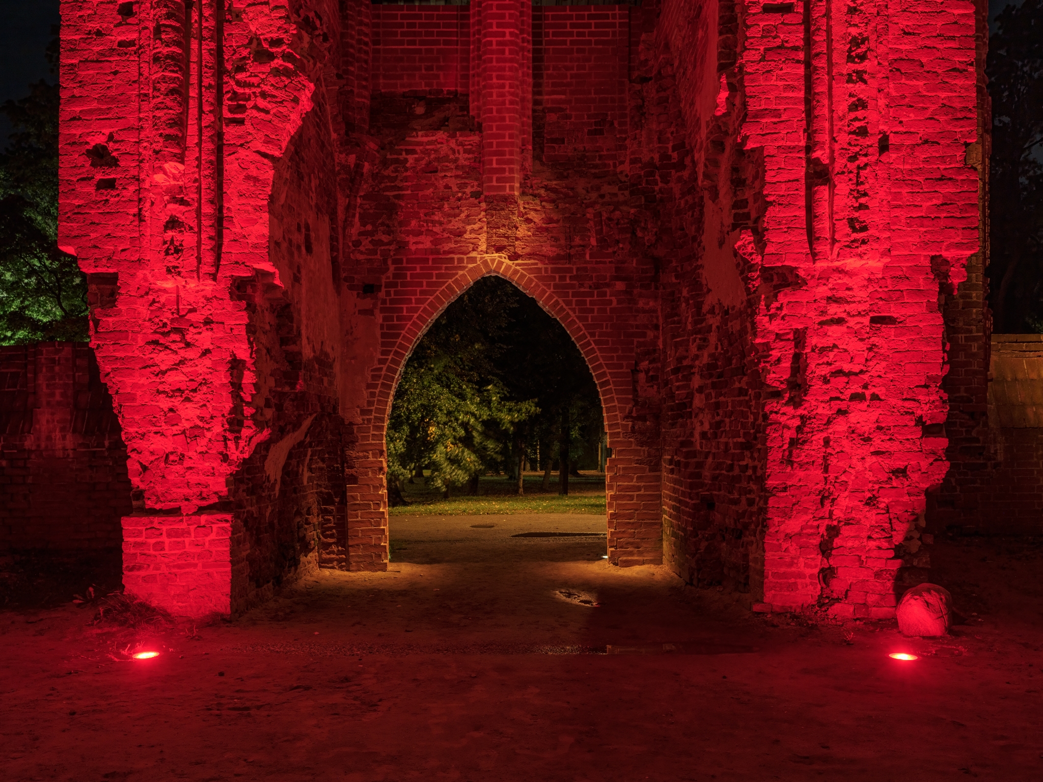 As the cathedral is located in a dark park, low light contrast is enough to make the building a landmark. The choice of warm red lights is less disturbing for the living species and the environment. This lighting project can be seen as a prime example of reconciling sustainability and visibility.