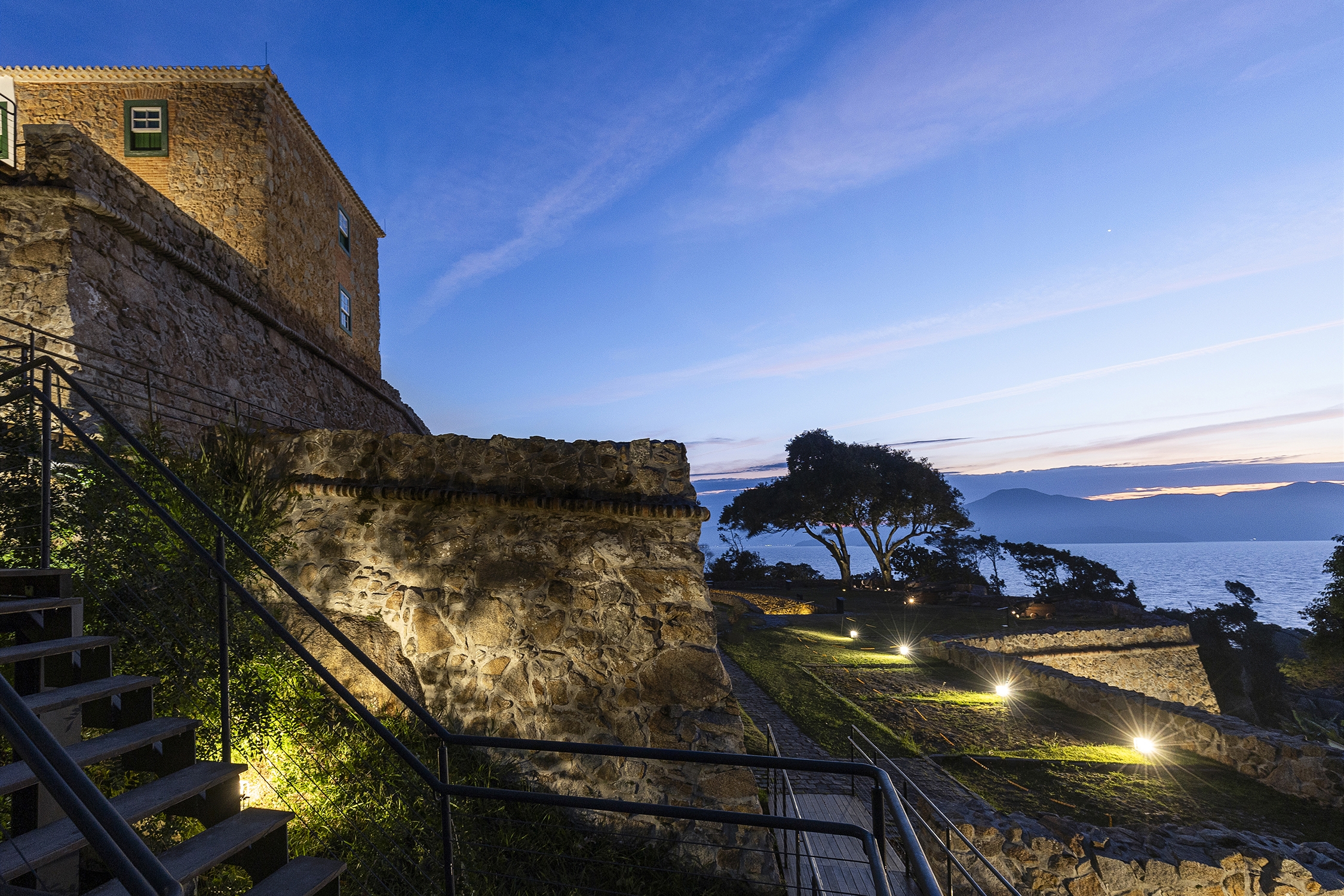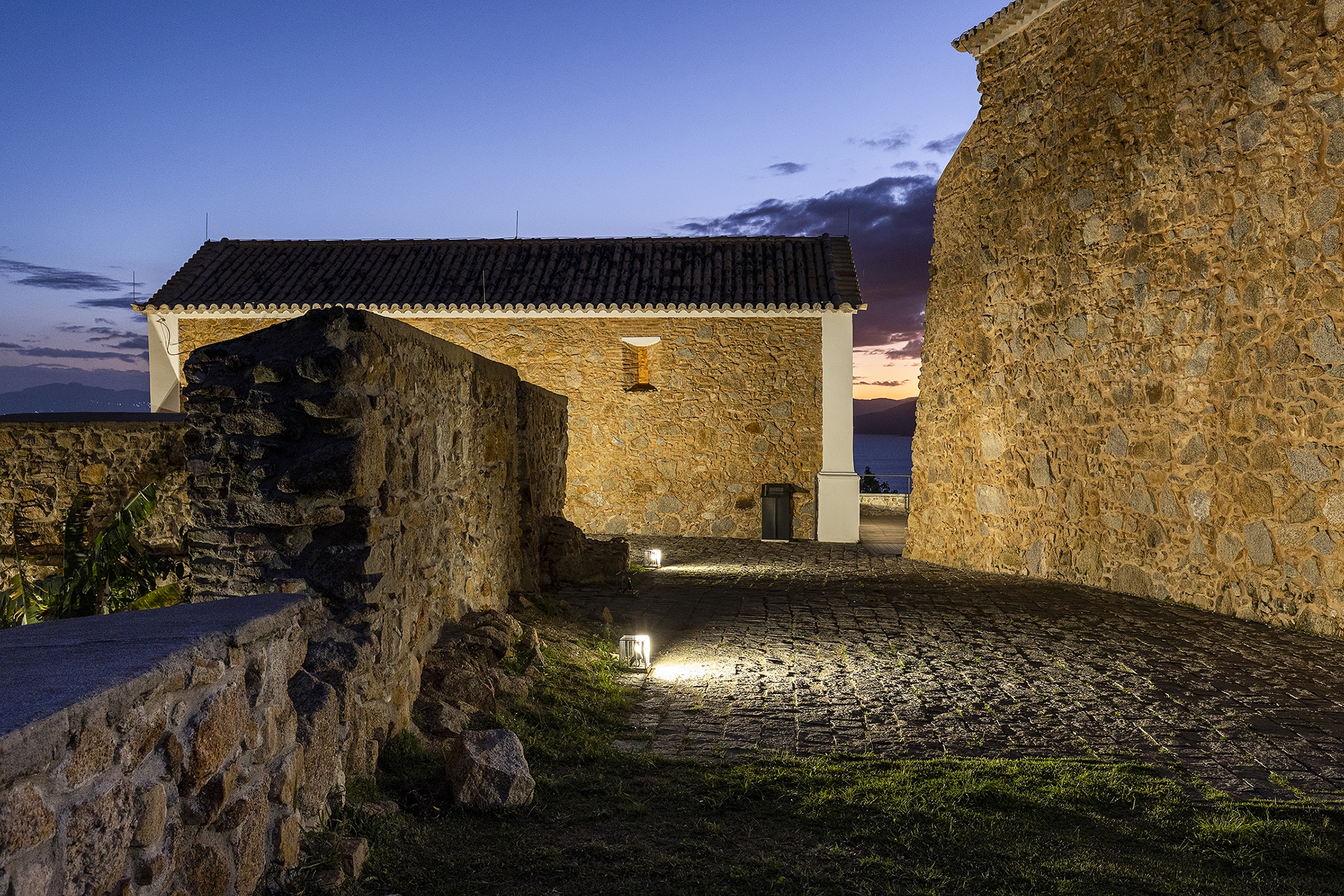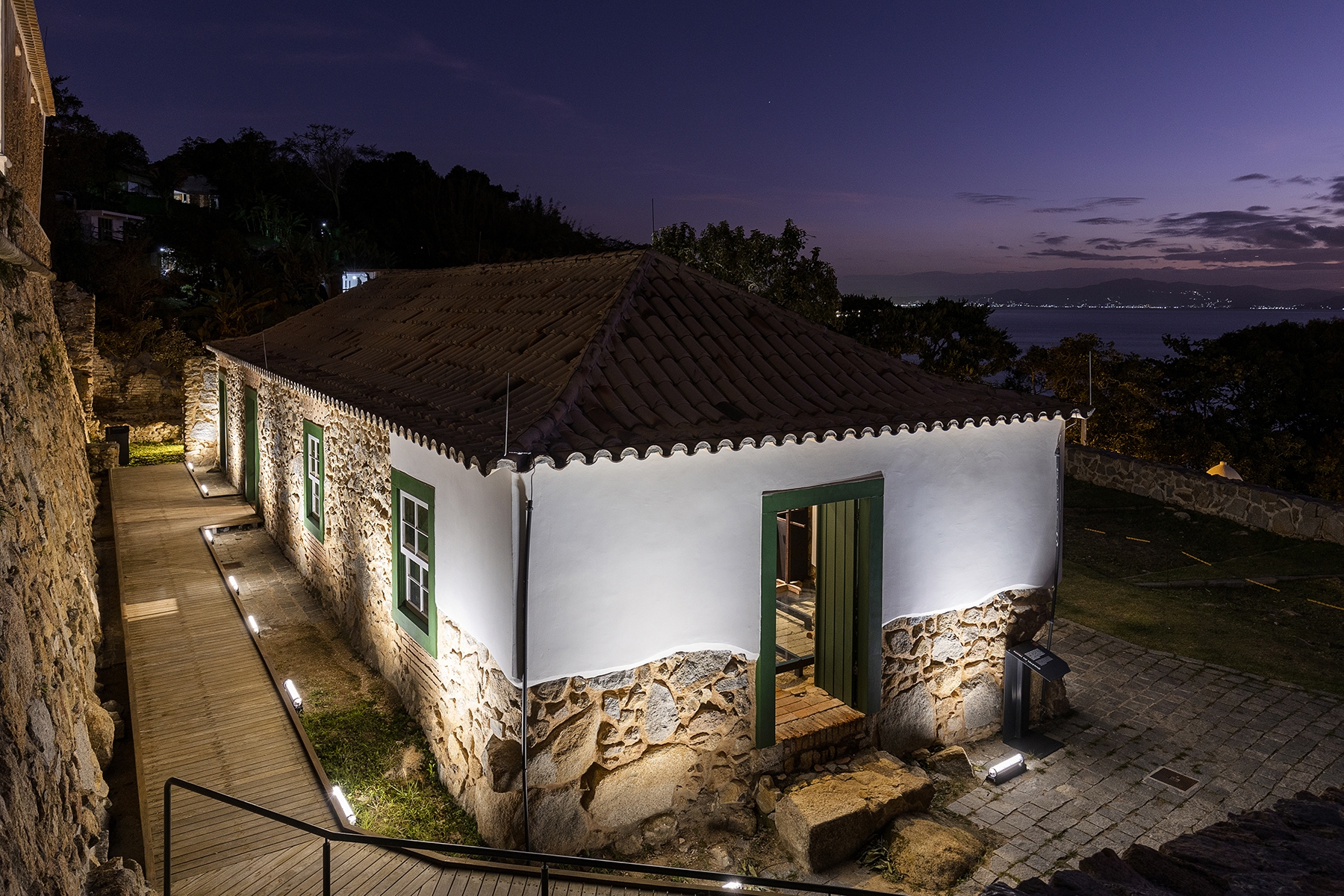Entry DescriptionThe Fortress, dating from 1765 and listed by IPHAN since 1938, was part of the defensive system of Florianópolis, located approximately 25 km from the city center. The architectural complex is made up of thick walls and three buildings. The lighting was designed to reinforce the construction's protagonism in the landscape, offering it’s lighting a supporting role, indirectly, to reveal new elements, built in the revitalization process, highlighting their functionality, through contrast. The physical changes to the existing structure presented challenges in defining lighting solutions, as the objective was to keep artificial light sources imperceptible, avoiding physical interference in the building. The lighting concept consisted of using homogeneous lighting to uniformly highlight the different levels of the architectural complex, using diffused light equipment with low intensity, minimizing light pollution. Historical elements of the scene received direct and more intense lighting, such as artillery objects and cannons, while the vigils were illuminated internally in a diffuse way with a warm tone to highlight them and allude to their function as a vigil, evoking the presence of somebody. The main access to the interior of the Fortress received pendant lamps for general lighting of the space, alluding to the vaulted structure that existed there.