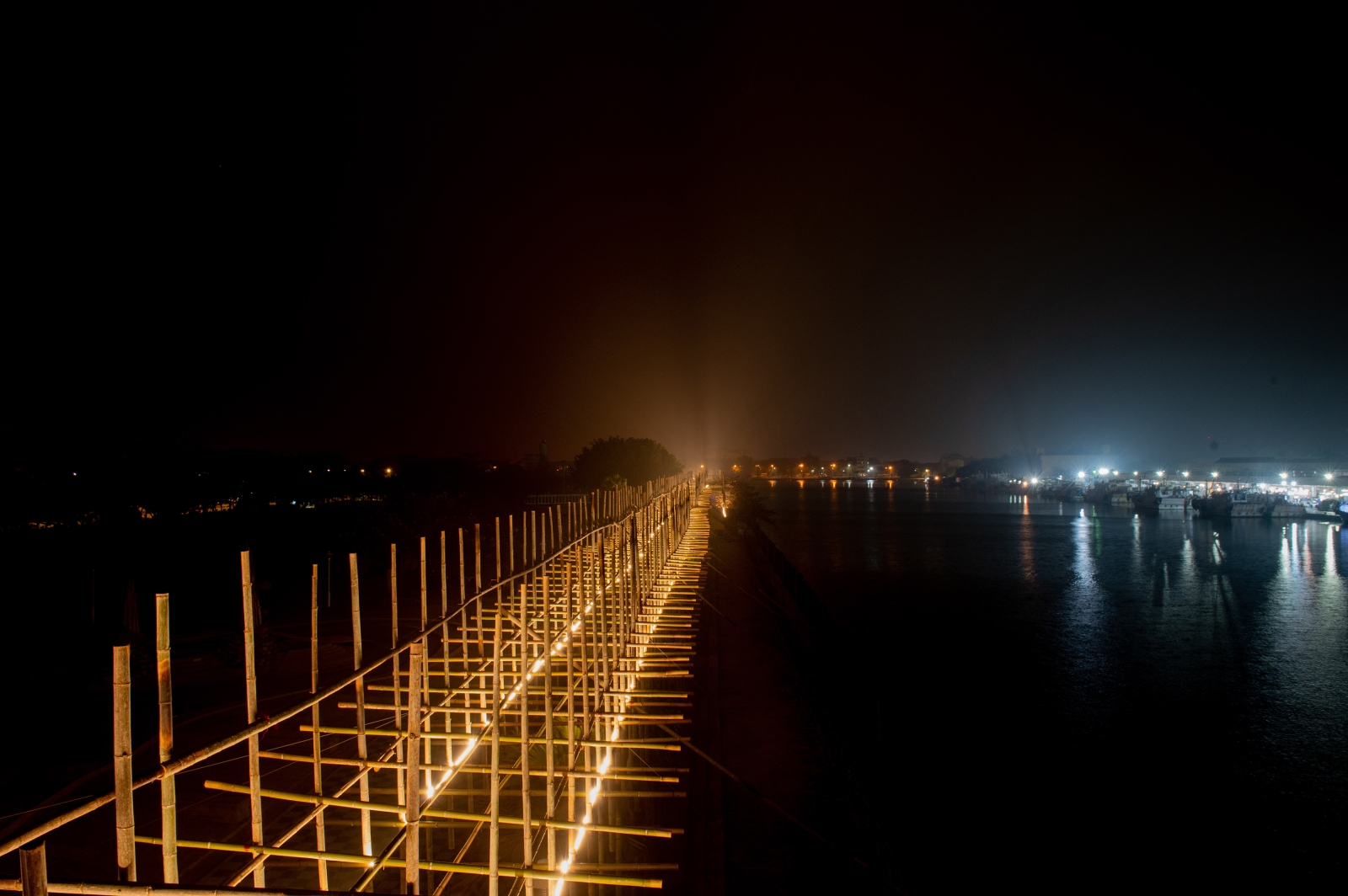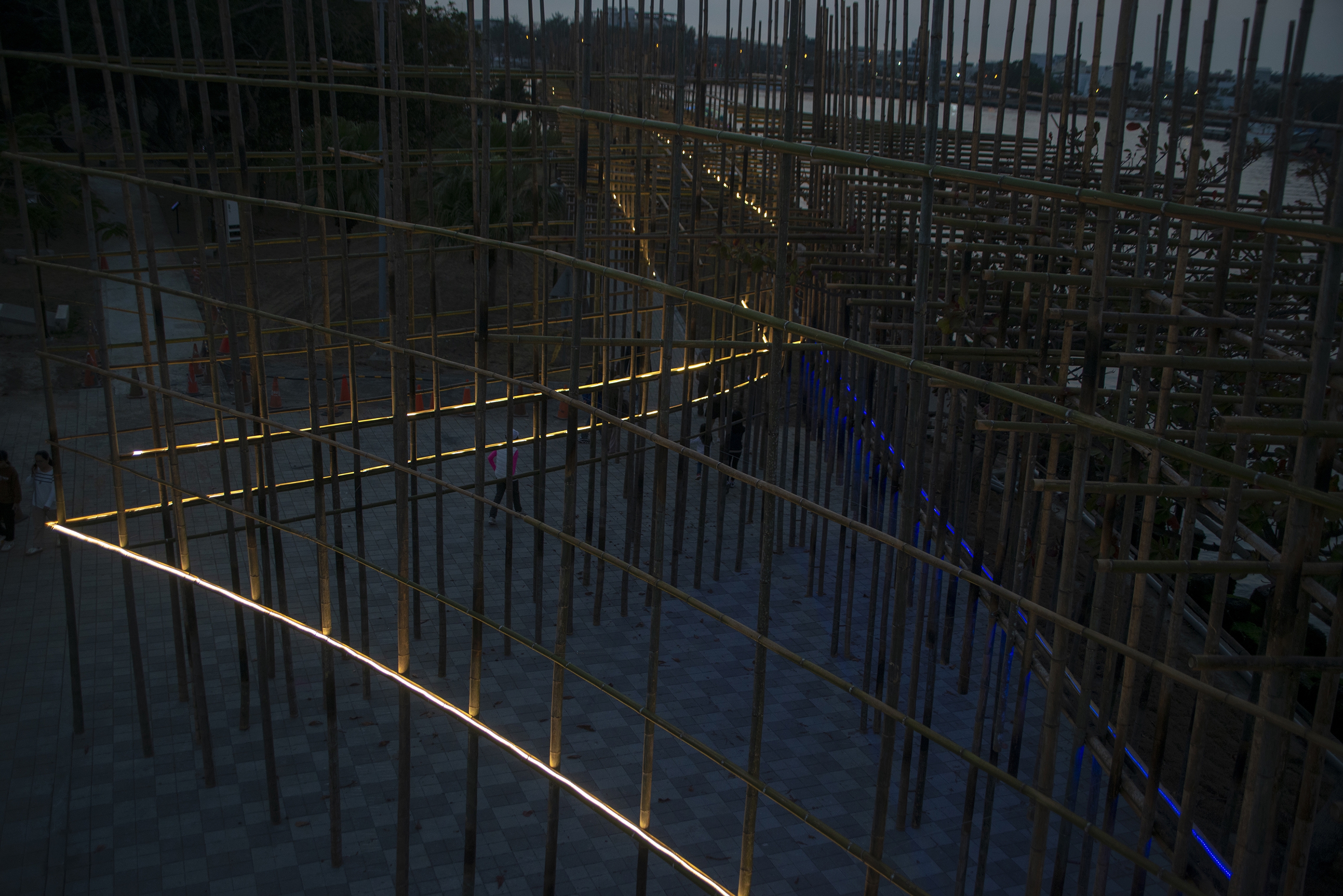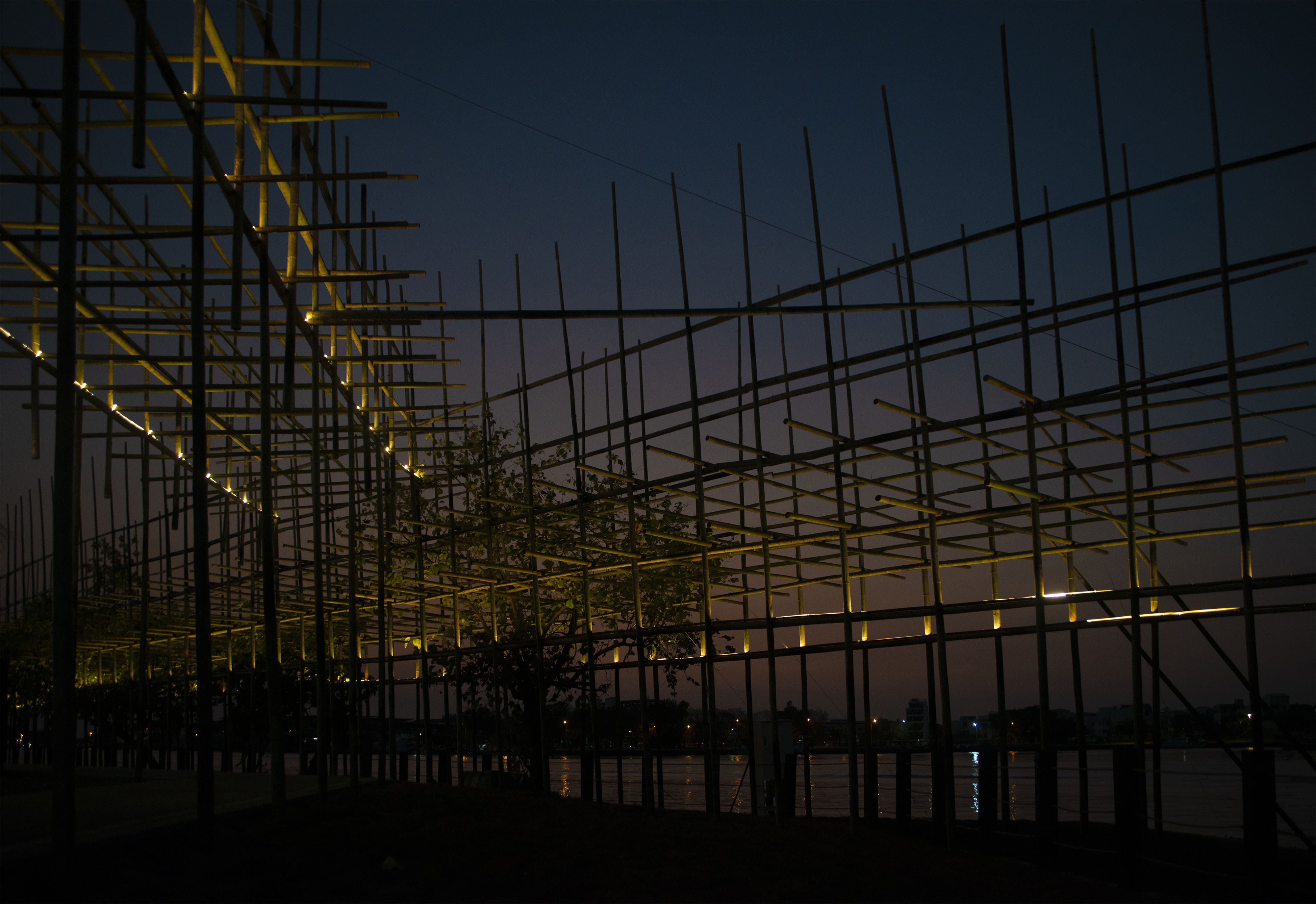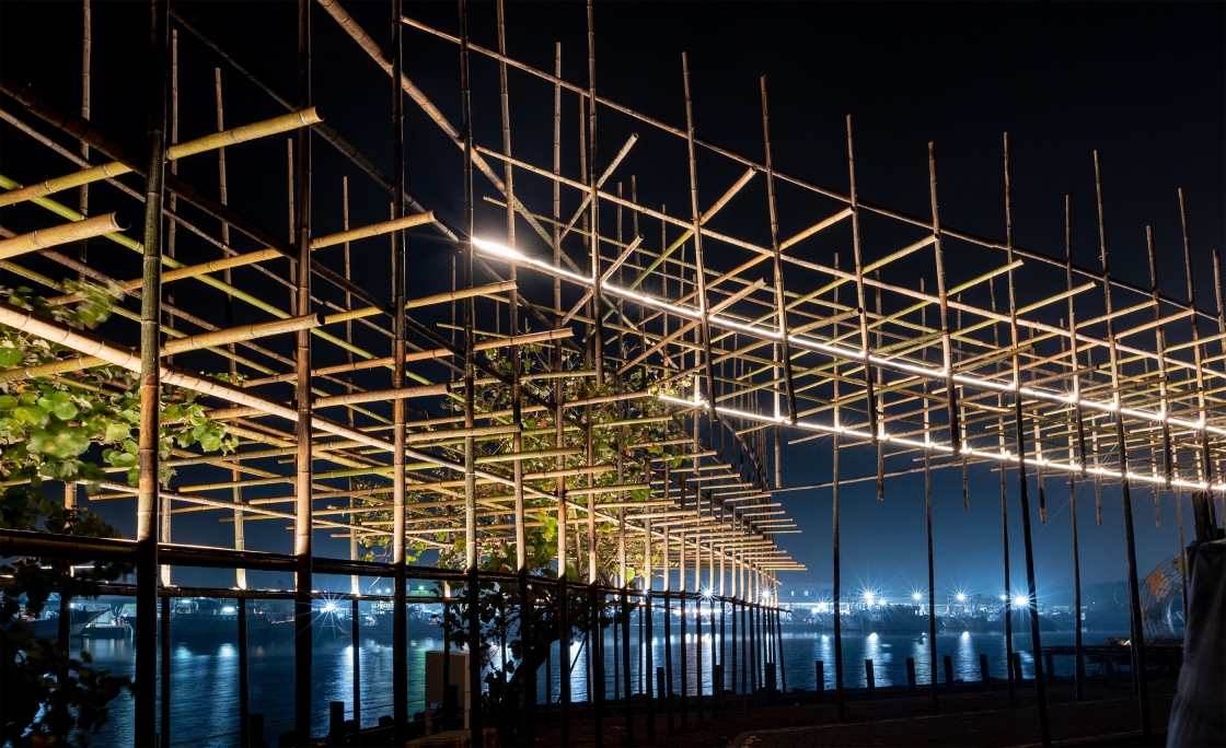 The flickering effect of the lighting design also echoes with the local activities, such as the flashing signal lights at the exit of the sea, the lights at the port, and the searchlights at the late-night fishing market. When people look back from the other side, they could see a massive yet light bamboo structure emitting warm lights. It becomes a poetic manuscript-like silhouette visible from afar at night.