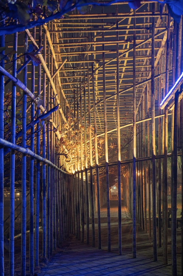 The overall lighting design of the work takes bamboo as the carrier, and the light bar is placed in the half-cut and hollowed-out bamboo, and the position and angle of lighting are designed according to the appearance of various trees in the site, so that the linear lighting placed at different heights can reflect the outline and shape of trees. This design aims to let the trees become the main source of lighting, without the need for artificial lamps, and the colorful halo reflected on the sidewalk by the back of leaves after illumination can set off a leisurely walking atmosphere.