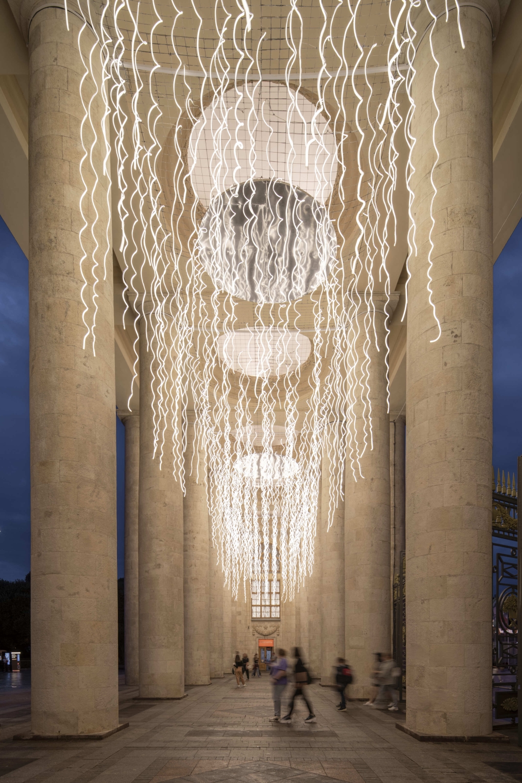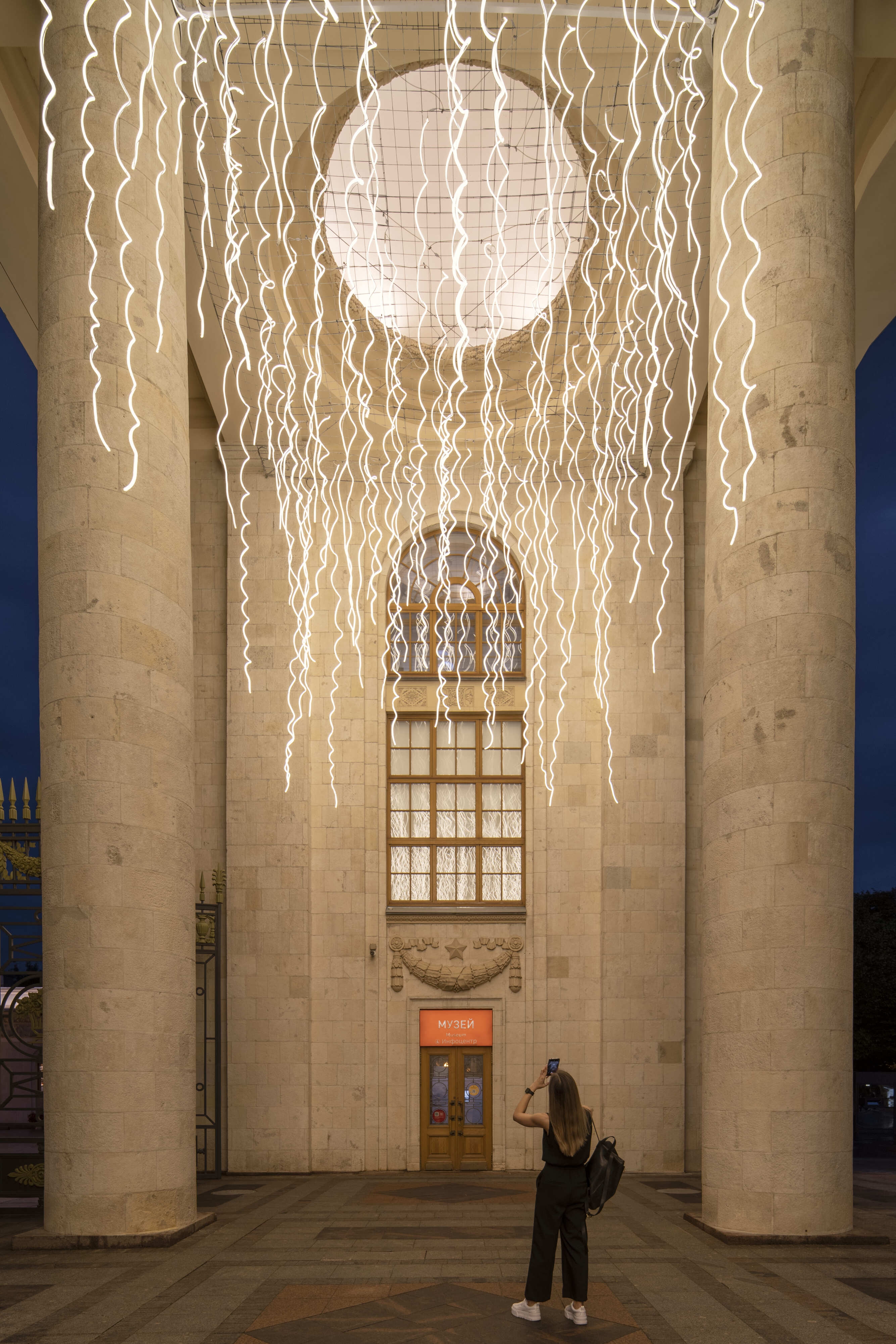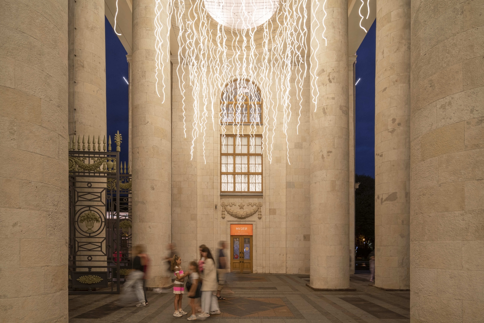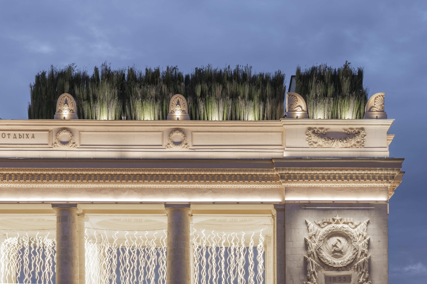 Reflecting the historical heritage, 550 sheaves of meadow grass cascade on the roof, representing the past. The Stalinist Empire-style arch embodies the present, symbolizing permanence and the continuous flow of time. Beneath the arch, the future takes shape through a light installation by KULTURA SVETA, featuring 520 neon elements resembling roots or neural networks.