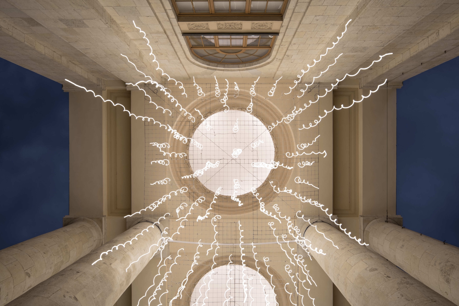 The installation visually narrates the passage of time, from the past through the present, and toward an unknown future.