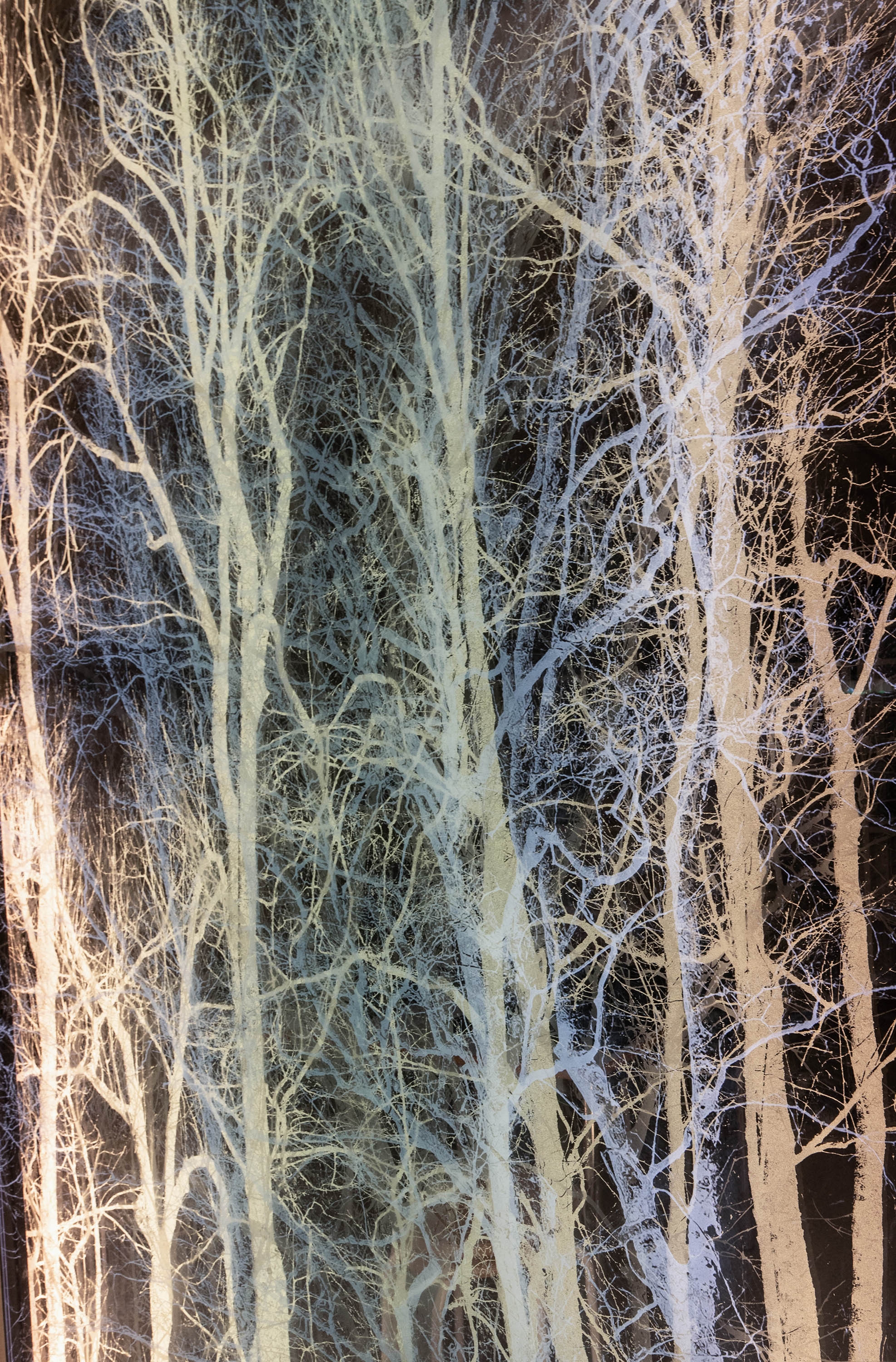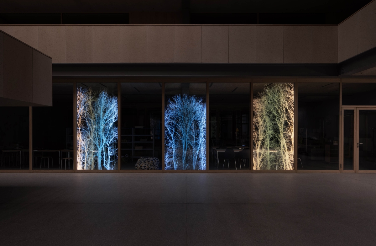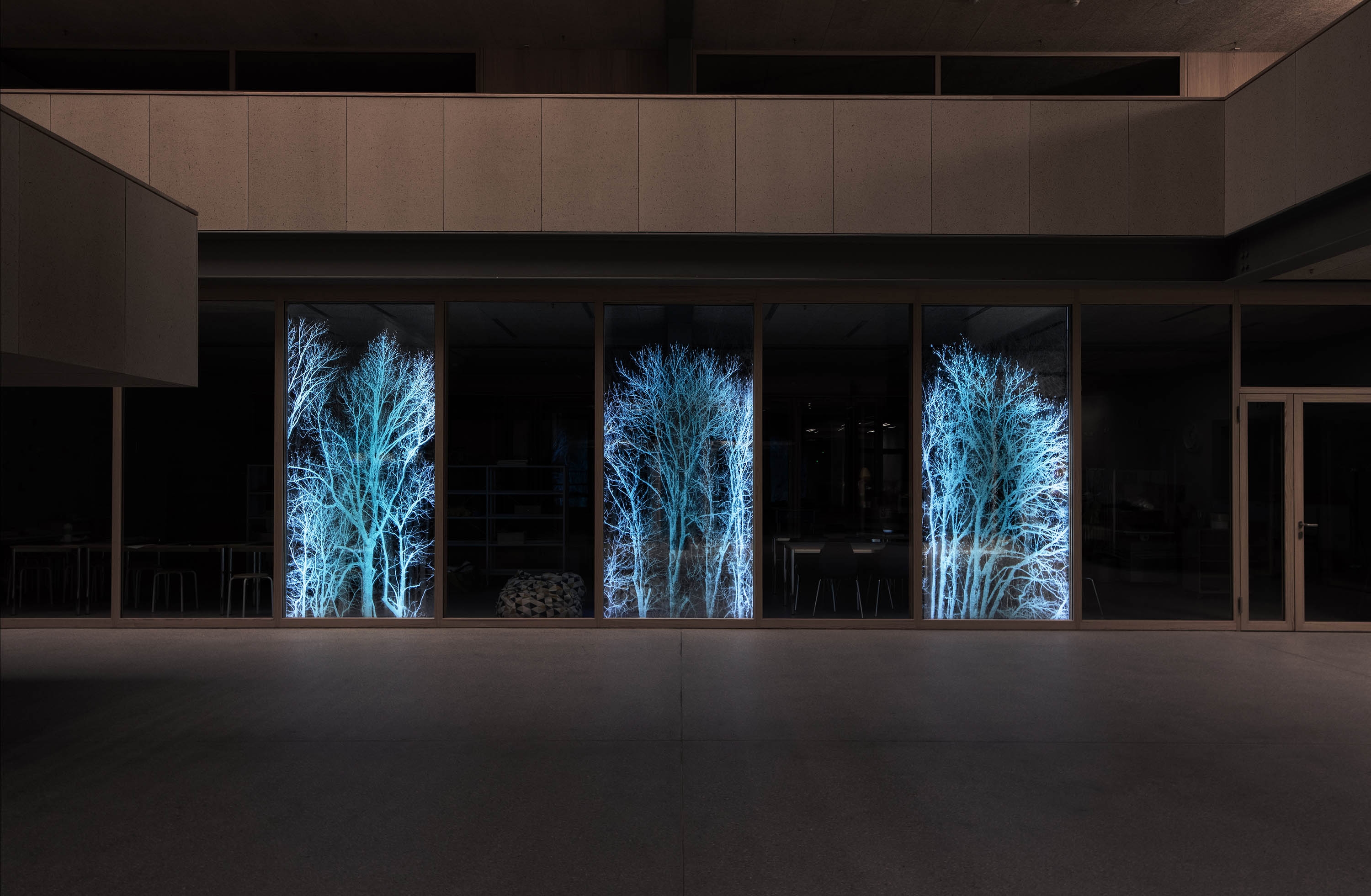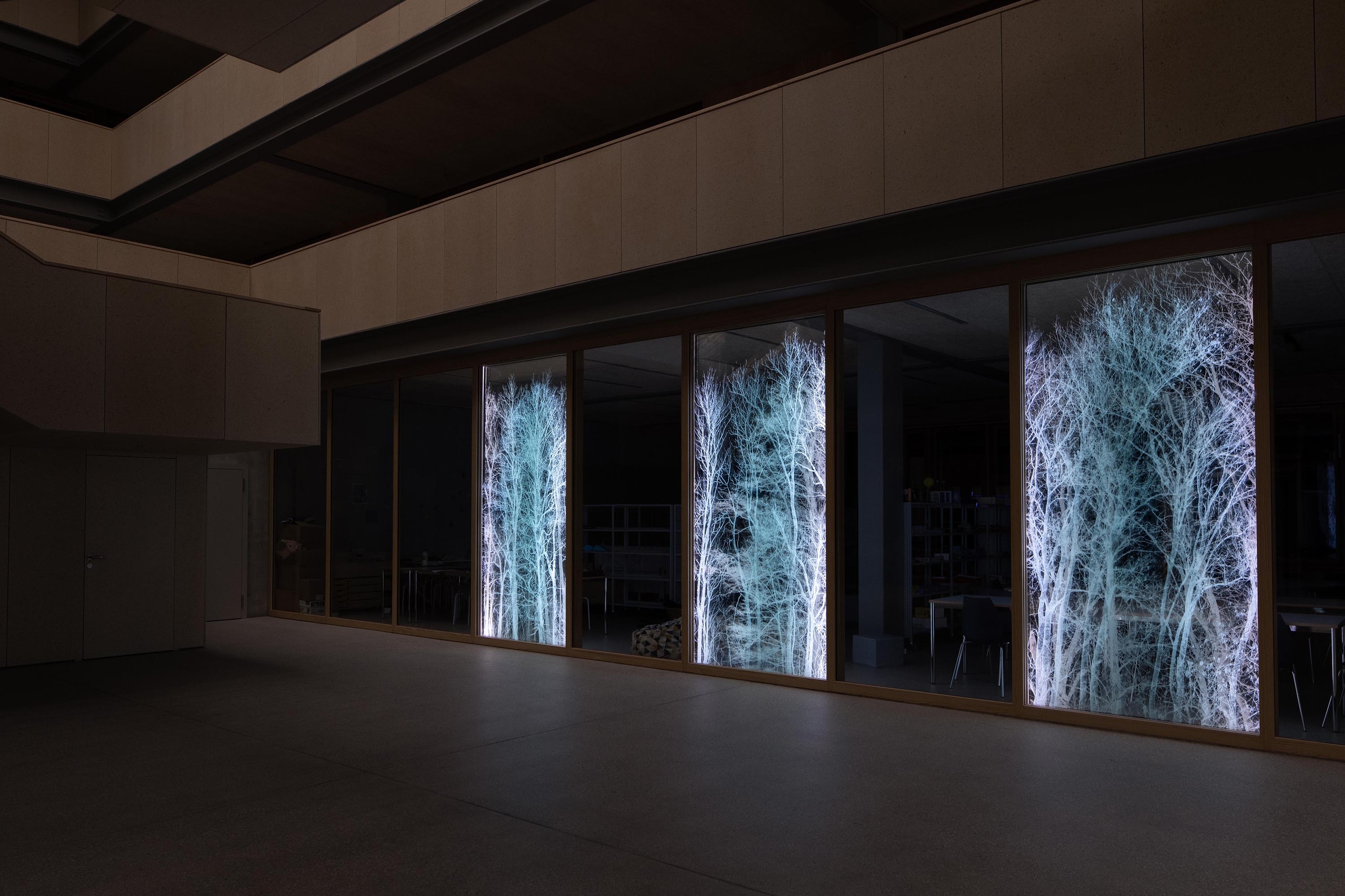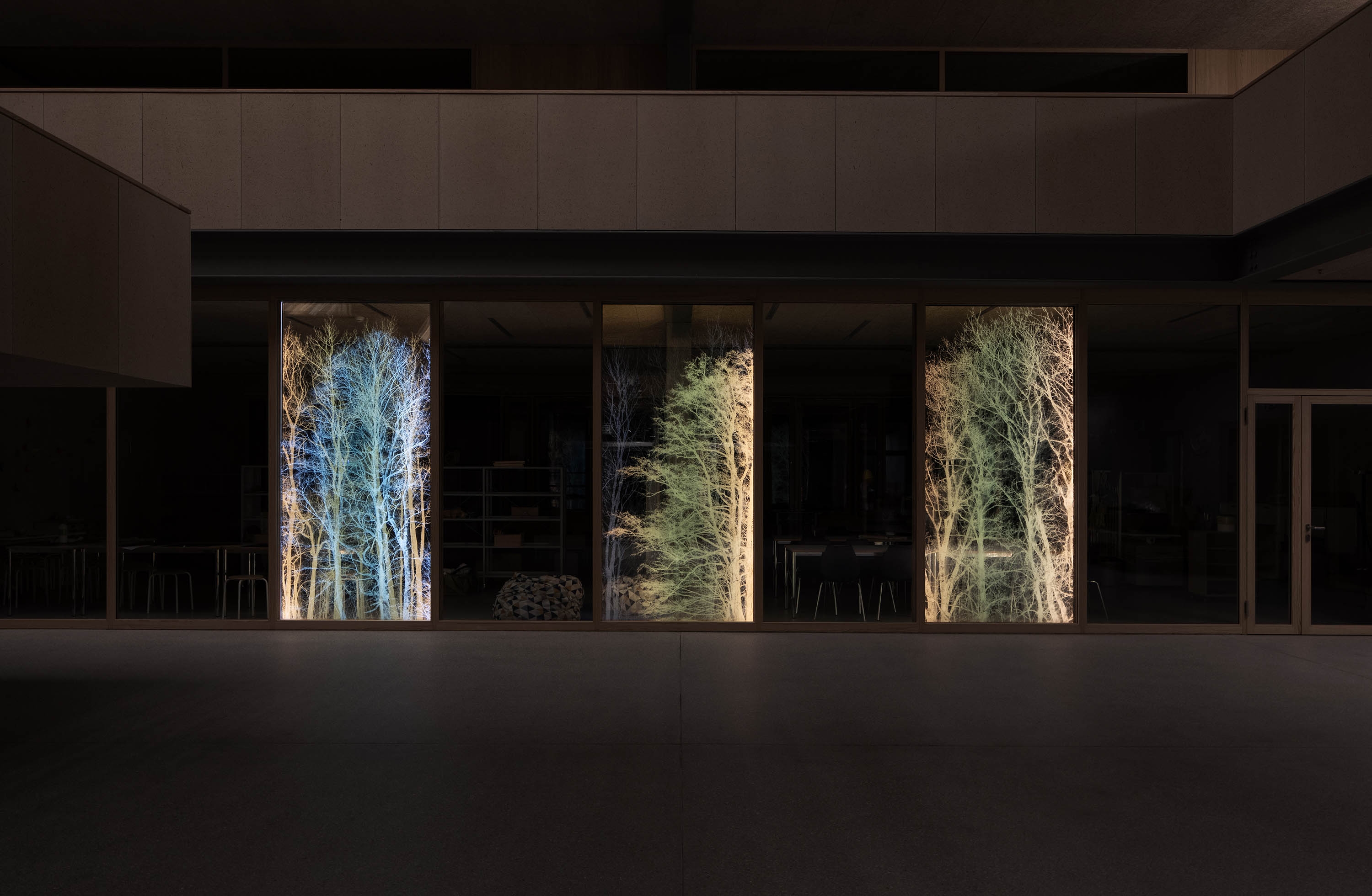 On each element, three monumental glass plates (1700mm x 3000mm), placed one behind the other in the thickness of the wall, are laser-engraved with images of trees. Arranged in successive layers, these plates/trees are superimposed to form a forest, animated by side lighting (dynamic whites LED)on each edge of the panels. The engraved patterns catch the light, which in turn illuminates one or other of the panels. Trees appear and disappear like spectres, in a kind of hypnotic, meditative “fade-out”.