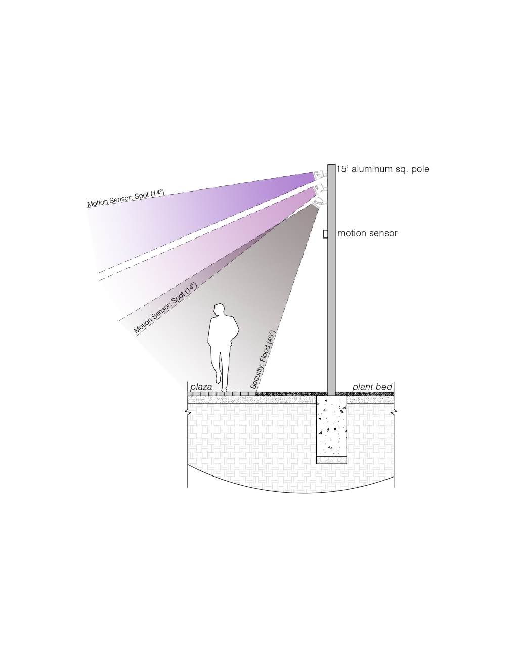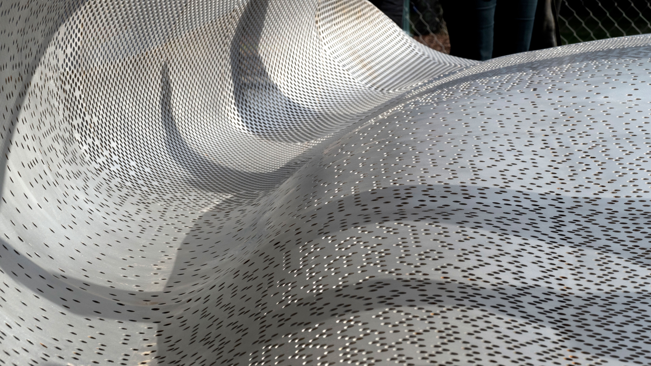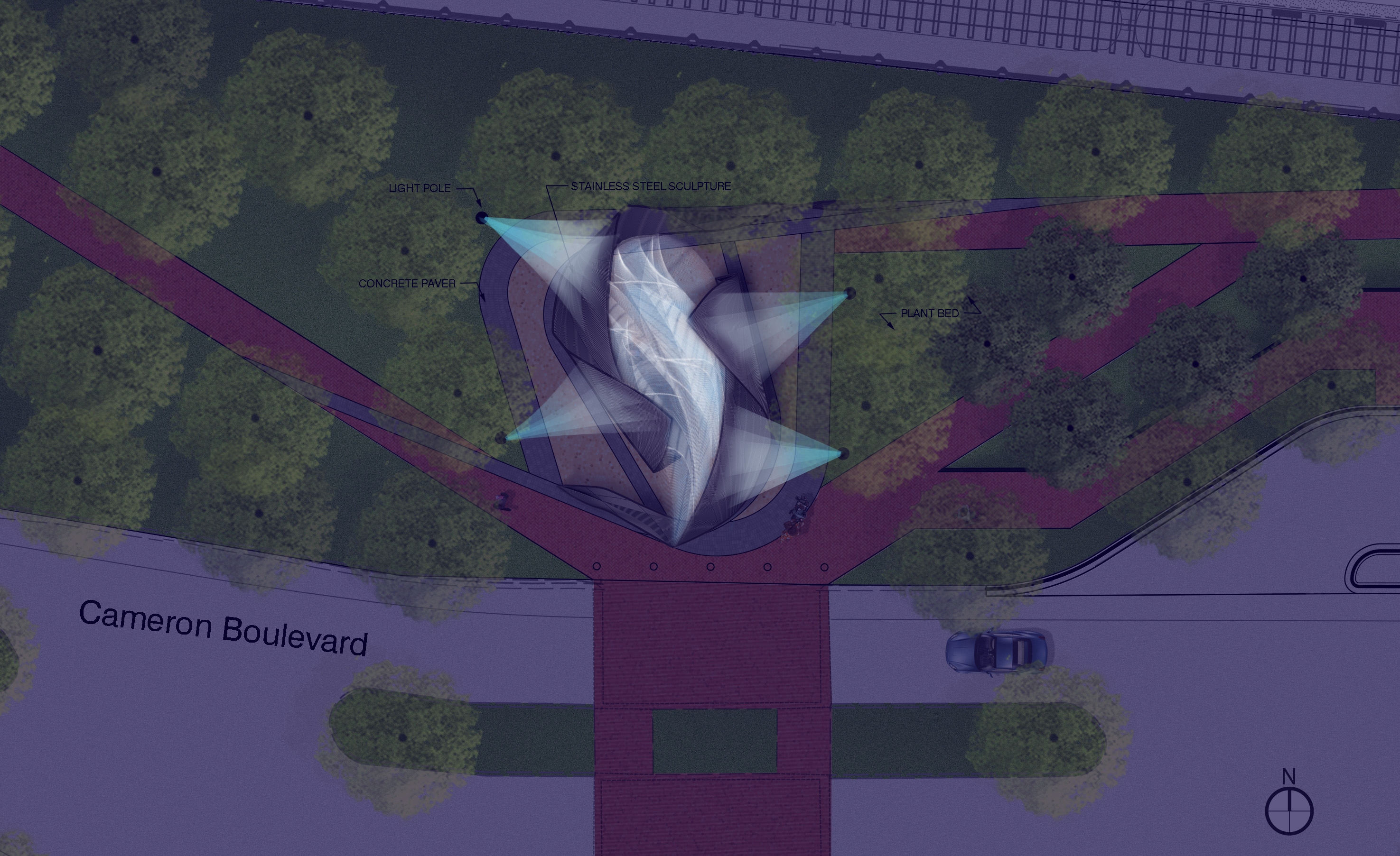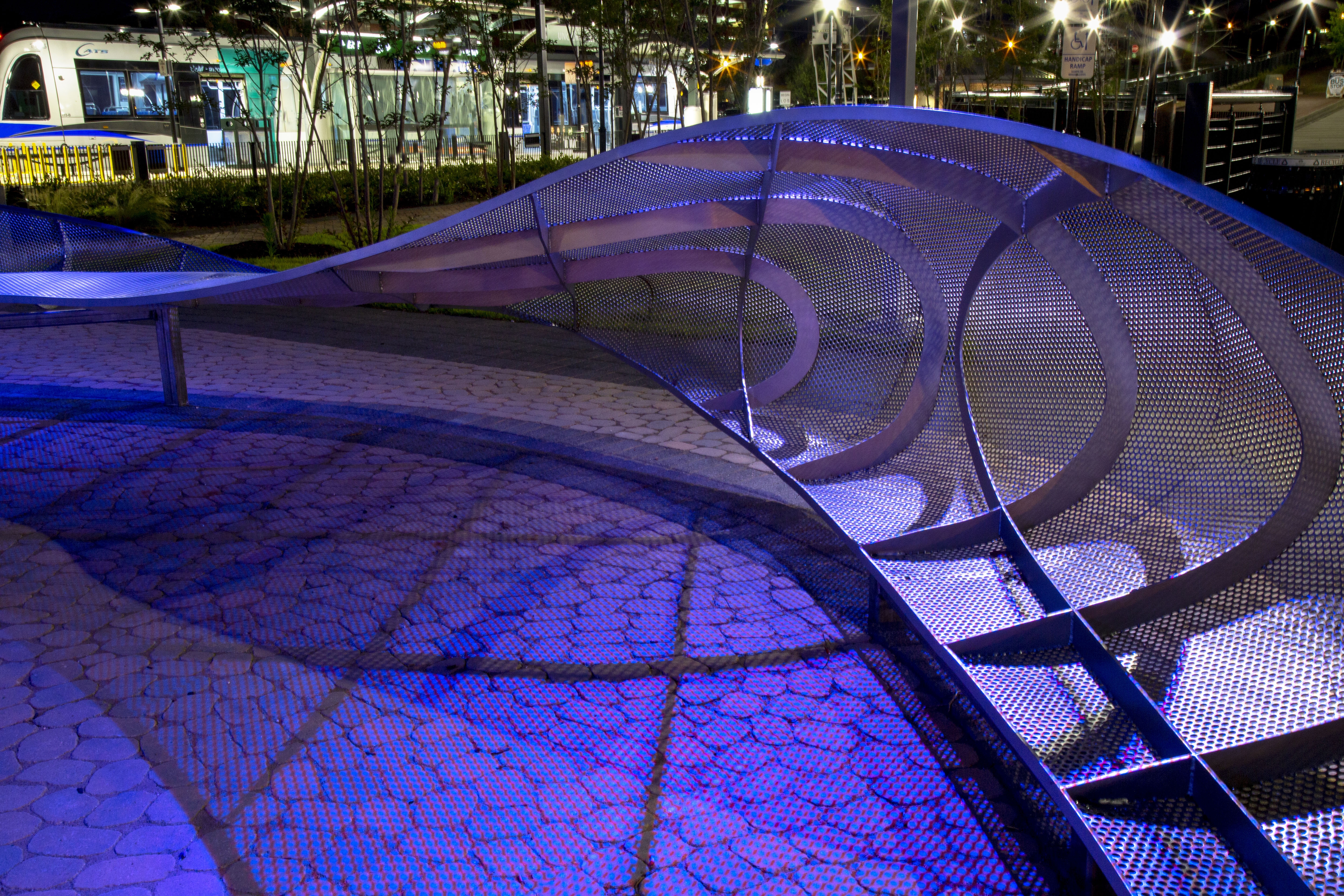The undulations of the custom-textured and perforated steel sculpture lead students and visitors to a central space defined by an inner core of light and shadow. Interactive lighting elements engage students and viewers, drawing them into the center of the plaza with a dynamic shadow pattern. The color and white light fixtures, affixed to four grey poles, surround the sculpture and inform the people waiting in — or passing through — the plaza after dark. During the day, natural light passing through the sculpture creates shadows, reinforcing the theme of transition. The sculpture folds and bends to encourage seating and engagement.
