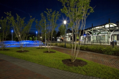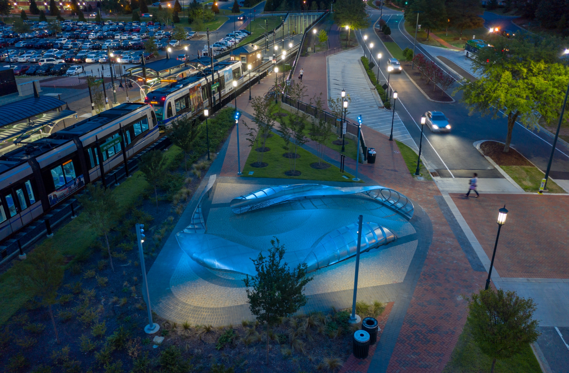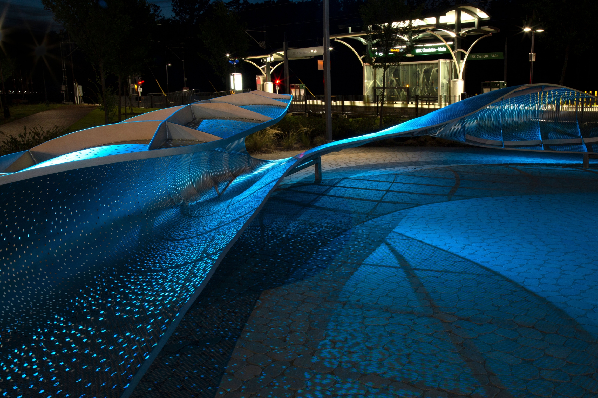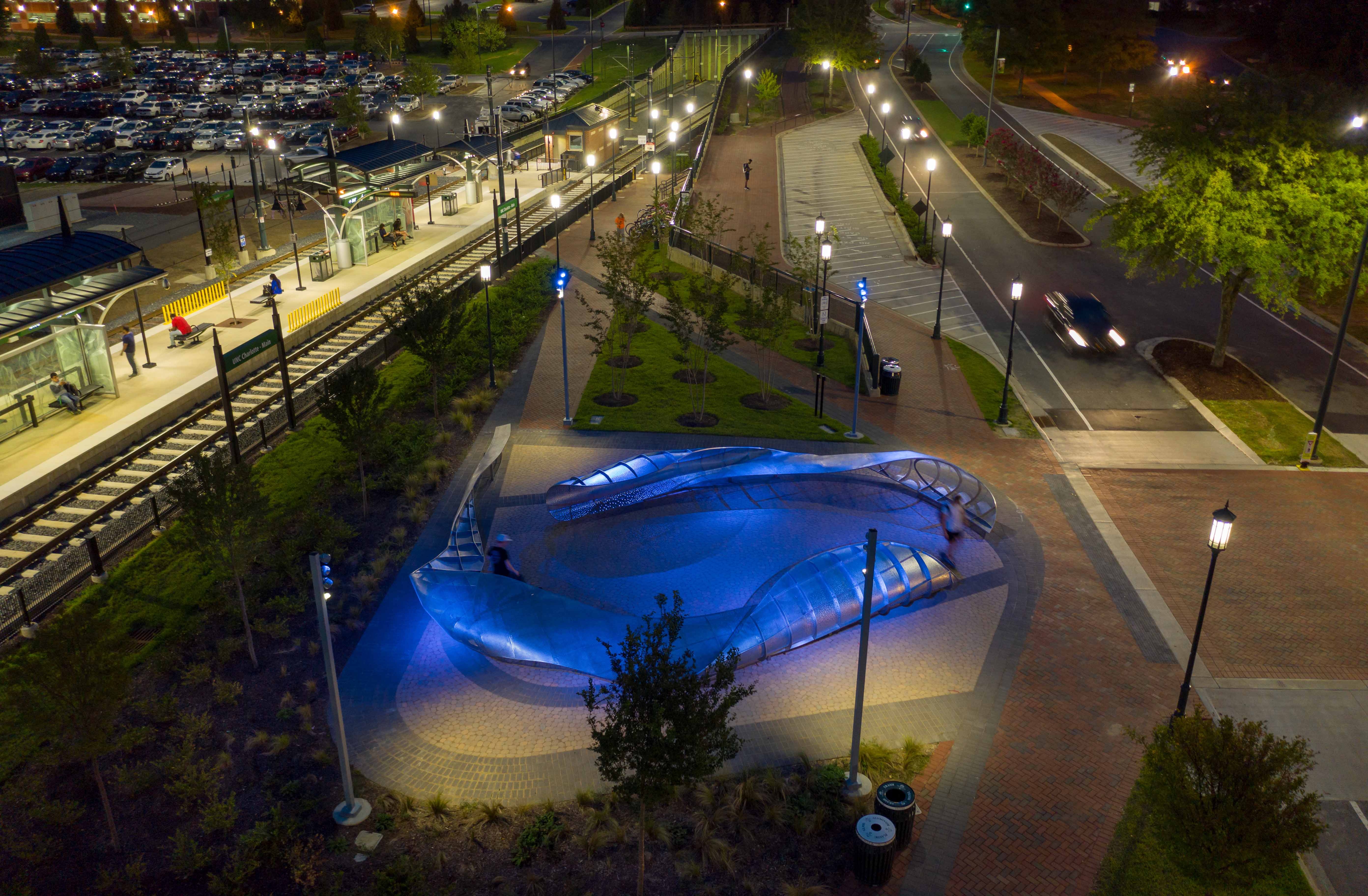 As Charlotte extended their public transit system, they put out a national call to artists to integrate art into the LYNX Blue Line. Mikyoung Kim Design was commissioned to create a sculpture at the UNC Charlotte station. The design concept originated in the spirit of university learning: abstracting the idea of a core of knowledge to communicate a message of movement, connectivity, transition and flux. The result is a series of enveloping, stainless-steel shadow screens, dynamically lit to transform the plaza into a shadow play environment.