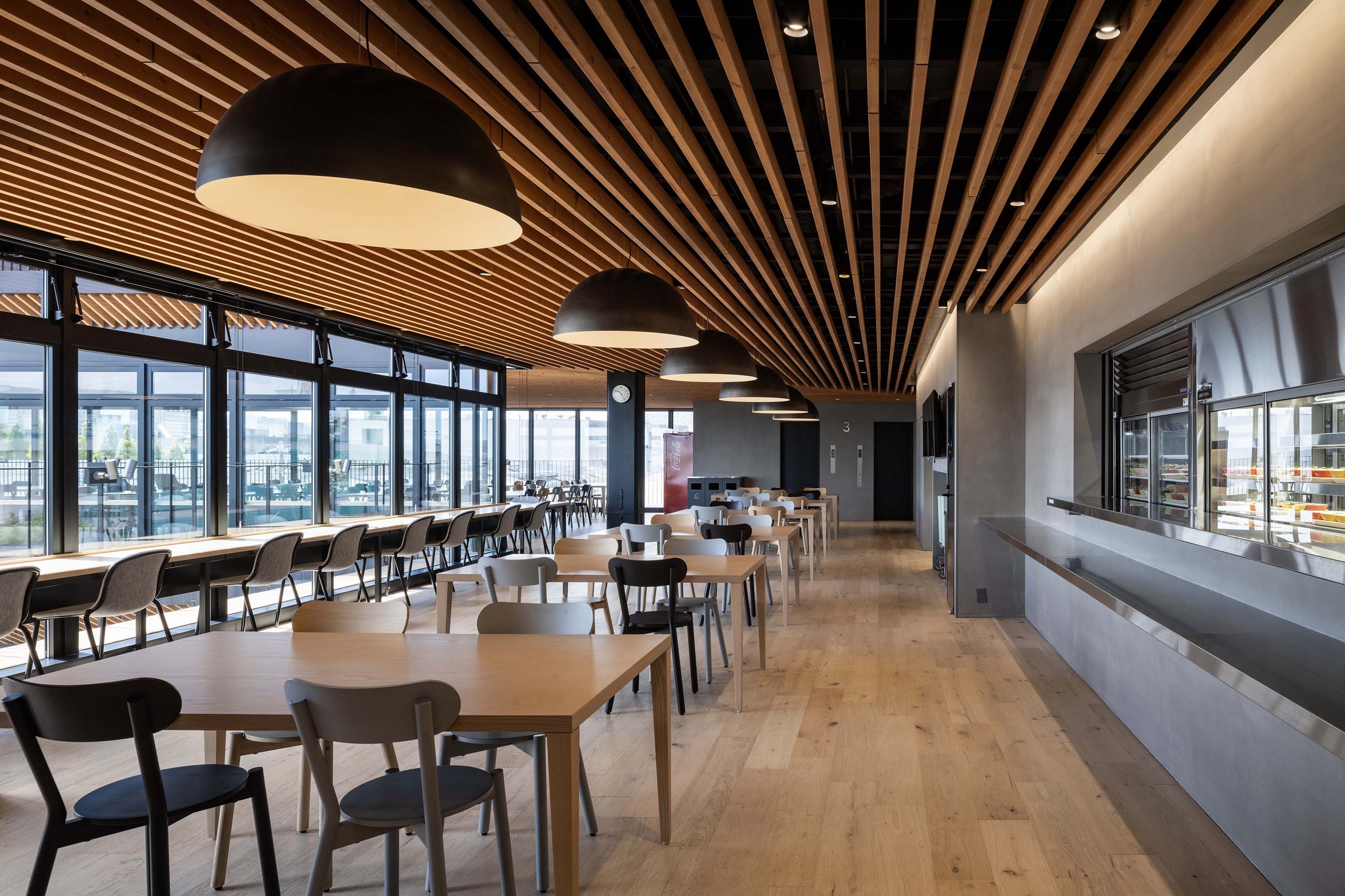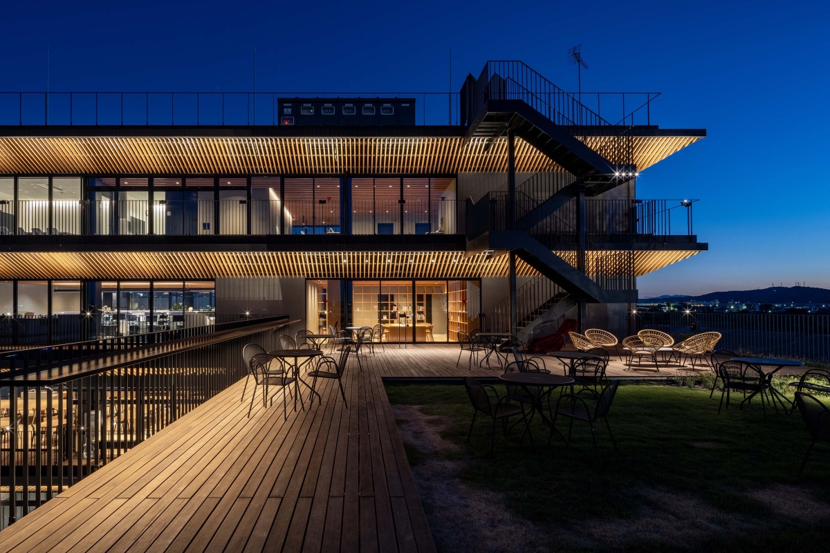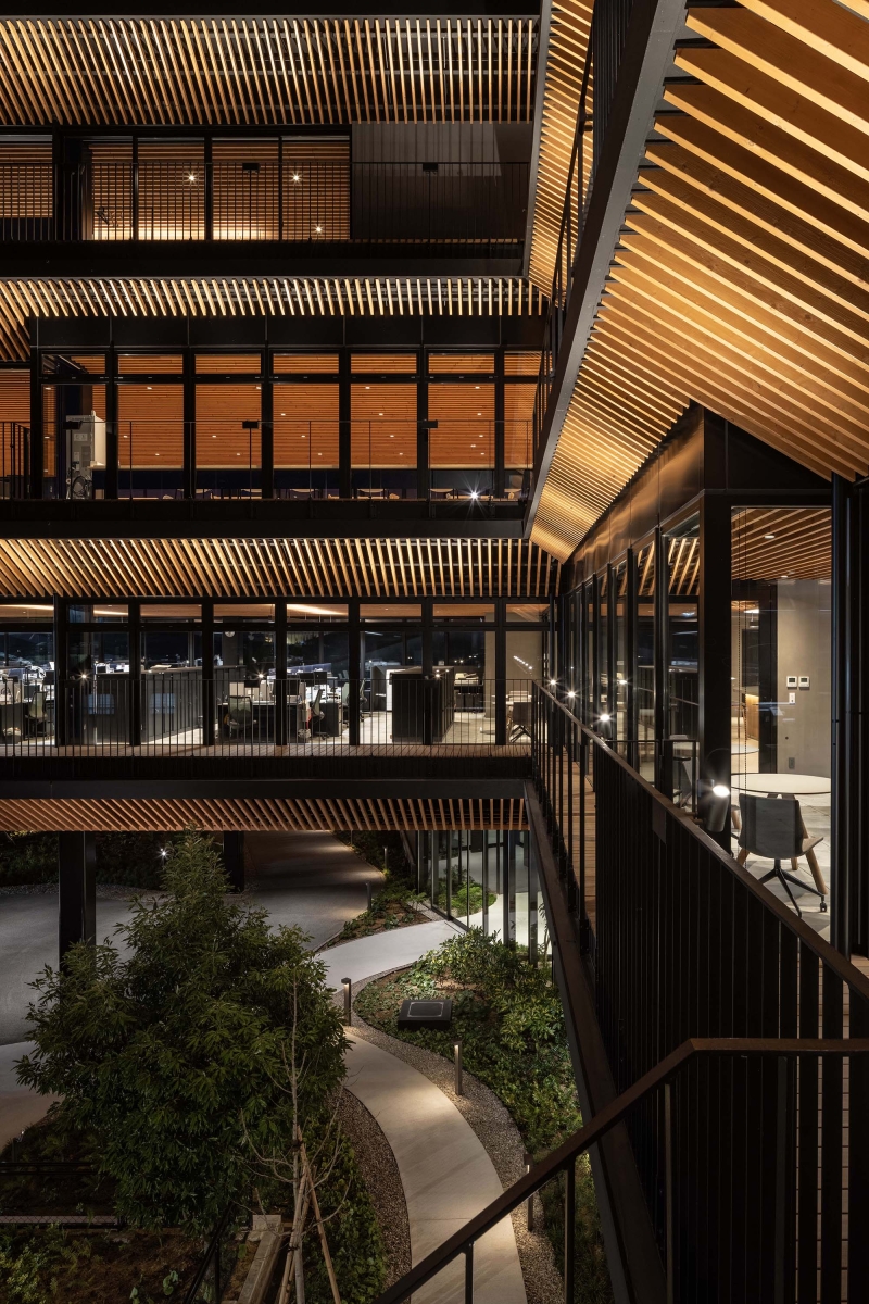 The facade lighting scheme highlights the wooden louvered eaves, enhancing the headquarters' symbolism and creating a warm, natural atmosphere. This lighting also transforms the factory complex's landscape, typically inorganic.