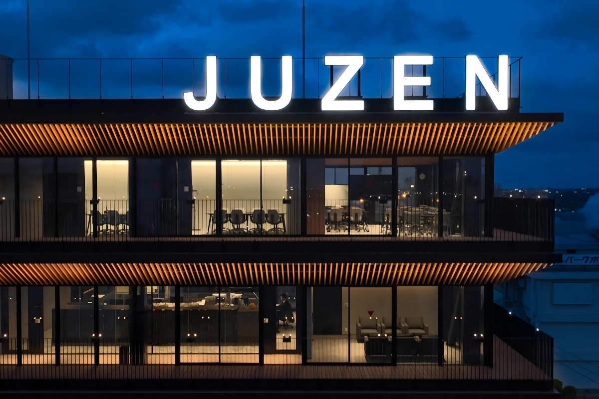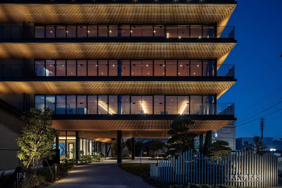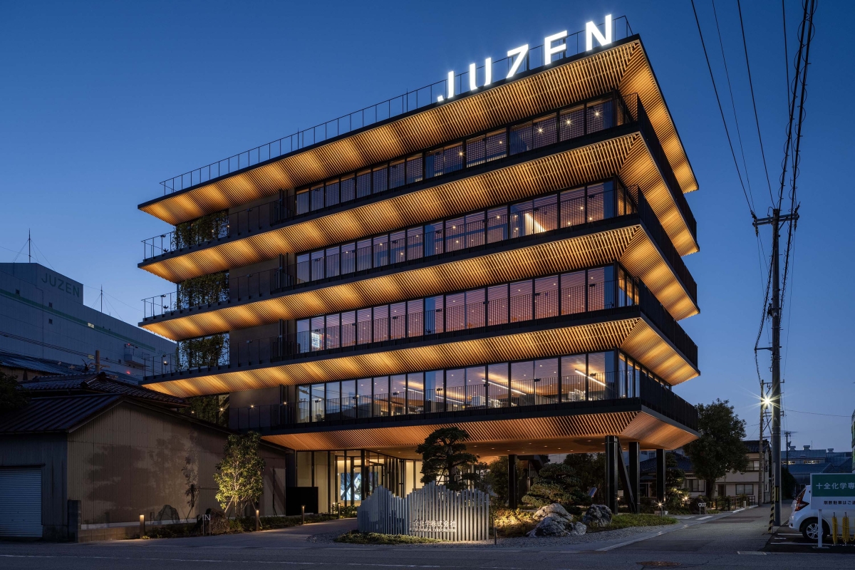 Entry DescriptionJuzen Chemical, located in Toyama City, Toyama Prefecture, designed a new building to serve as the headquarters and a relaxation space for employees. The layout includes an entrance, lobby, main offices, cafeteria, executive offices, open-air balconies, and conference rooms. The all-glass facade provides views of the industrial park, Jinzu River, and Tateyama mountain range, symbolizing Toyama City. Wooden louvers extend over the facade to the eaves.