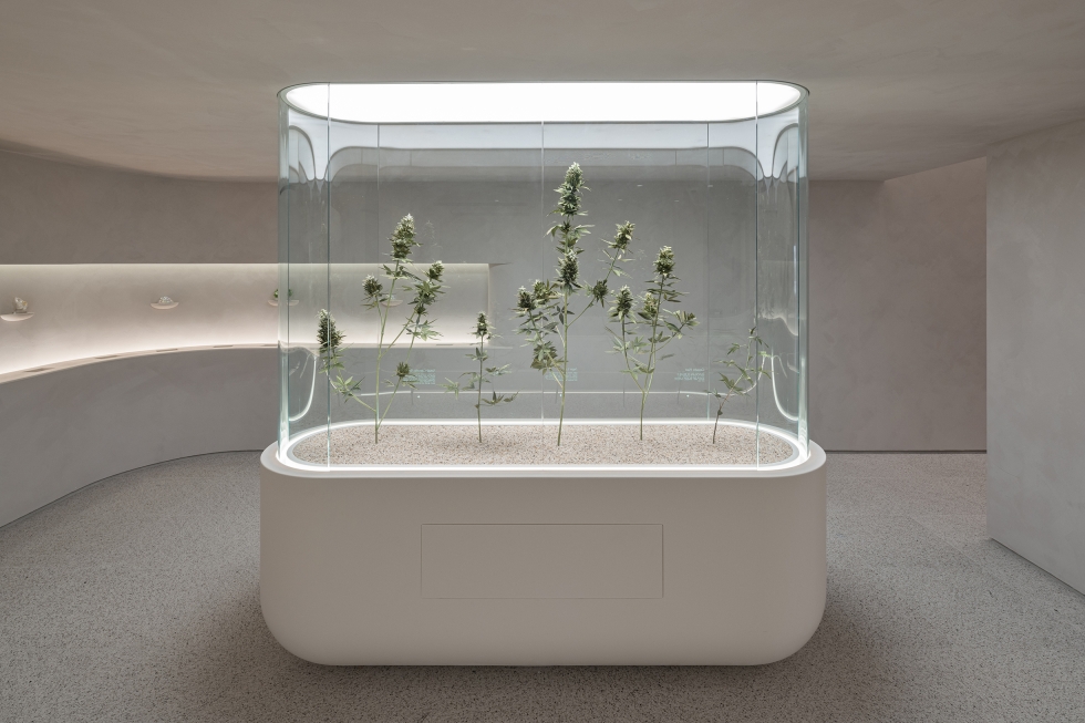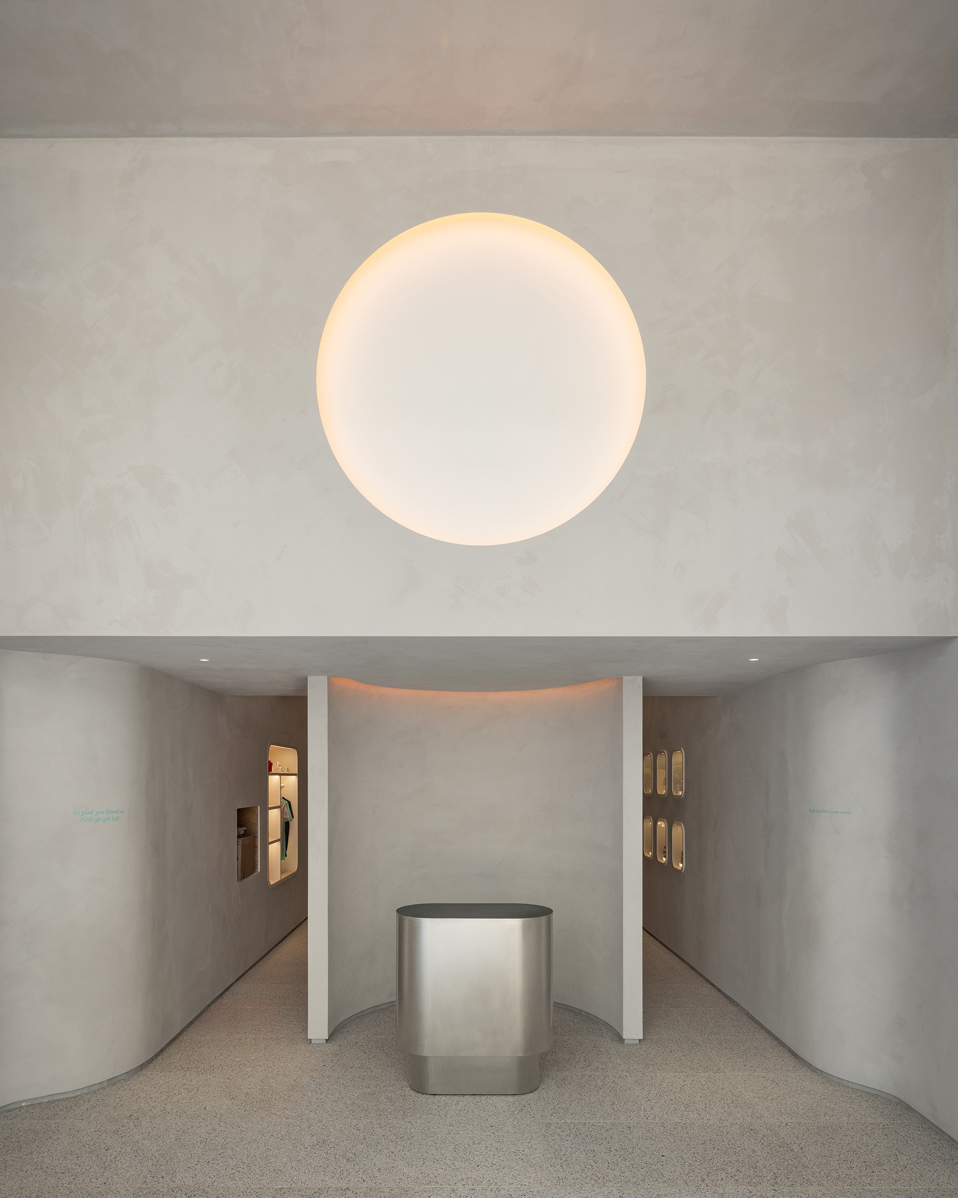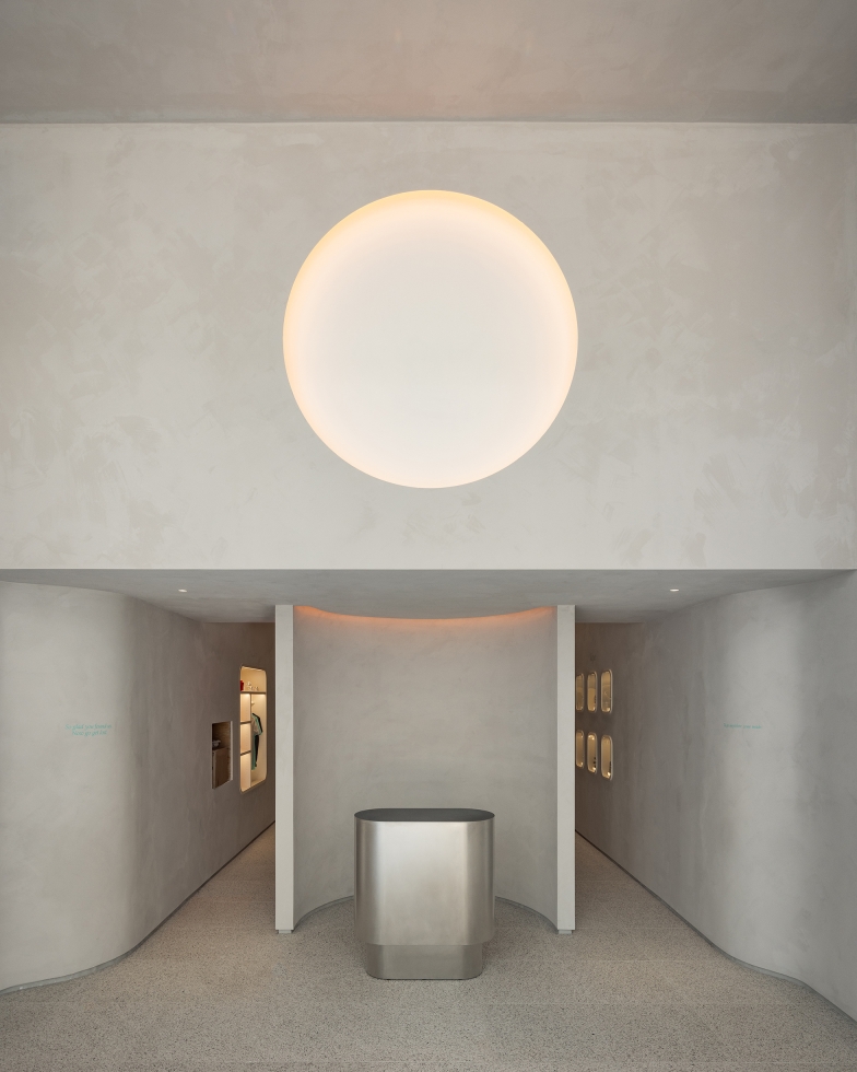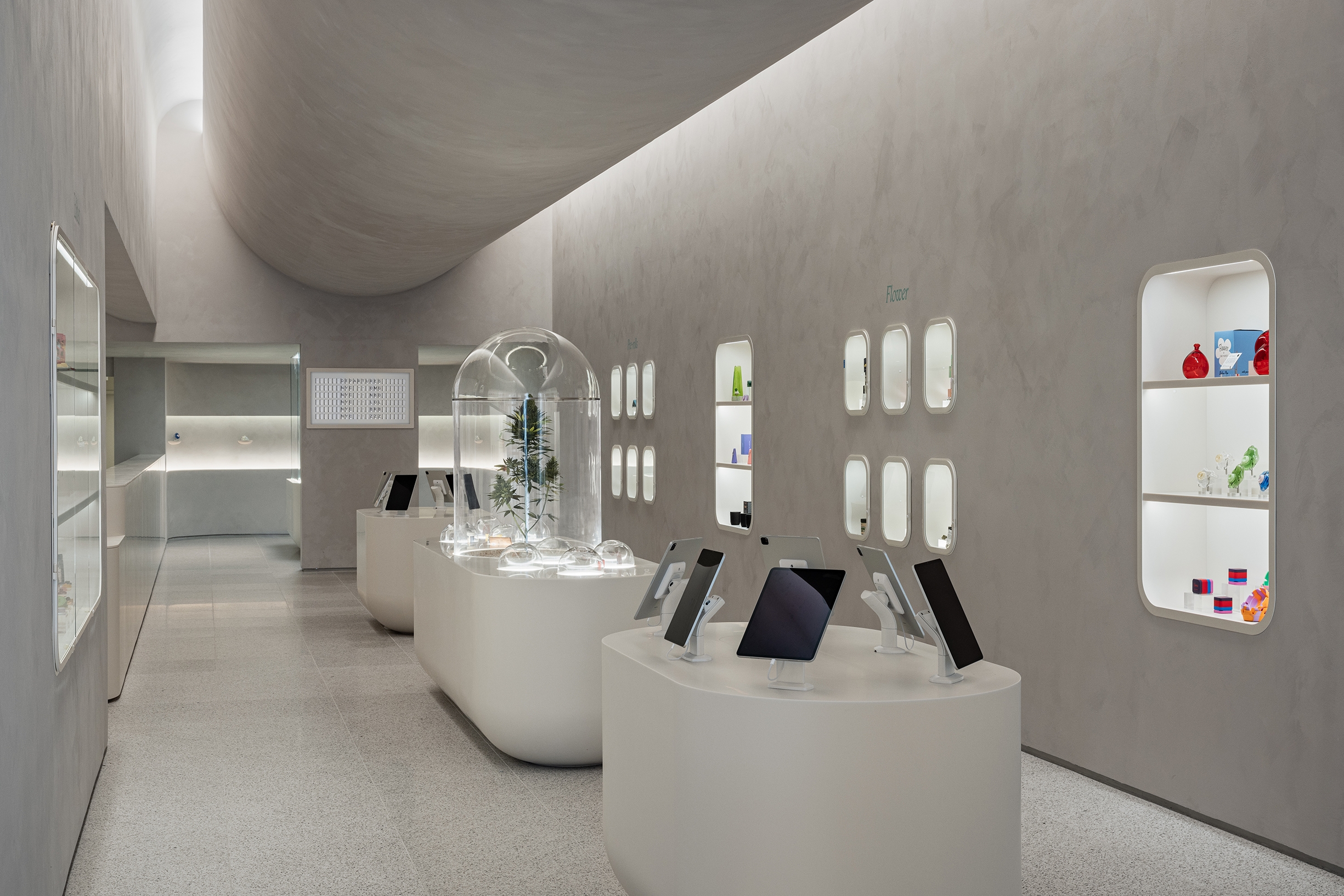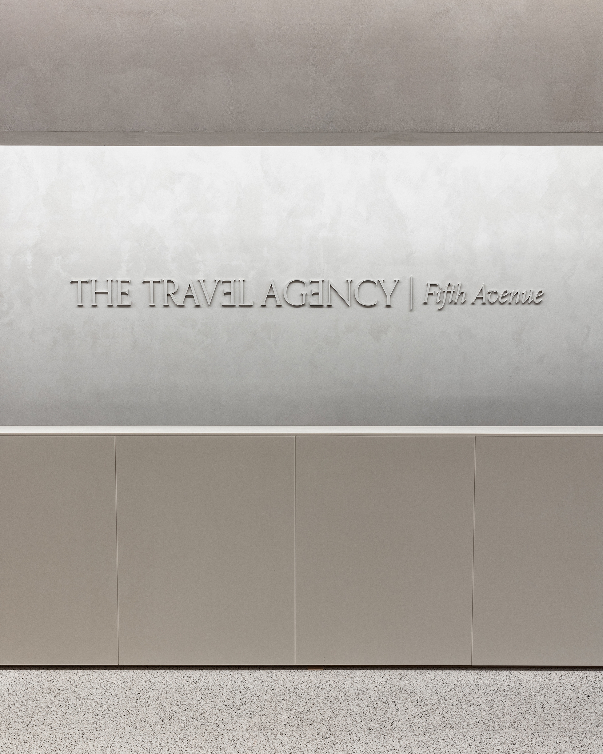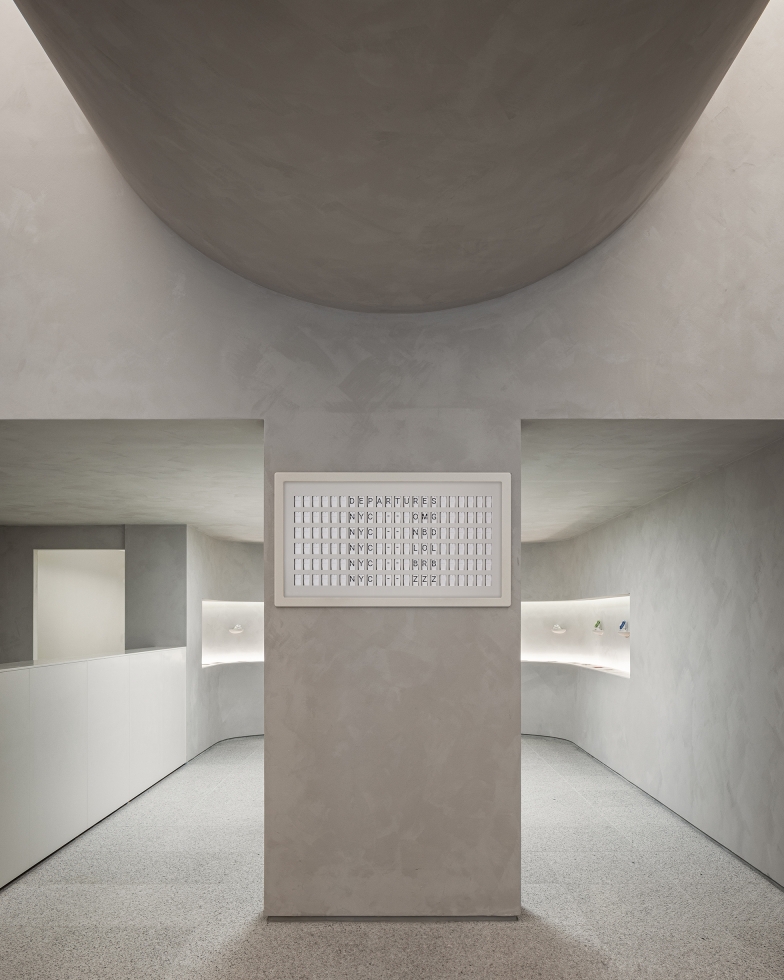 For the 5th Avenue location, the architecture is characterized by an inverted vaulted ceiling, where the central ceiling surface dips downwards, creating a unique spatial "belly." Light is subtly integrated along the upturned edges of this ceiling, leaking softly from a sloped reveal between the vertical walls and the hovering ceiling.