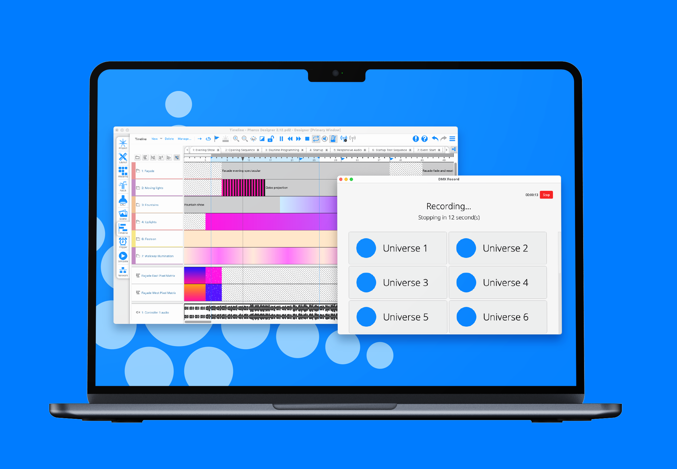 With DMX Record, a site's existing Pharos controller can handle special events which would otherwise require an additional control system. By using DMX Record, Pharos users can avoid emissions associated with hiring, delivering, powering, and operating a second control system.