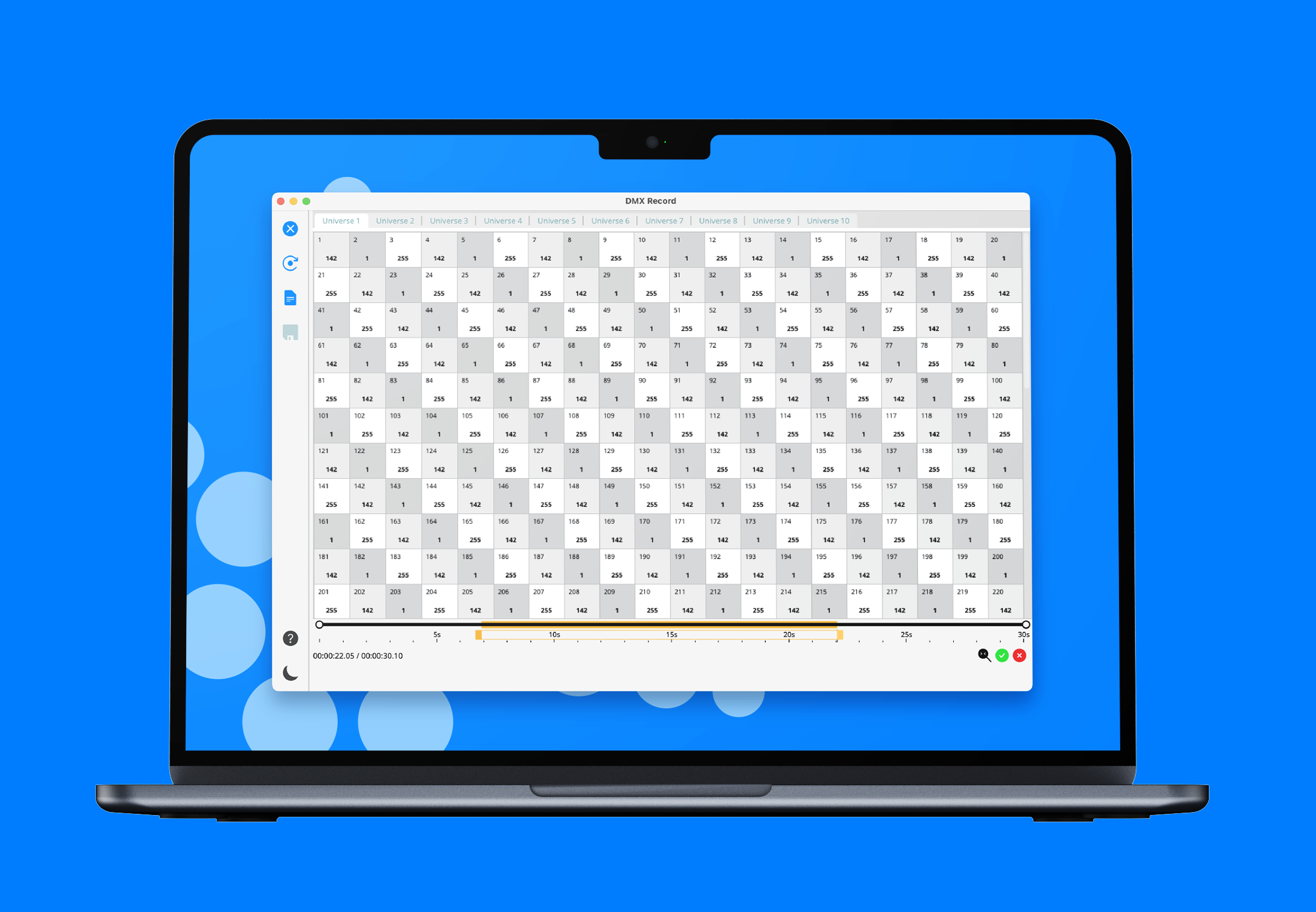 DMX Record can capture up to 16 universes of eDMX simultaneously, for up to 30 minutes per capture. Offering a huge level of flexibility, users can start and stop recordings based on specific channel values, manual triggers, or time-based criteria.