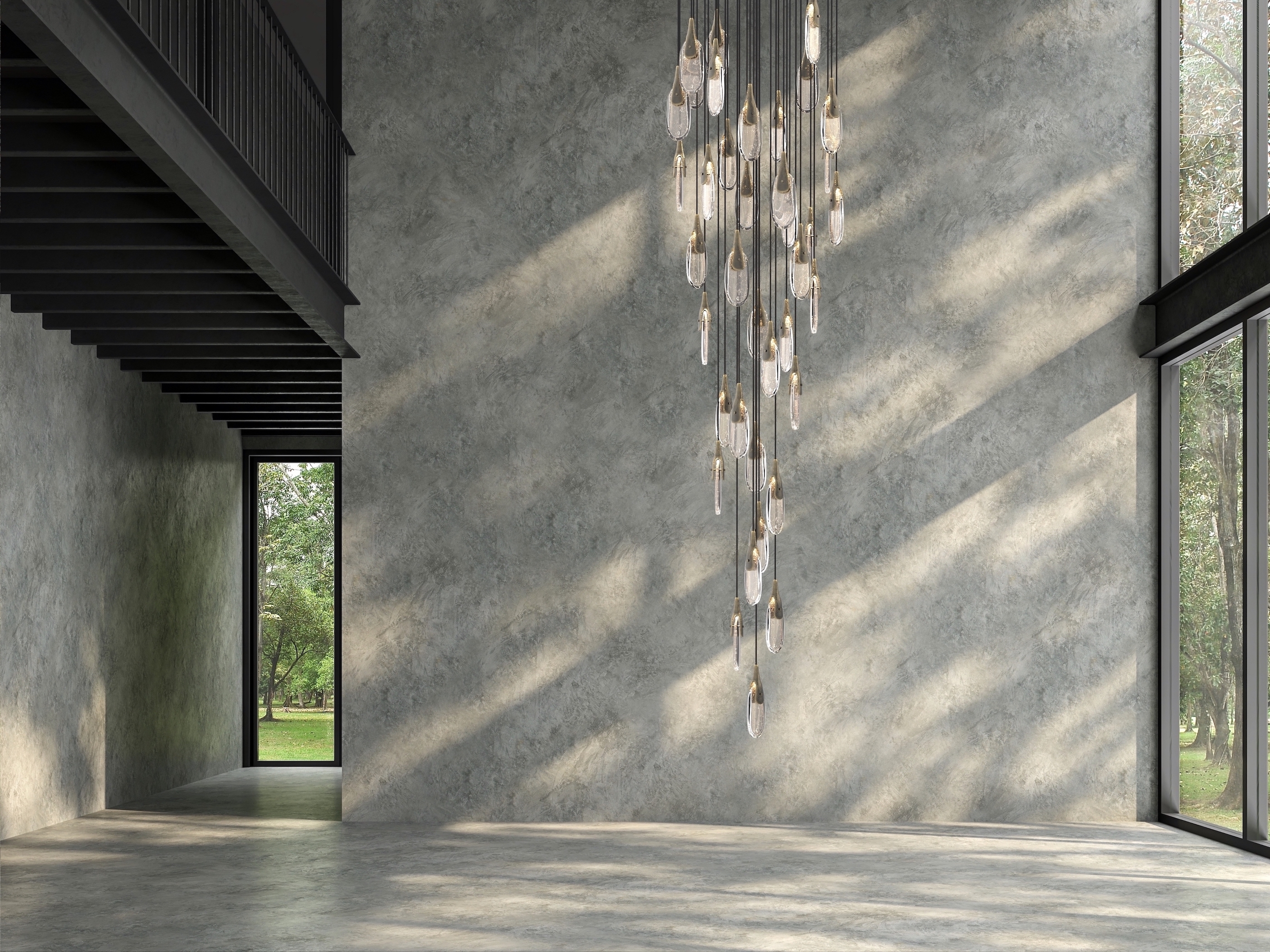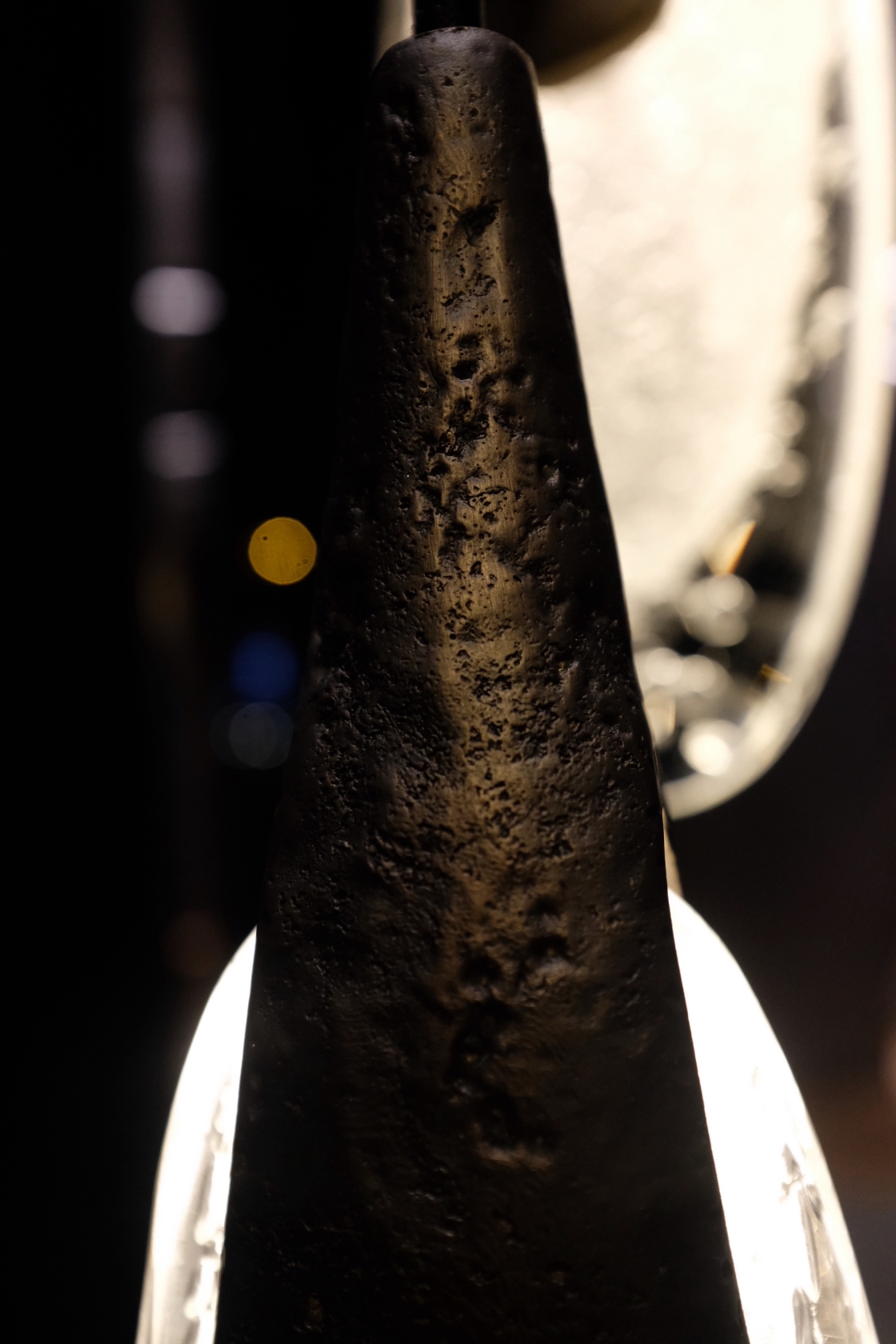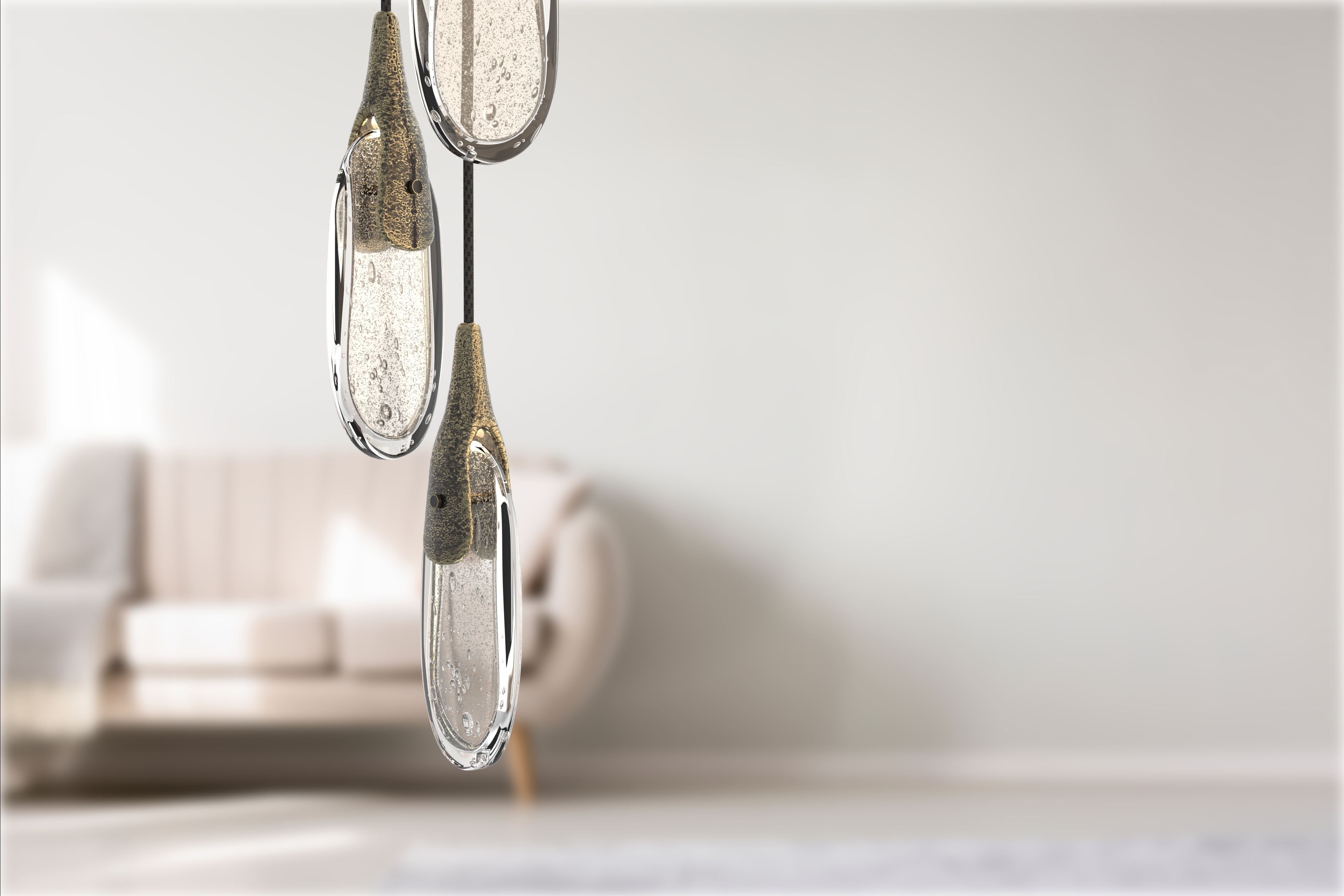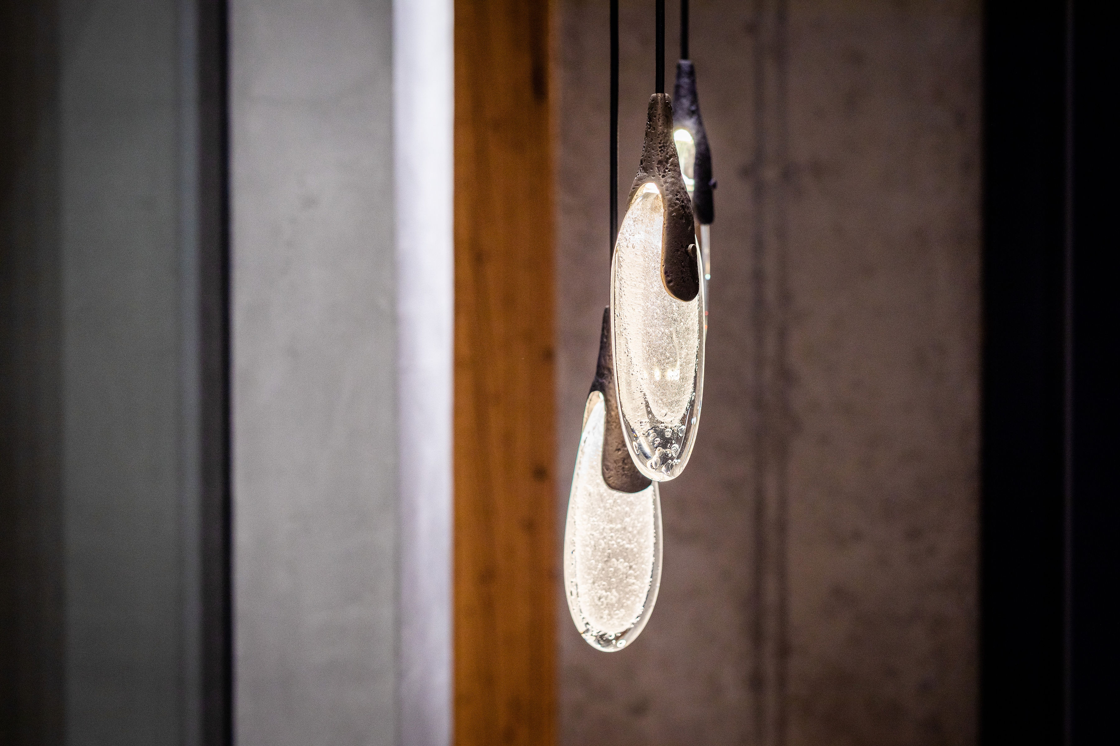 The installation is made up of unique components composed of two contrasting elements:textured brass casting, which is created by hand- casting in sand, and hand-formed crystal glass (clear or sparkling).