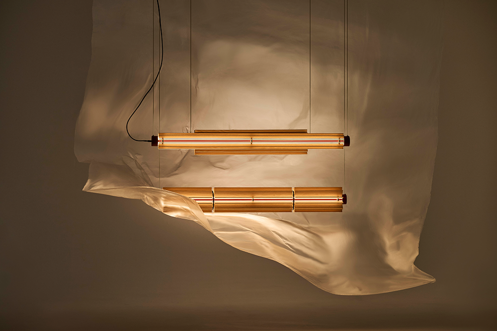 We discovered that the sense of multiple arrays evokes a familiar feeling in East Asian culture, seen in objects like water wheels, tea brushes, scrolls, bamboo blinds, fans, and the initial framework of lanterns. The complex yet geometrically arranged forms repeatedly outline themselves in lines, leading to the creation of the elongated lamp resembling "churros."