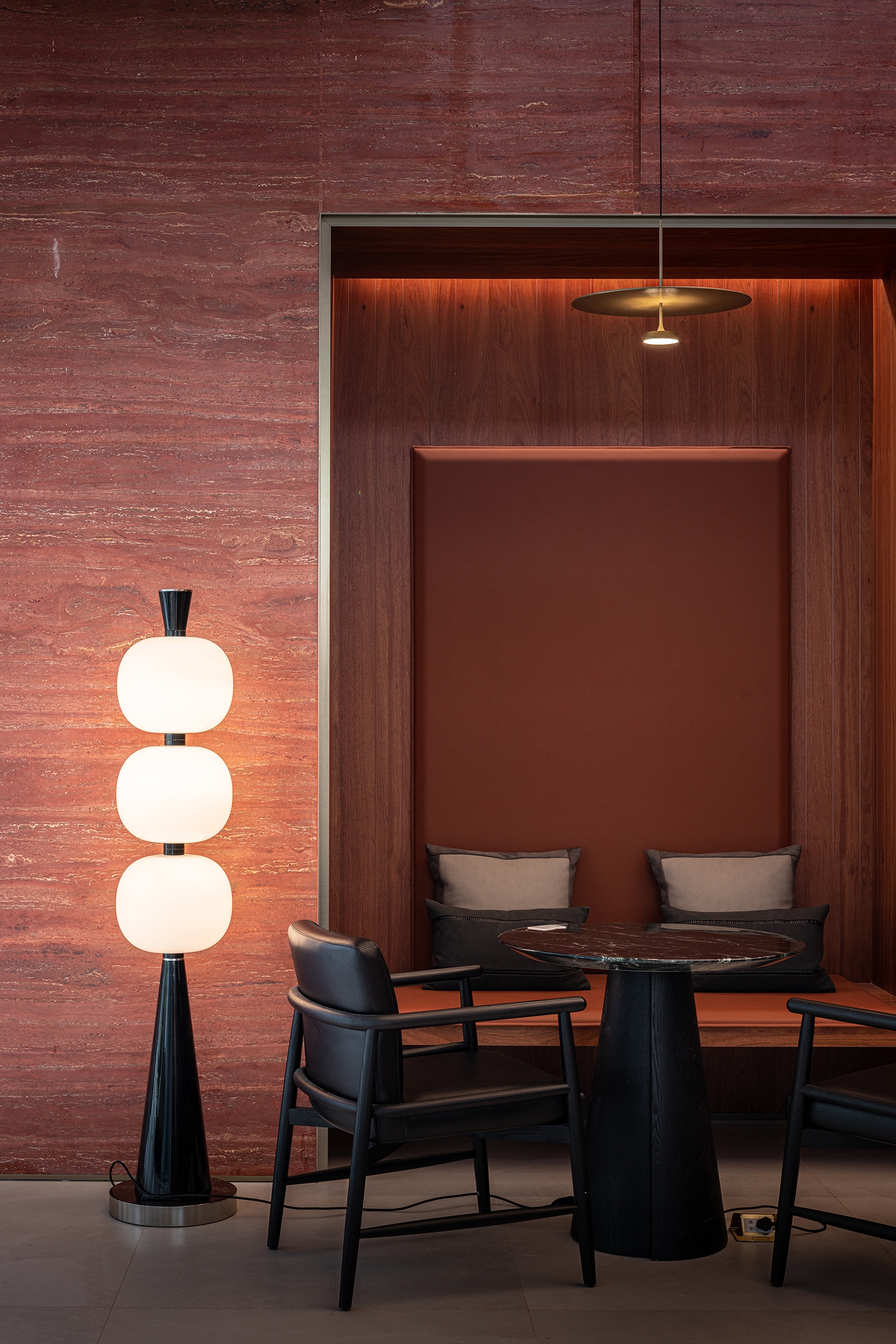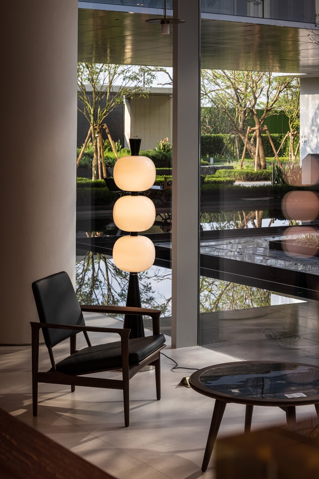 We use metal and creamy white glass to show the shape of Tang Hulu, not only displaying interesting style of modern lamps but also narrowing the gap between people and objects, people and light, and people and design. We adopt step dimming based on the concept of "customize light". As for the lamp holder, we give it a triangular cone shape, which visually achieve a balance with the glass sphere on the ceiling. Despite its shape, it takes up less space and becomes unobtrusive.
