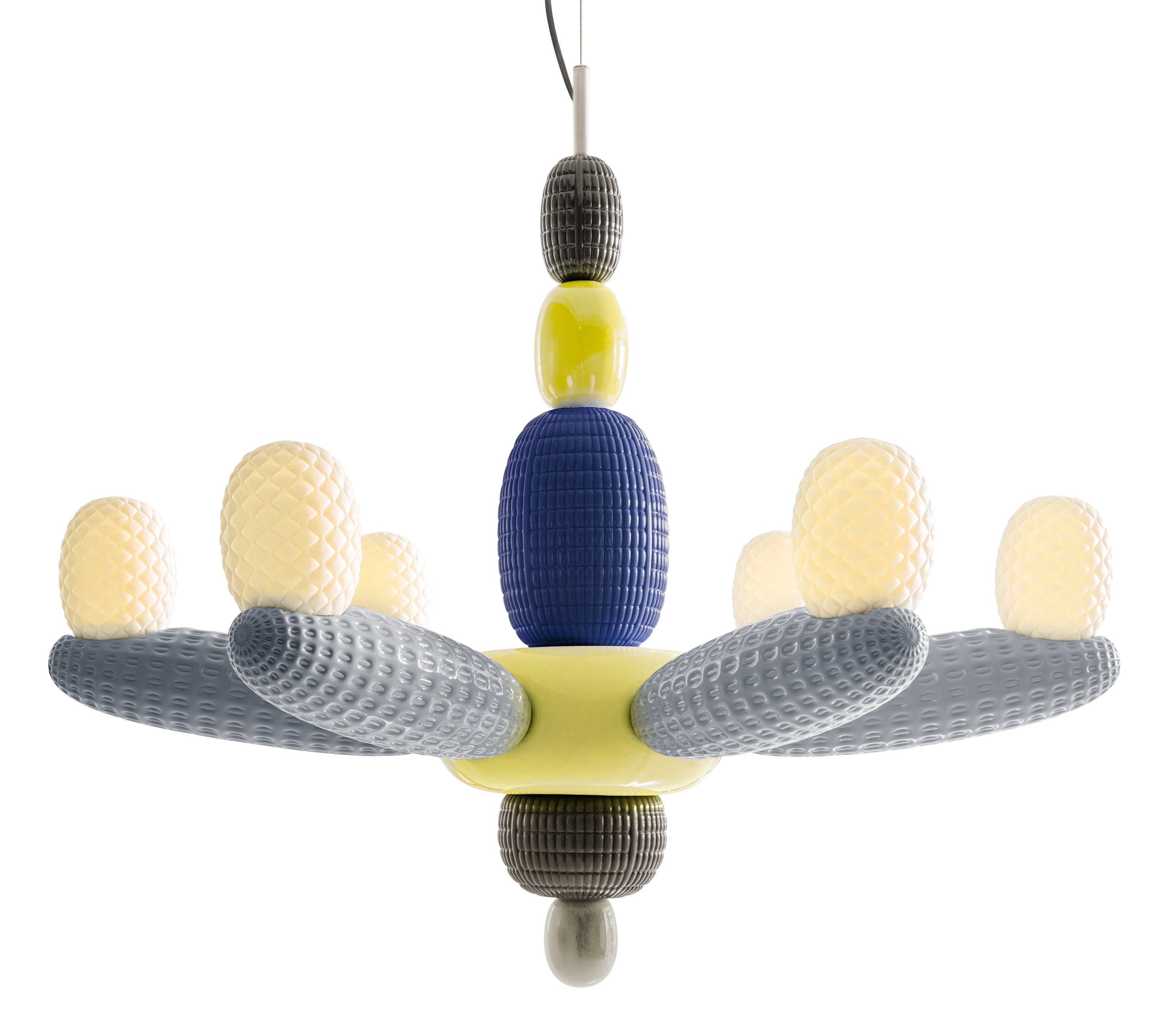The collection comprises two key pieces: the Afloat chandelier and the Airbloom table lamp. Both pieces draw inspiration from the convivial spirit of balmy, sunny days and the colorful, intricate creations of street performers. The Afloat chandelier features a central body with six modules, each adorned with globe shades crafted from translucent white porcelain. Similarly, the Airbloom table lamp consists of a white central lampshade made of translucent hand-ornamented porcelain, accompanied by a series of modules available in three color ranges in a glossy finish.