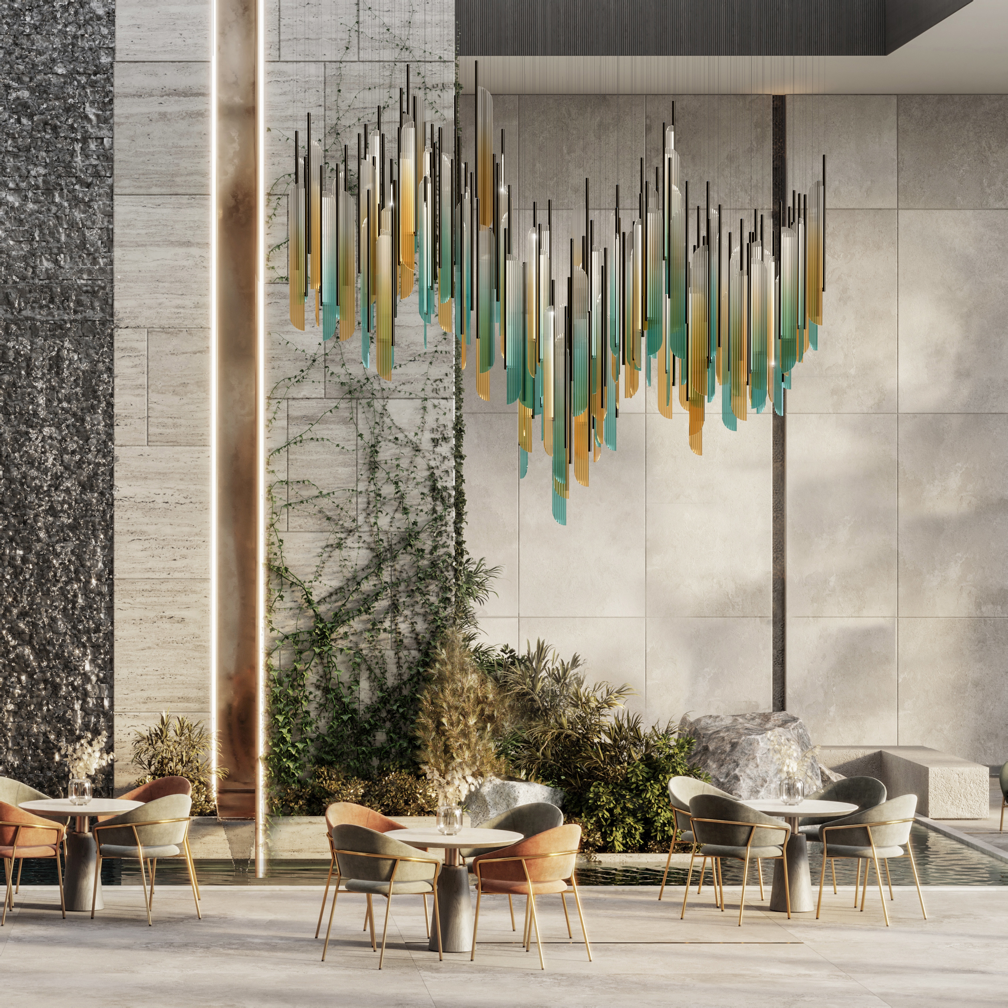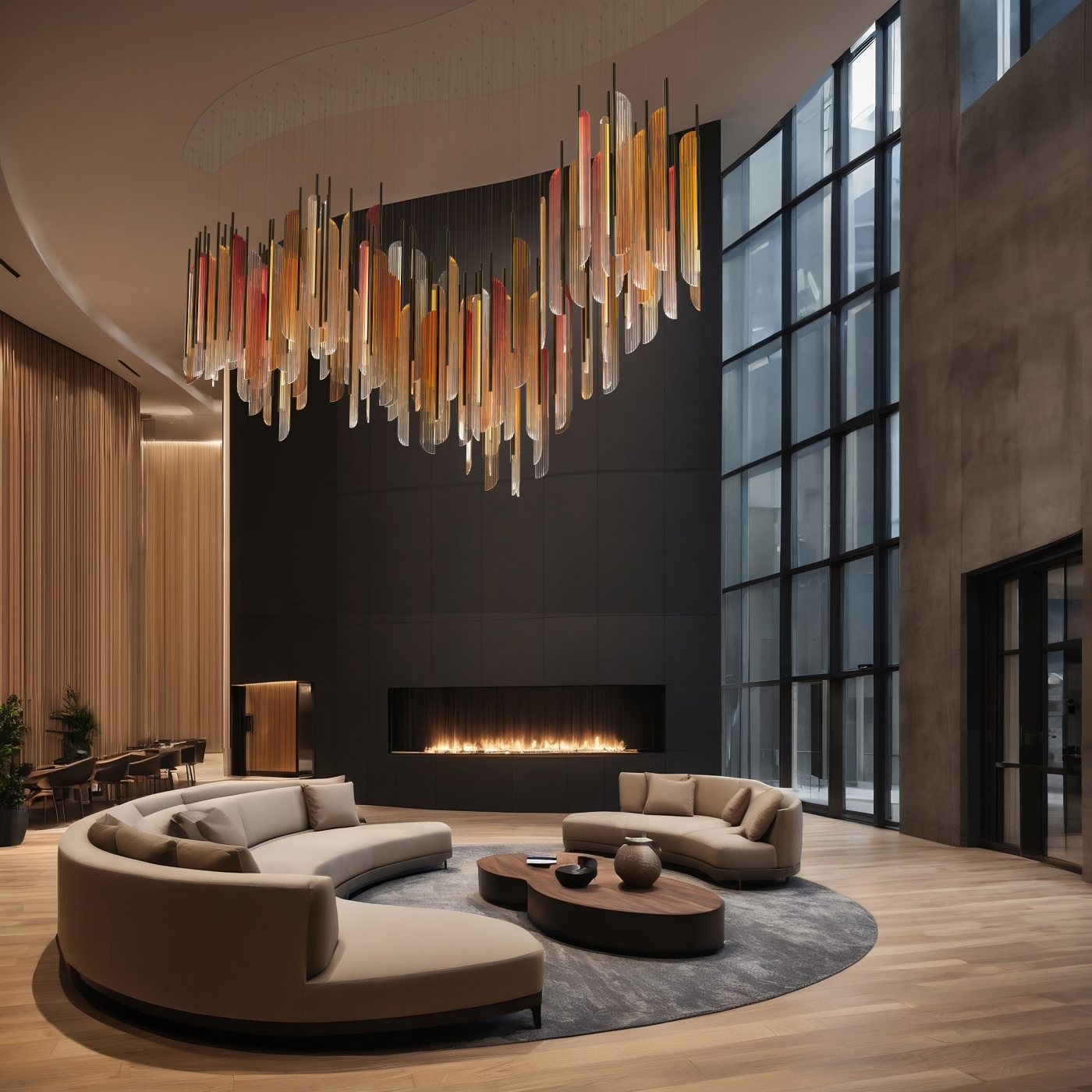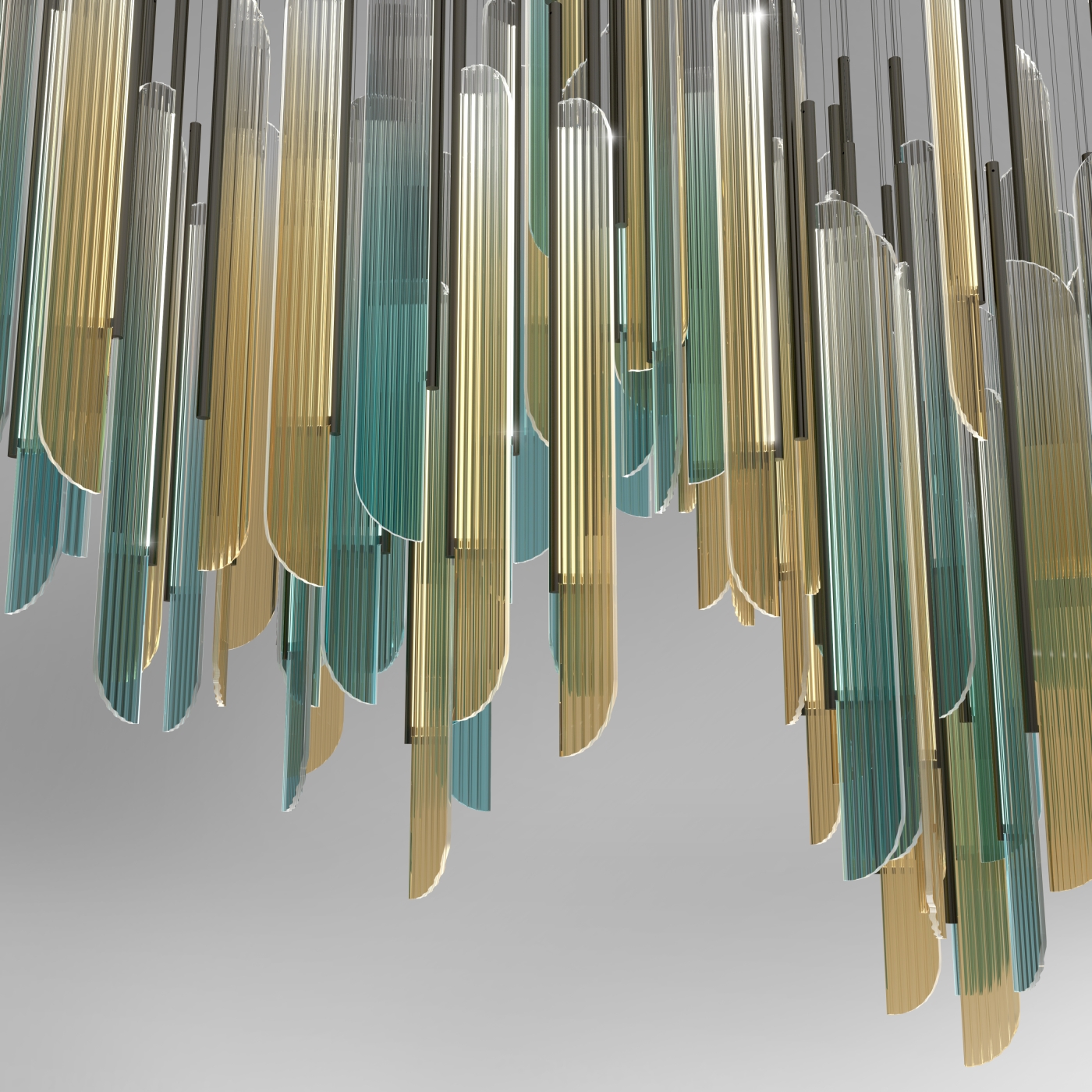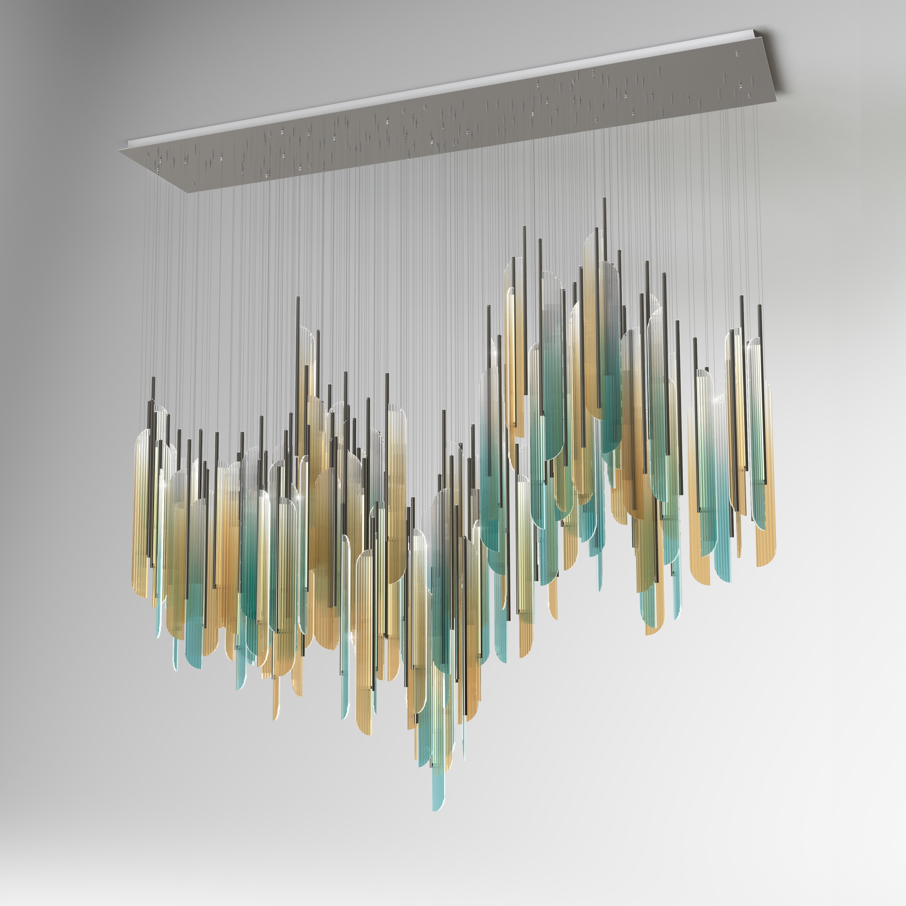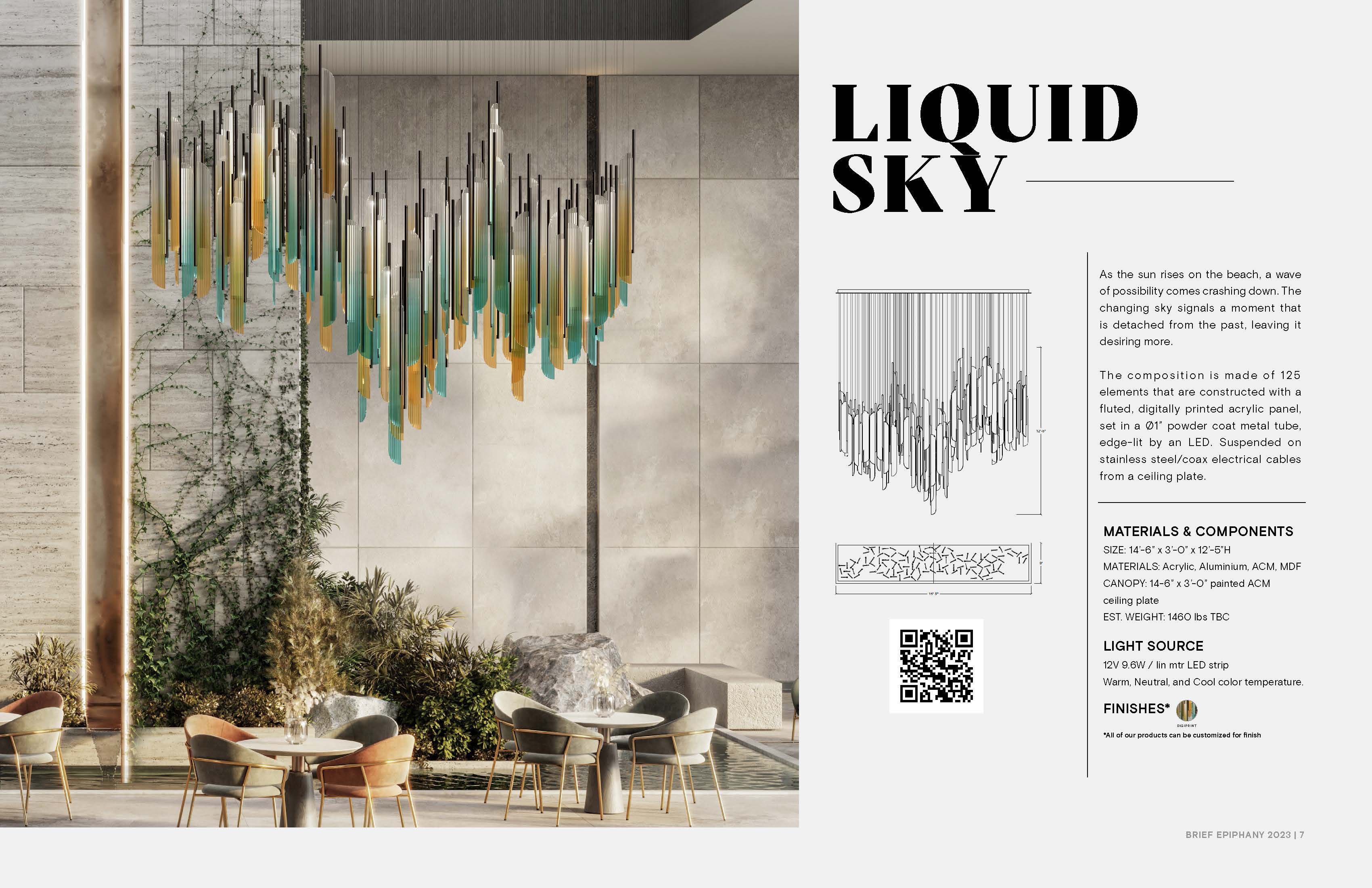 Entry DescriptionAs the sun rises on the beach, a wave of possibility come crashing down. The changing sky signals a moment that is detached from the past, leaving it desiring more. This custom light fixture is fabricated with 125 elements of fluted, digitally printed acrylic panels set in ø1” satin black powder coat metal tubes edge-lit by an LED light strip. Individually, the element embodies simplicity and elegance in its original form. However, when multiplied and arranged in various orientations, it transforms into a cluster with uniquely captivating shapes, radiating vibrant colors and an enchanting glow. This cluster ignites curiosity and wonder, inviting observers to explore its mesmerizing intricacies further.