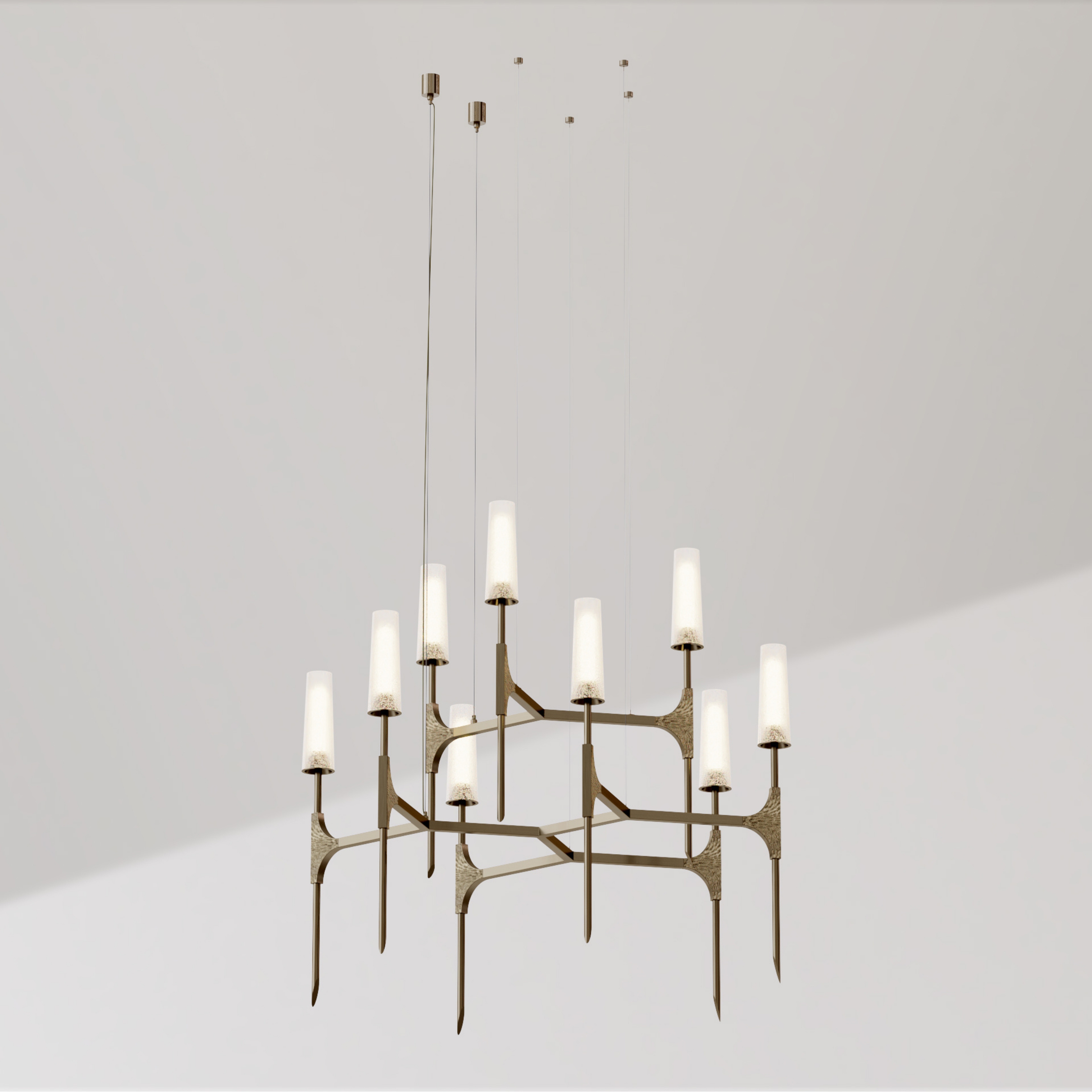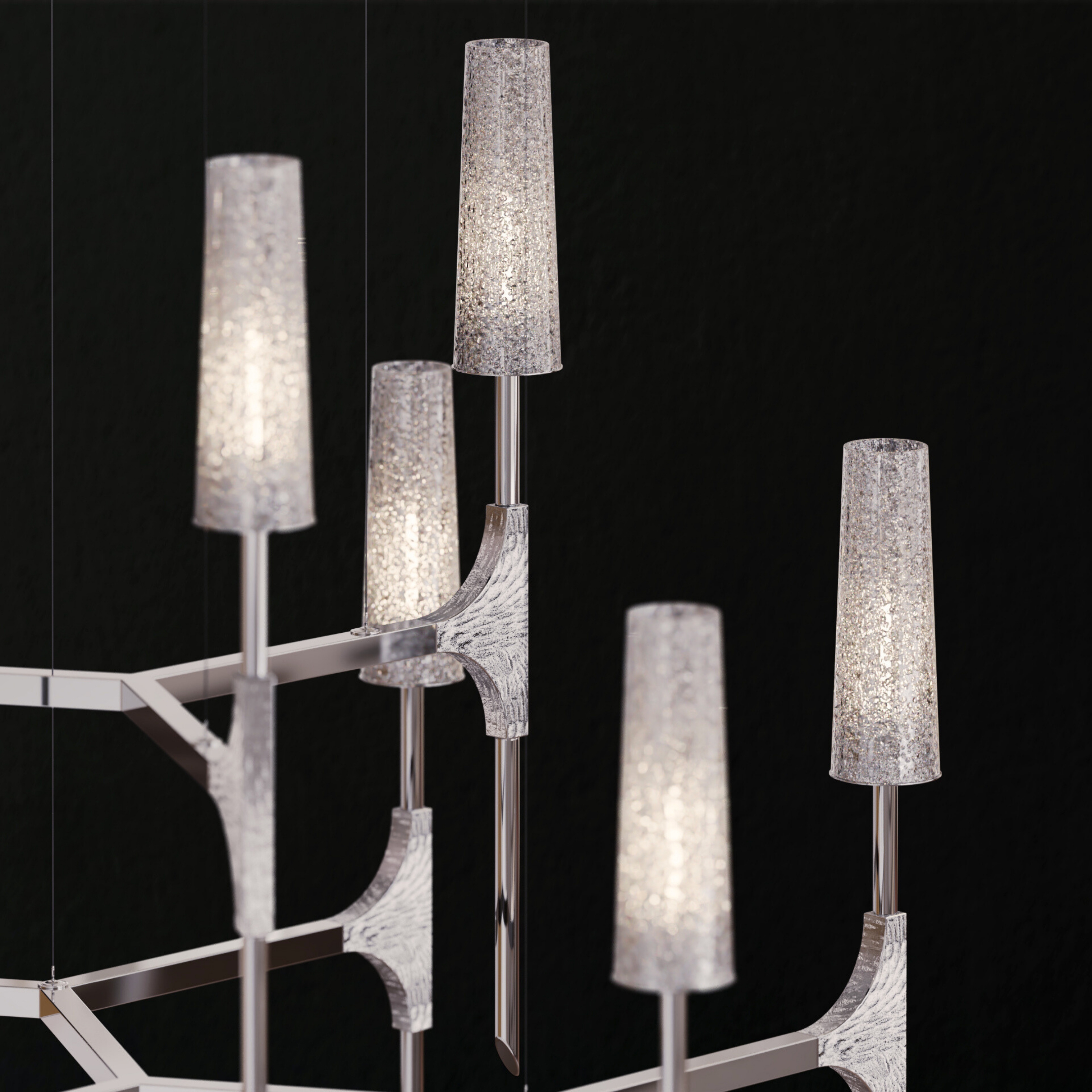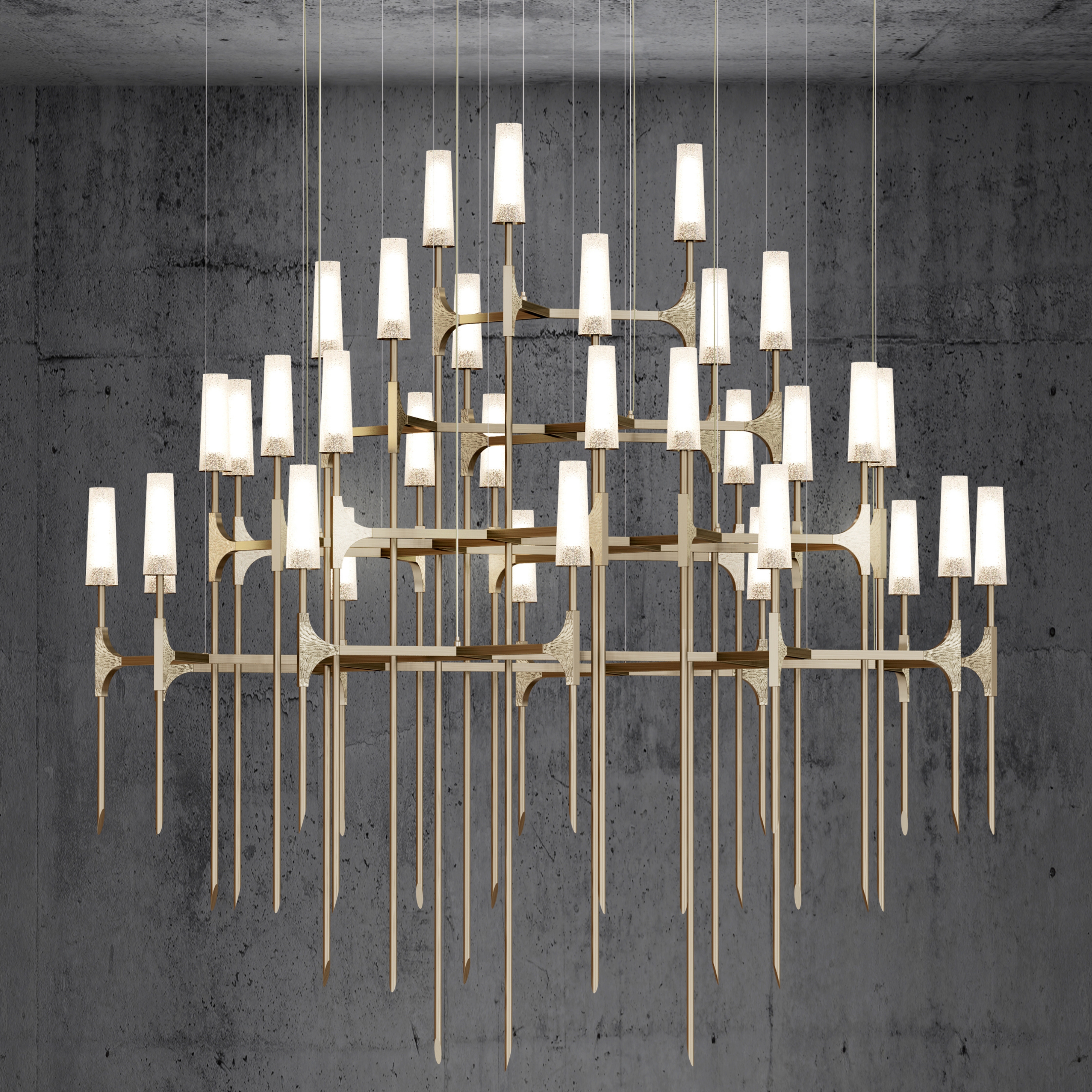 Torch was developed using layers that resemble snow crystals, in line with the Studio's philosophy of customizable and replicable design. The initial structure starts with a three-arm base, expanding and multiplying into four layers. This design offers versatility, making it suitable for a wide range of spaces, from small areas to large, high-ceilinged rooms.