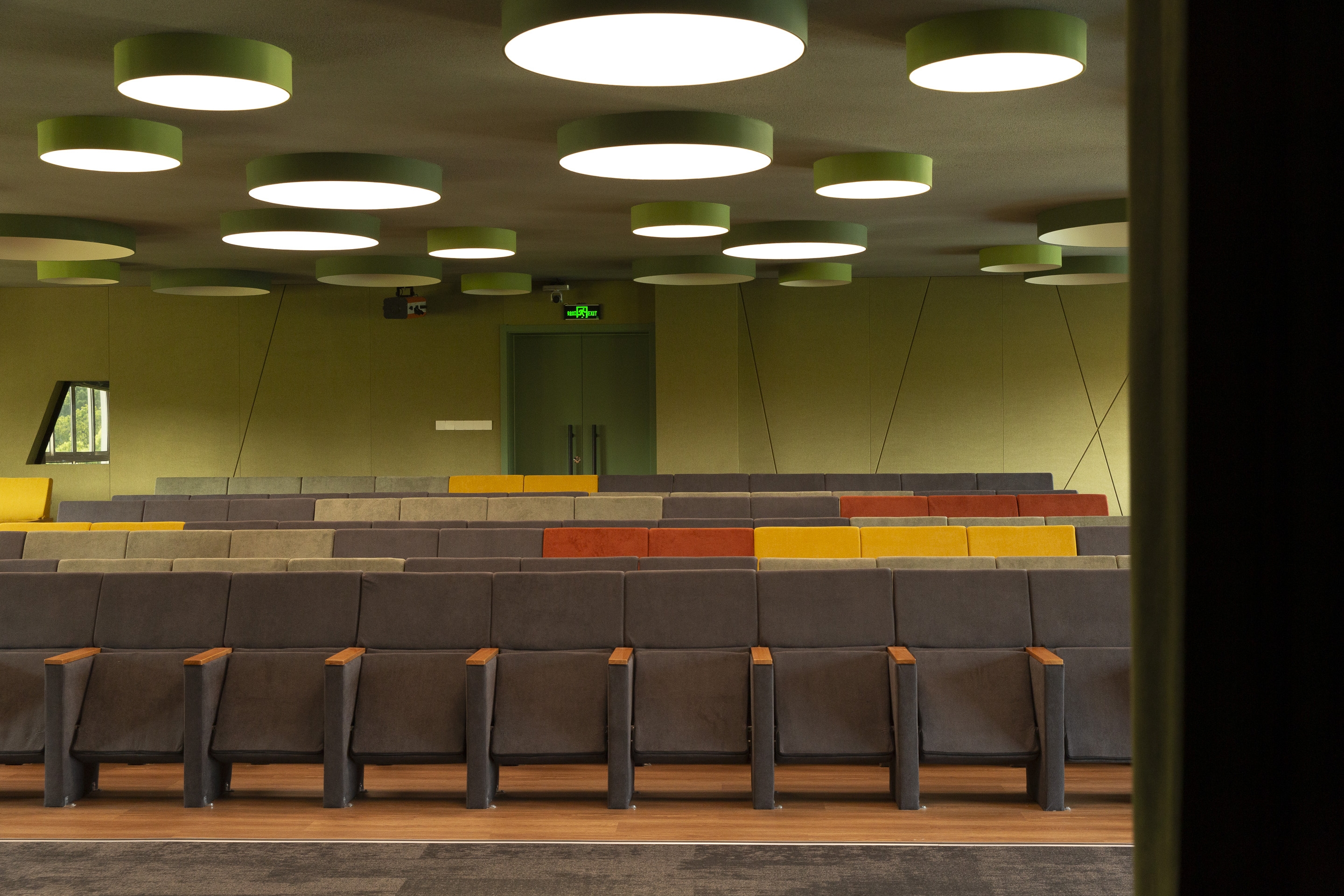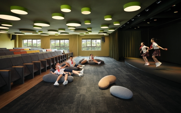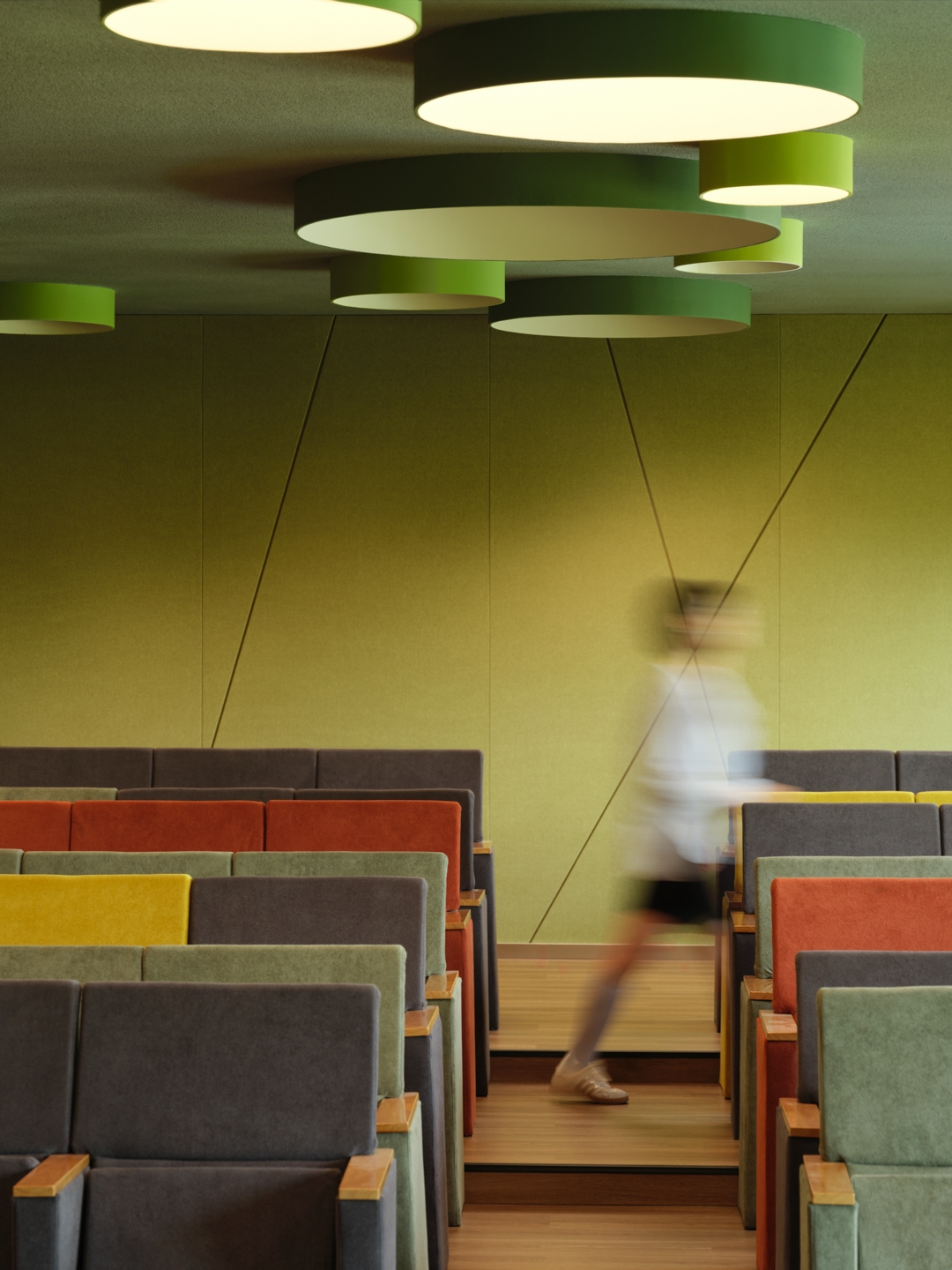 Sustainability ApproachThe lecture hall at Zhuyuan Elementary School merges sustainability with thoughtful design, creating an acoustically superior and visually dynamic space. Sustainability is integrated into every aspect, emphasizing the circular economy, energy efficiency, and eco-friendly materials.