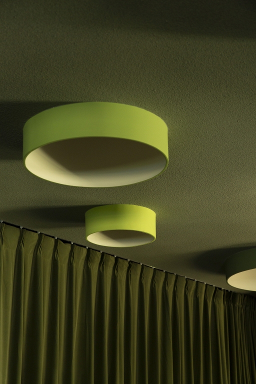 Structurally, we have weakened the serious and rigid form of the original building's main beam ceiling, allowing circular slice tube lights to be arranged in an orderly manner on the ceiling. Looking up not only expands the space of imagination but also forms the rhythm of the bamboo language in sound. The hard package sound-absorbing material on the wall is cut into a beam shape by lines, and it is matched with the warm orange and yellow on the back of the chair, making the space atmosphere lively and stable.