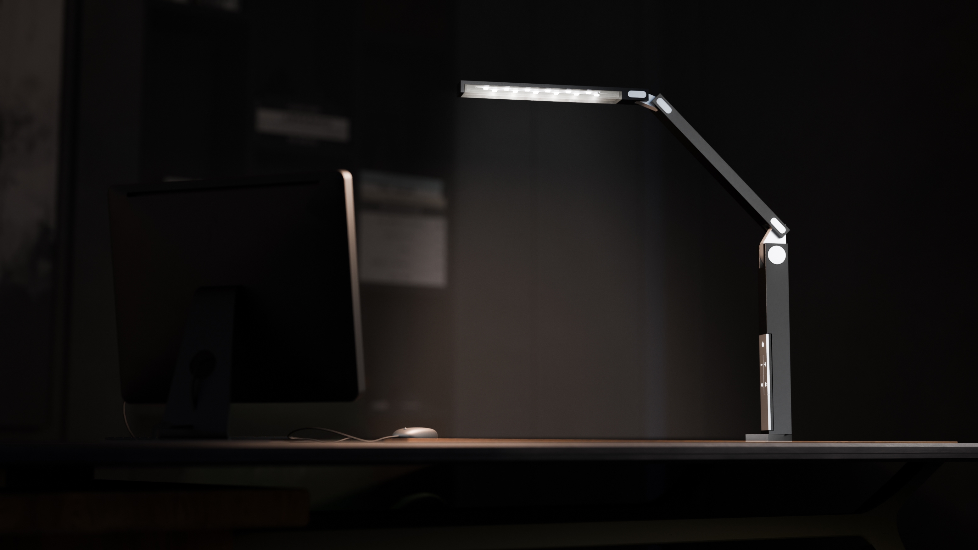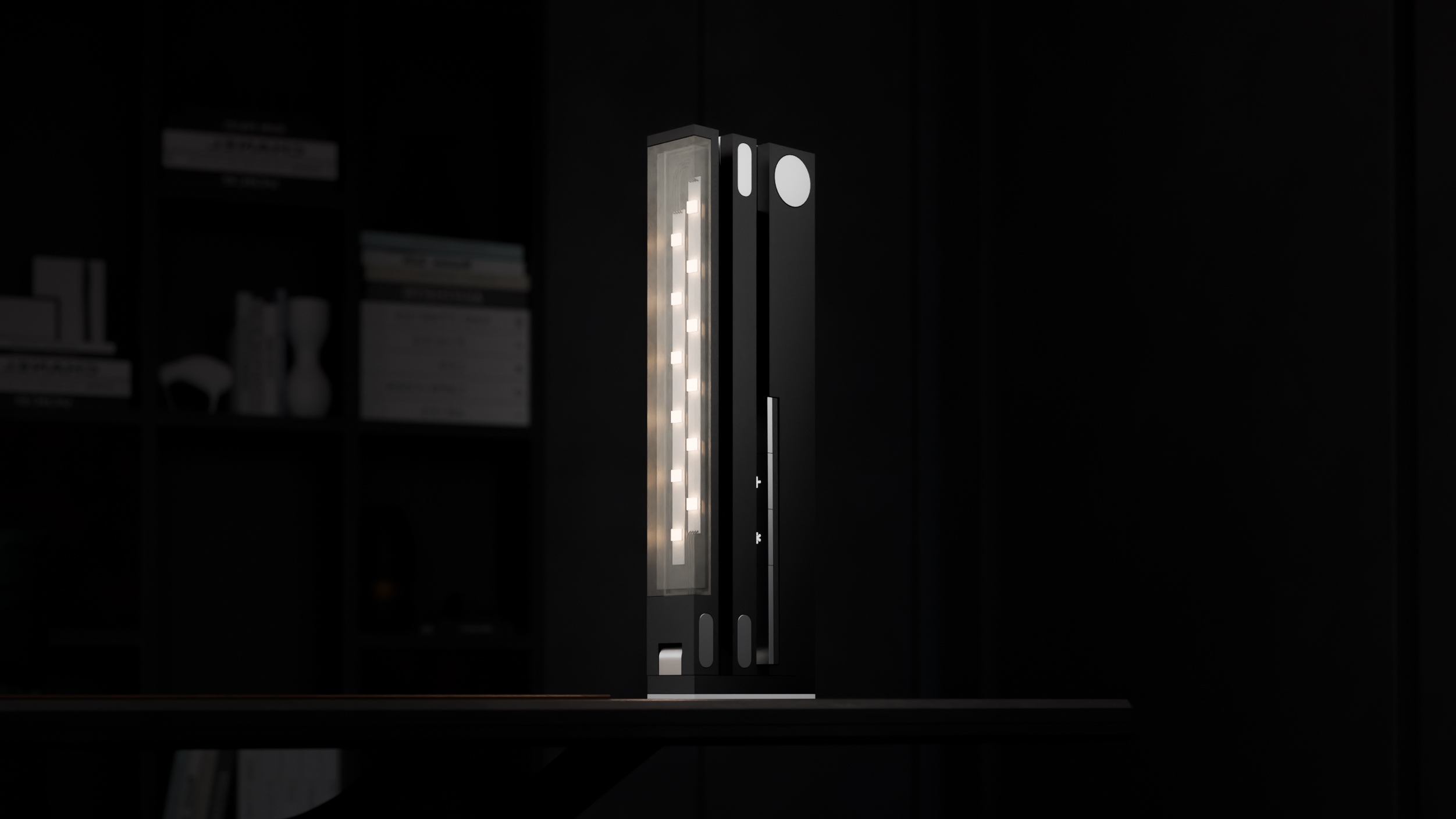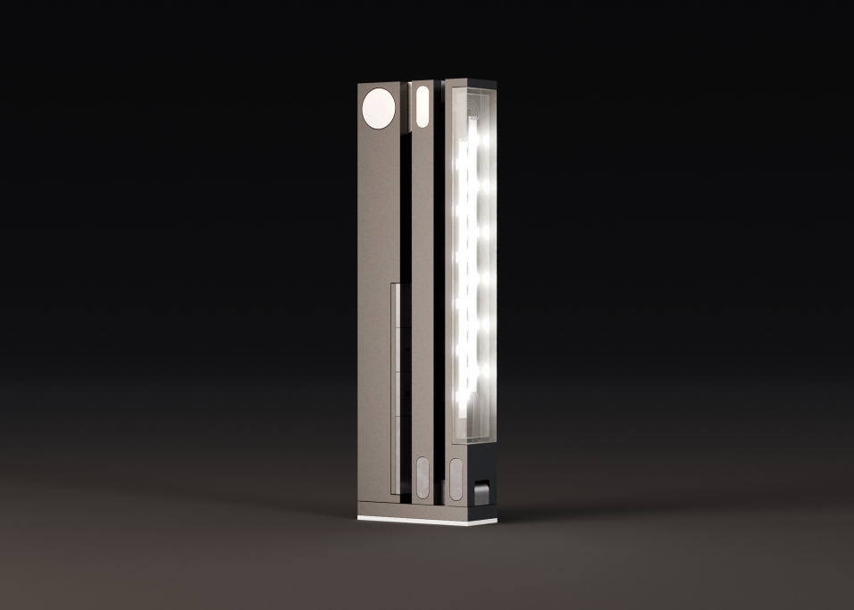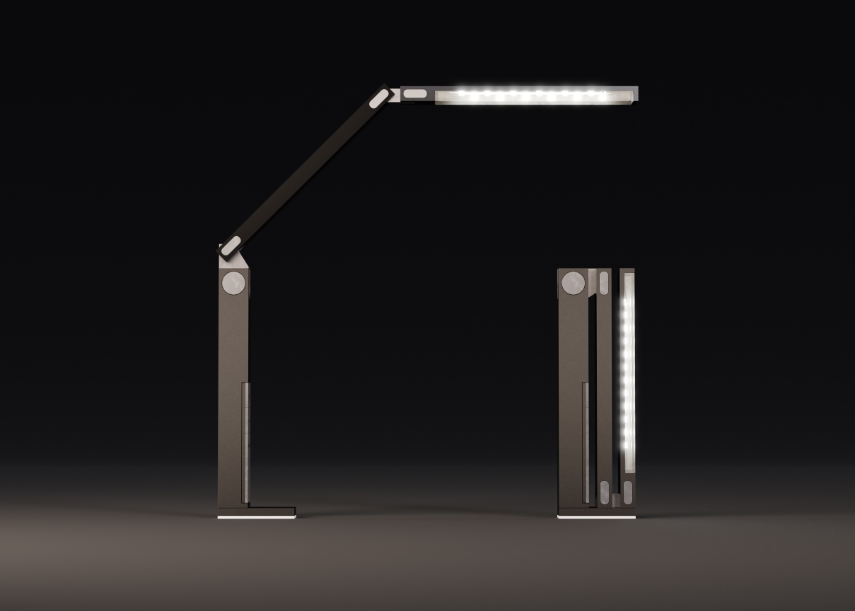 Lumin is an ultra-compact desk lamp that offers improved functionality and maximum space utilization. Unlike traditional desk lamps with large, bulky bases and location limiting clamps, LUMIN can be placed anywhere on a desk top thanks to its counterweight and adhesive system. The lamp’s articulating design offers the ultimate in user customization based on the task at hand. The lamp can extend to a max 36” when straight up or extend 24” out in any direction from the base. When combined with its 11” diffused LED array, LUMIN provides ample light across the work surface. Users can adjust the light’s brightness and temperature to fit individual needs and preferences. The controls for the lights are built into the base of the lamp but can be taken off and used as a wireless remote for changing settings conveniently. When work is done, users can fold LUMIN neatly away, reducing its size to 1.5” x 4” x 12”. LUMIN’s space-conscience design meets the need for a lamp that doesn’t interfere with a busy work surface, especially for tasks or projects that require large work areas. With its compact storage, LUMIN also helps users easily transition smaller or multi-functioning workspaces for a different purpose, such as a remote worker whose desk turns dining table by the end of the day. LUMIN is the versatile and functional solution to the demands of today’s working environments.