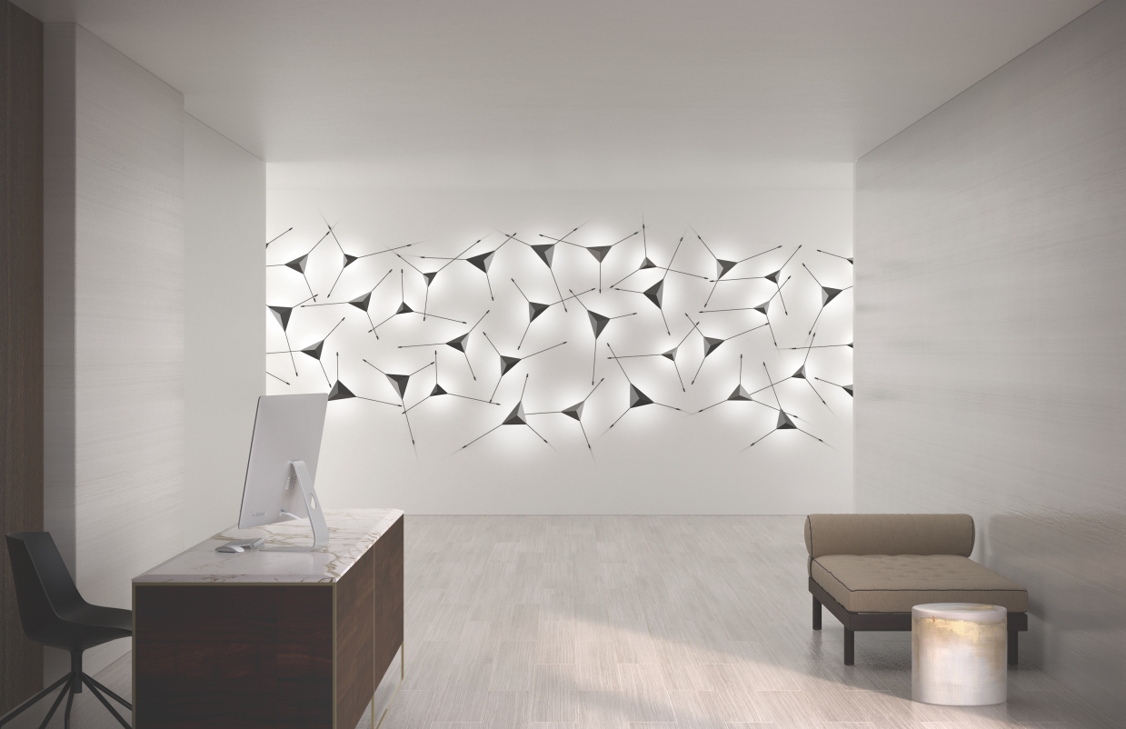 Abstract’s indirect LED illumination is reflected on a wall or ceiling from a prism-shaped reflector that hovers over the surface on thin carbon fiber rods, extended in tension from each of the three triangular corners. Available in three sizes, the prism-shaped aluminum reflectors are held to the light engine by magnets for ease of placement and cleaning. This work of modern lighting art can be composed in any configuration, imagined in multiples or used singularly for dramatic and powerful architectural statements of three-dimensional art.