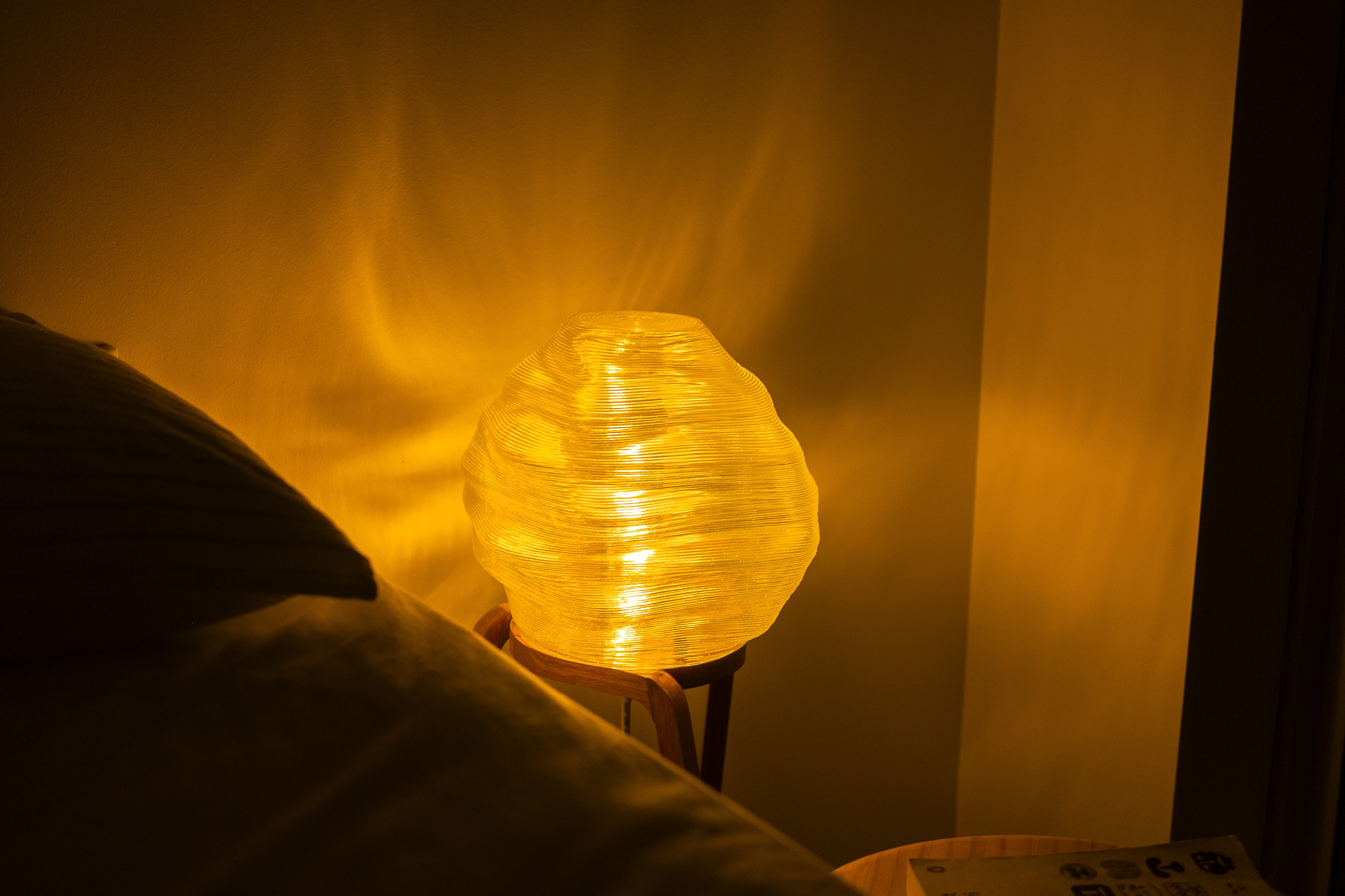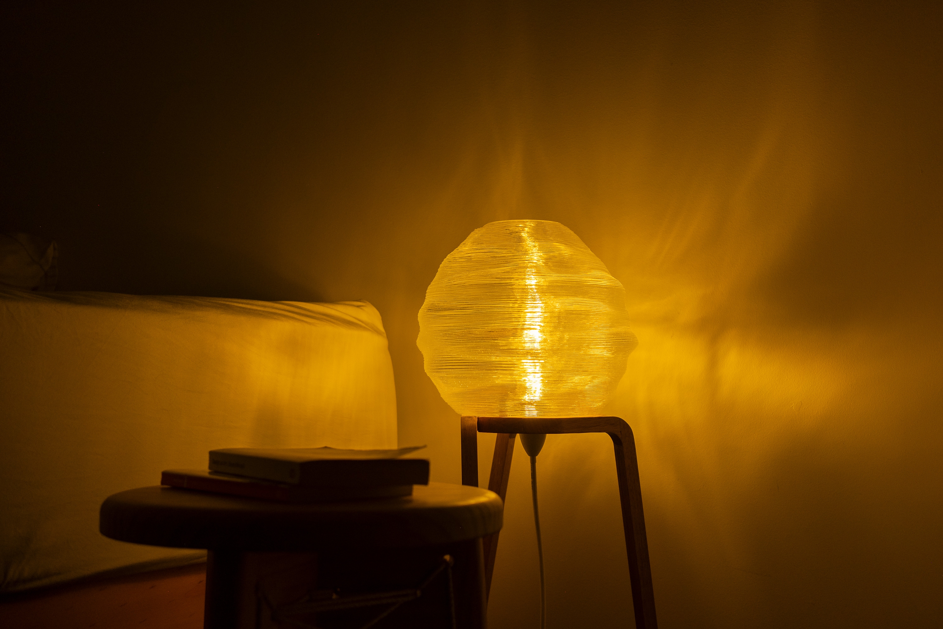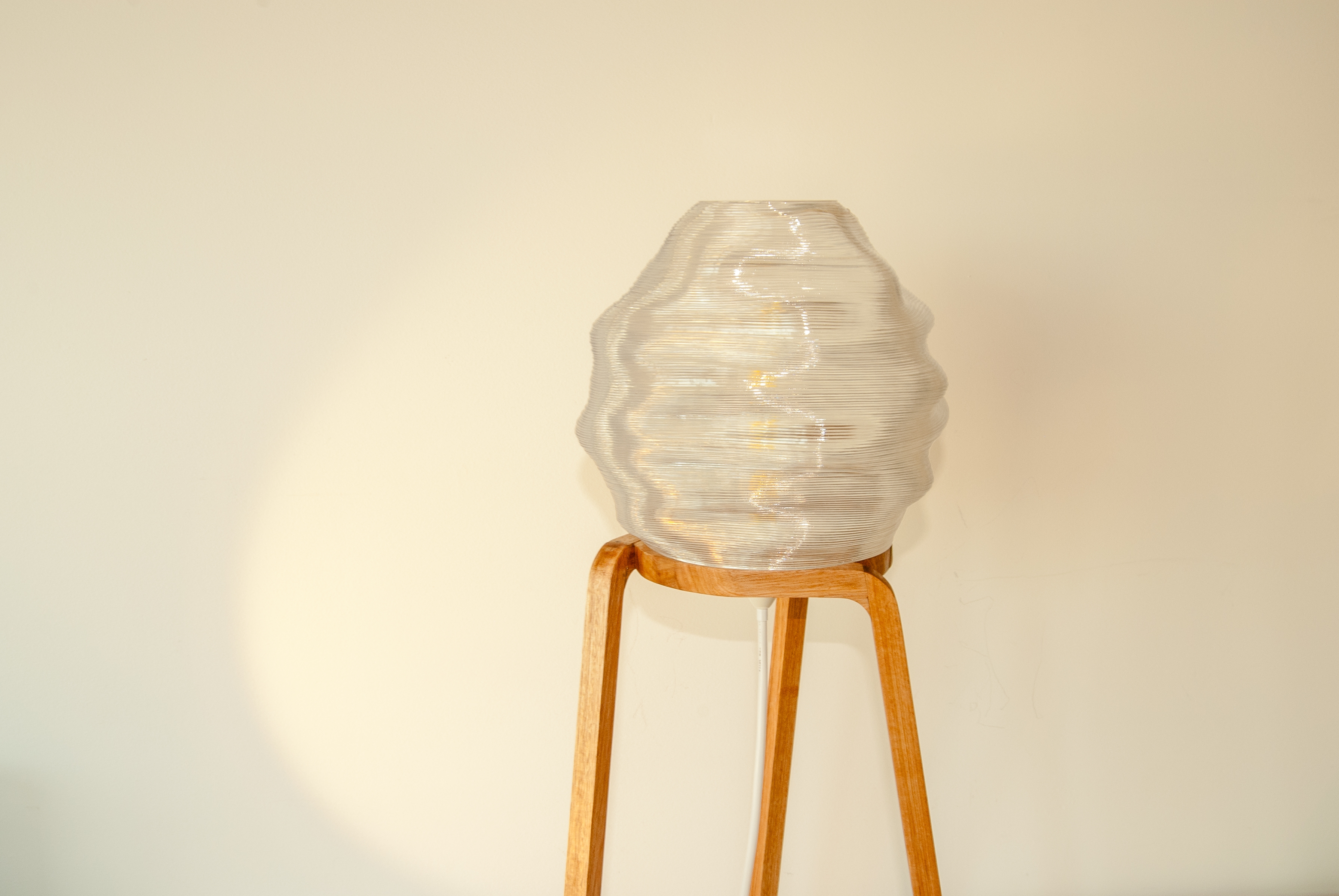 The form of the light diffuser is a reflection of the unique properties of the manufacturing process. The robotic FDM printer has a thick nozzle, resulting in layer heights of 2.5mm as opposed to traditional FDM printer layer heights of around 0.1-0.4mm. Thus, there is a focus on featuring and highlighting horizontal patterns to better leverage the aesthetic qualities of the thick layers consequential to the unique manufacturing process, and thus create a product that is visually and conceptually cohesive.