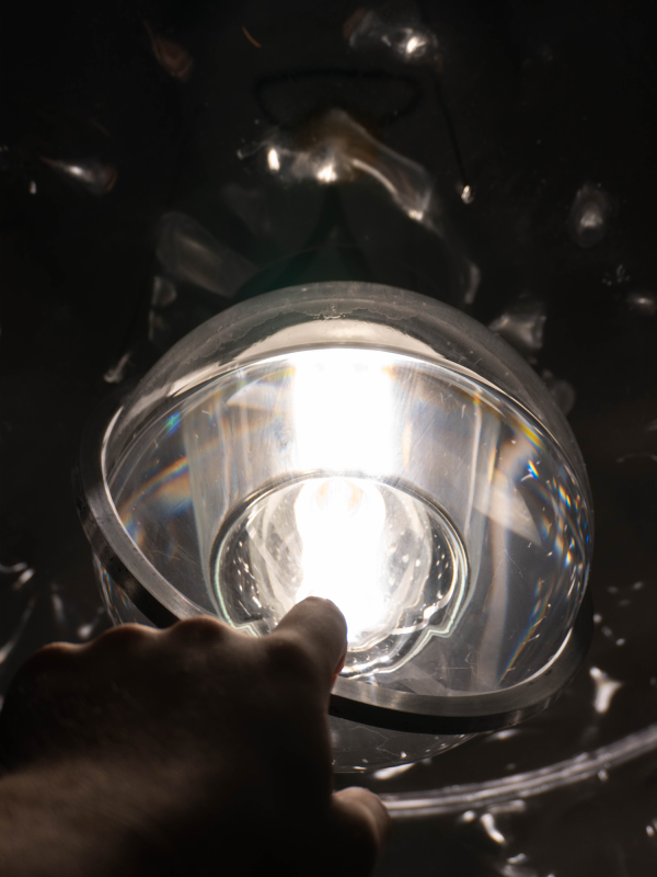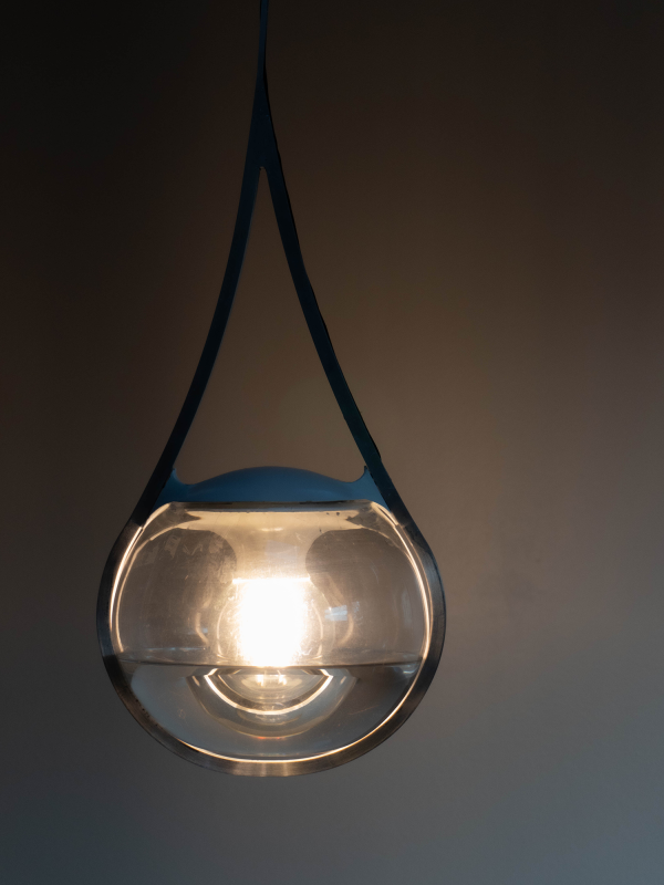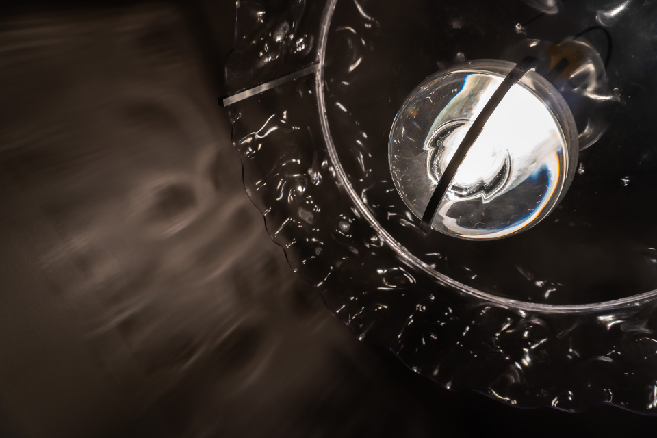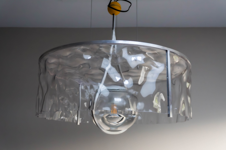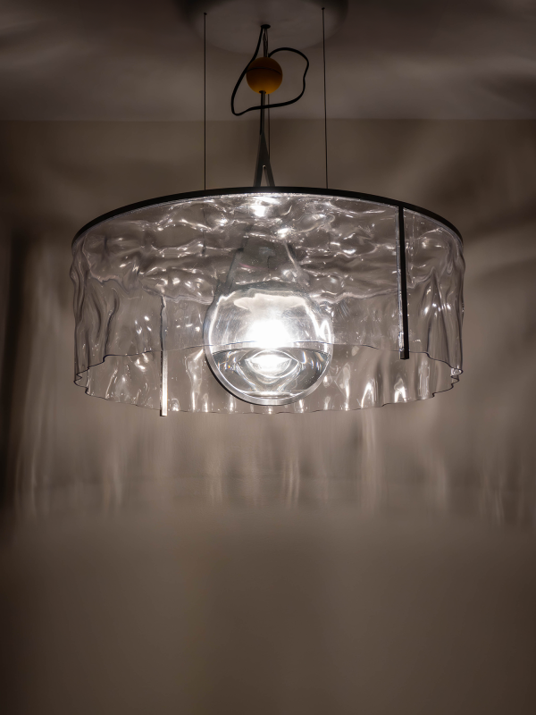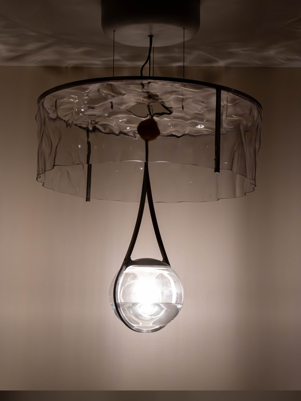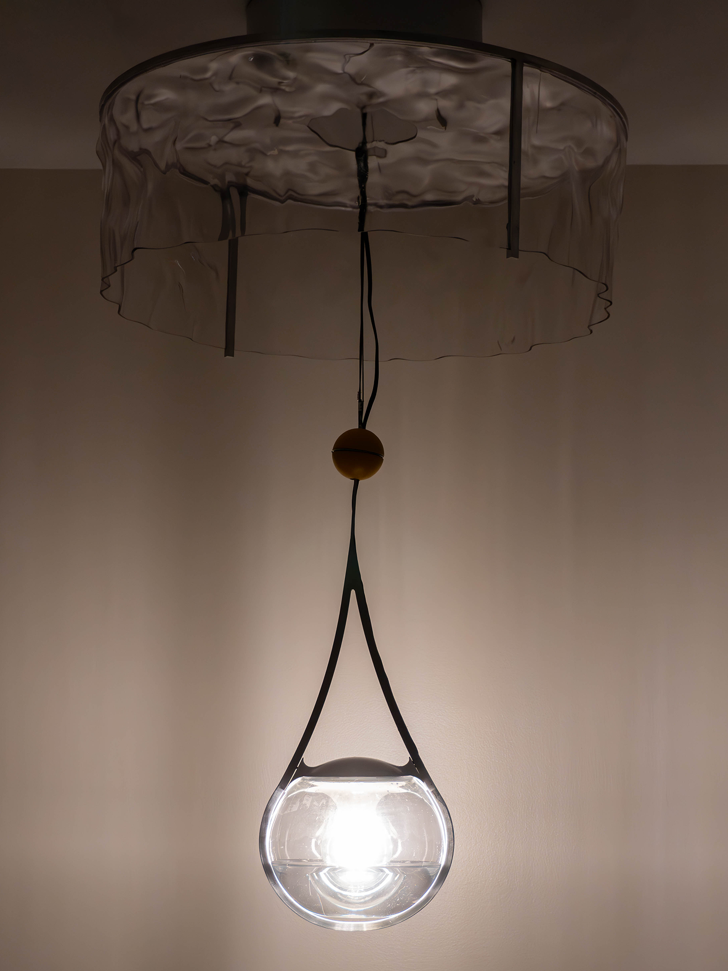 To return to a regular ambient light, simply pull down upon the handle integrated into the aluminum teardrop, and the hidden pulley system will once again morph the light. The light source pulls away from the shade as the caustic patterns drift upwards to return later once more.