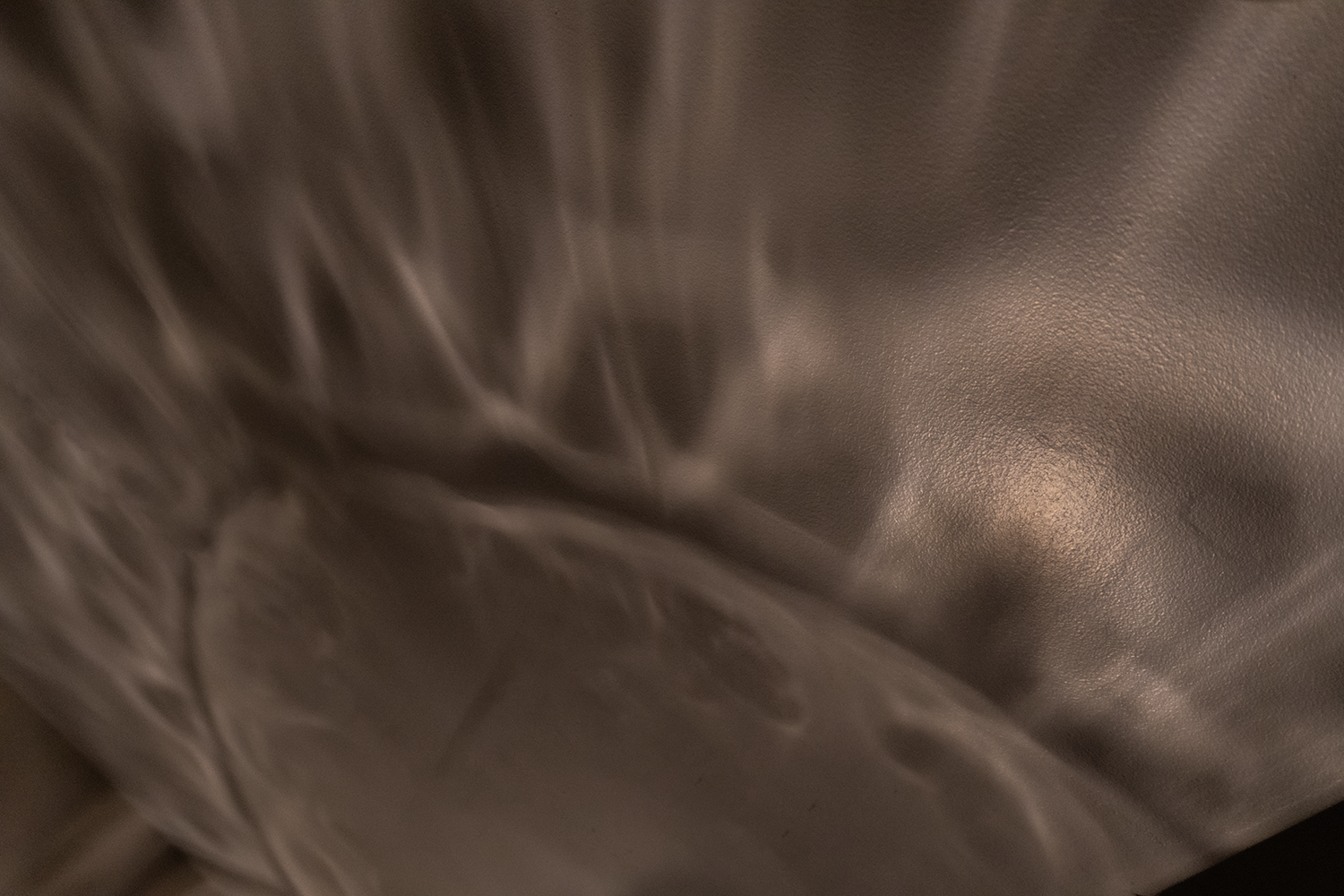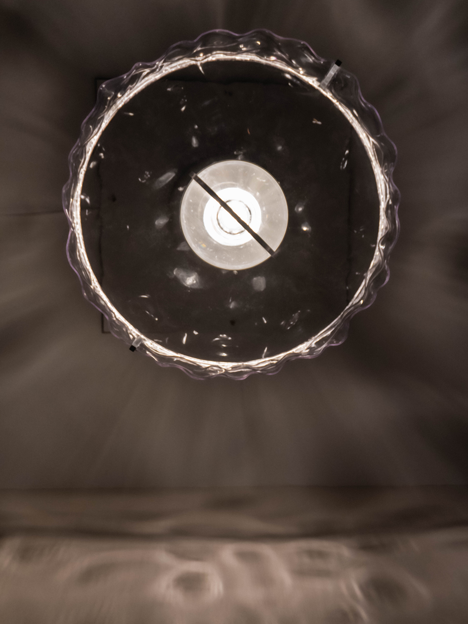 But within all of this is a feature unlike any other chandelier. With a push up on the bottom of the light, the entire light fixture begins to shift and move. Utilizing the hidden pulley system, as the light moves up, the shade falls down to meet it, and as it does, it scatters caustic rays reminiscent of those found on the ocean floor scattering across the walls and ceiling of a room, filling the room with a calming ambiance.