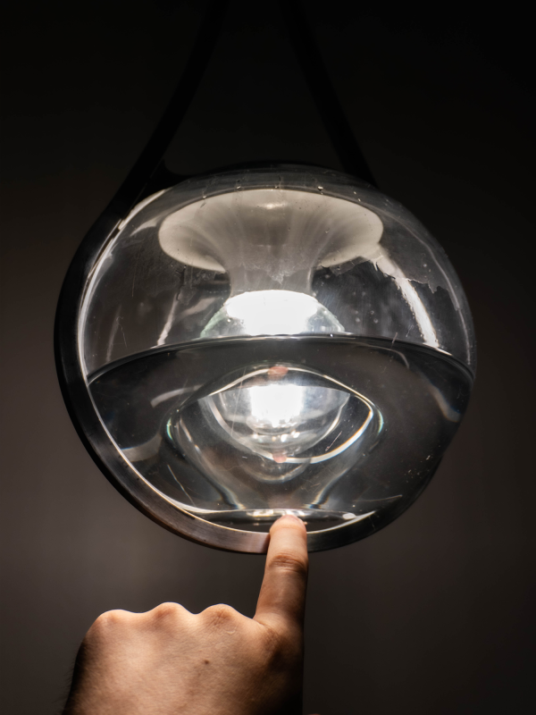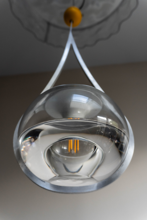 Entry DescriptionCrest is an overhead ceiling light designed for small, cozy spaces. Looking up at it, the design is minimalist yet comforting, with a cylindrical shade that shimmers like the ocean’s surface. From the center hangs a glass ball of light, held suspended within a droplet-shaped aluminum housing. Looking closer, between the outer glass shell and the lightbulb itself encapsulates a pool of real liquid, swirling around and catching the light.