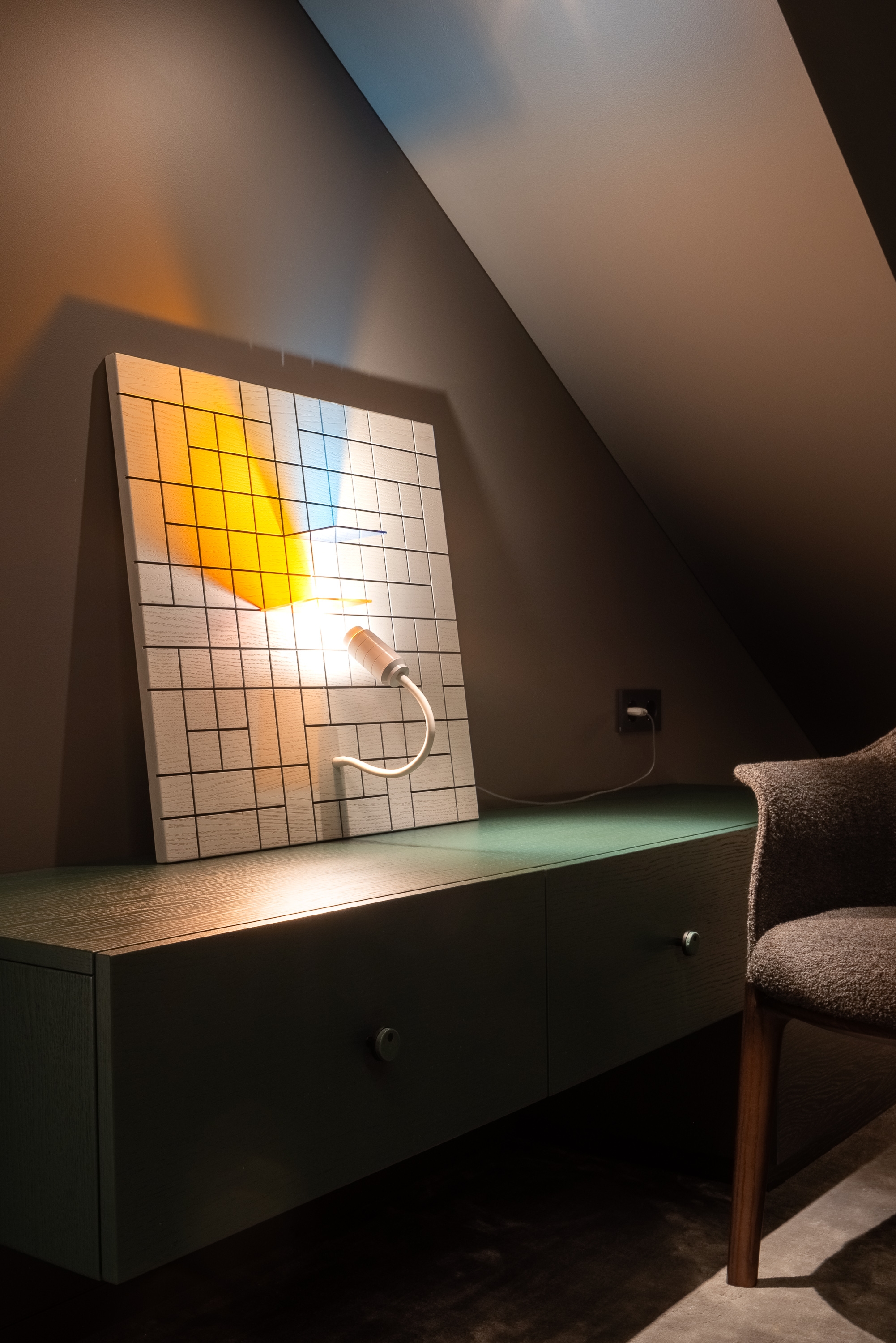 Sustainability ApproachThe base of the lamp composition is crafted from sustainable and easily recyclable materials, such as painted, milled MDF board with a wood veneer and interchangeable plexiglass parts in various colors and shapes. Although compositions can be created from many different plexiglass parts, some of them are so small in size that various plexiglass scraps can be used to make them. The light source is a flexible, narrow-angle 3000K LED lamp