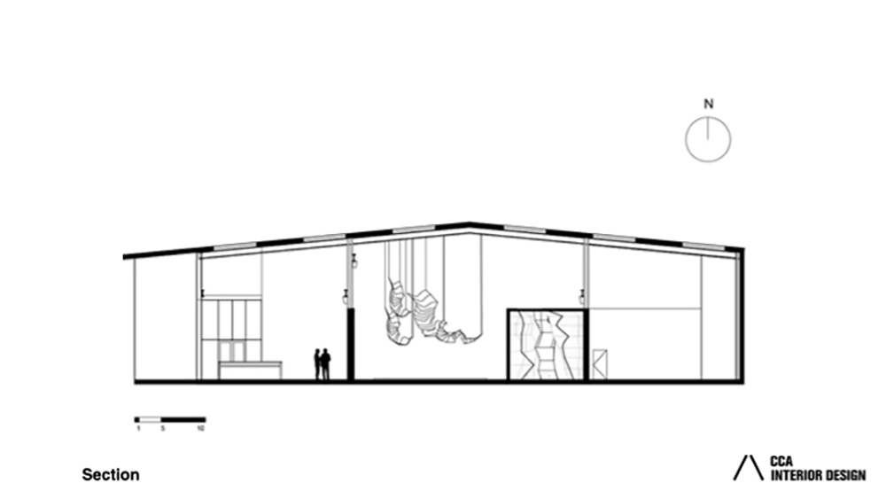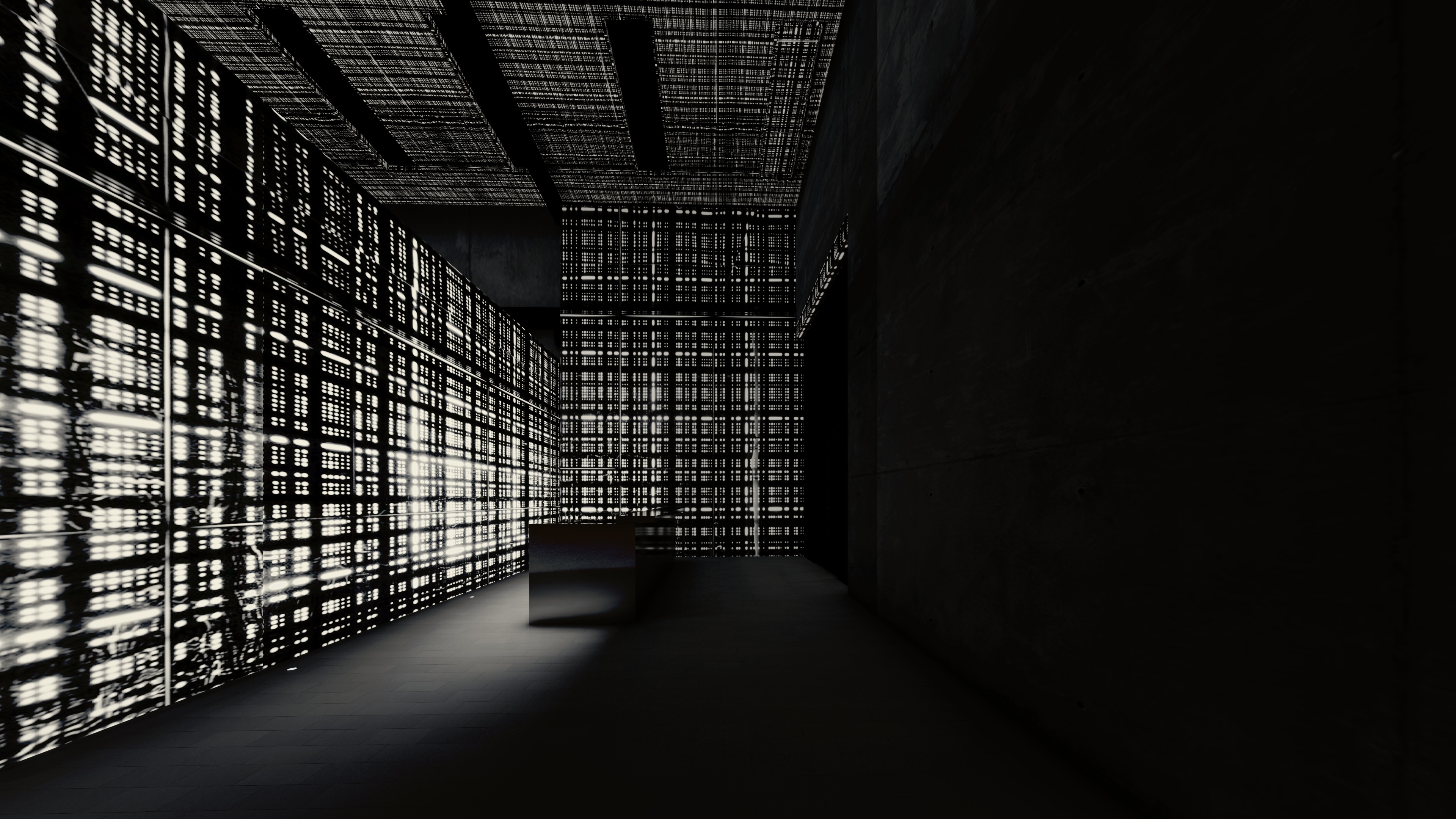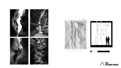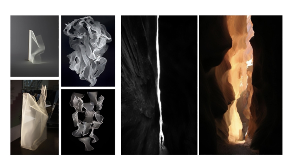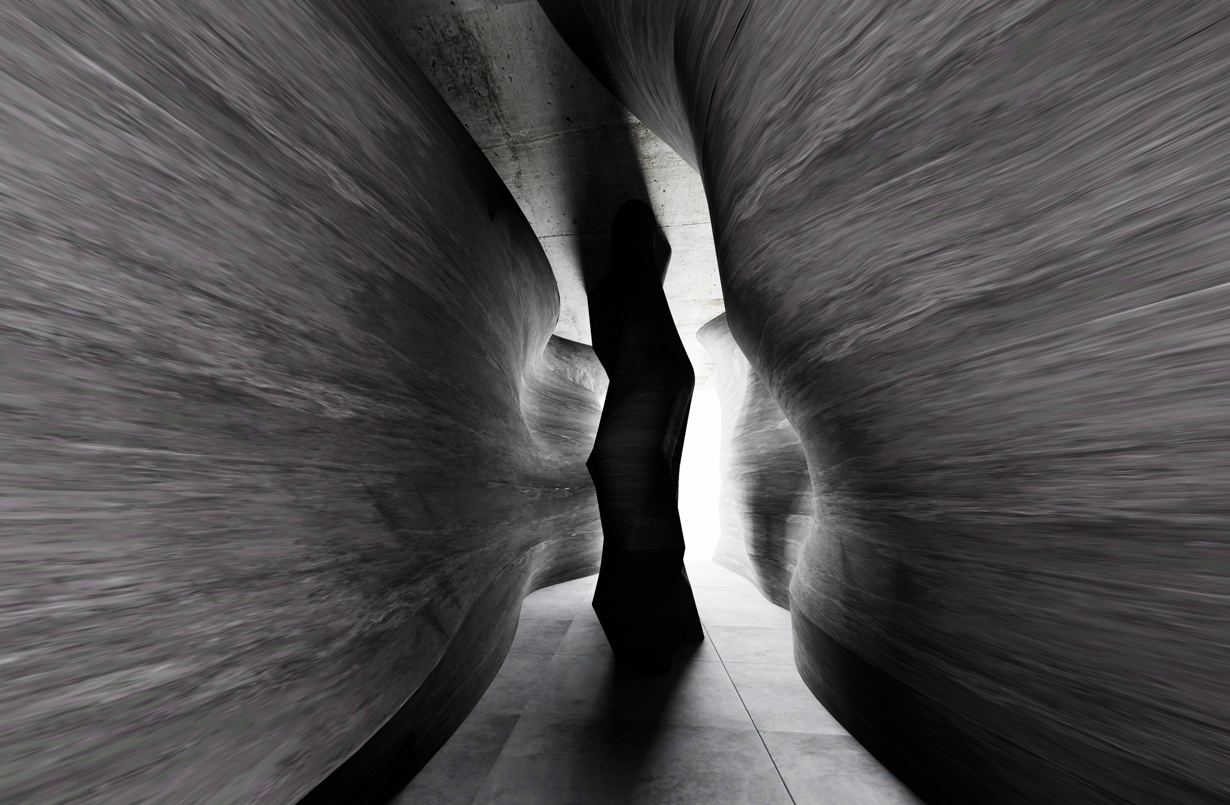 In contrast, Gallery 1 features a narrow sculptural space with dramatic lighting that evokes the grandeur of canyon landscapes. Intense, focused beams of light create sharp contrasts and deep shadows, simulating the striking interplay of light and darkness found in natural canyons.
